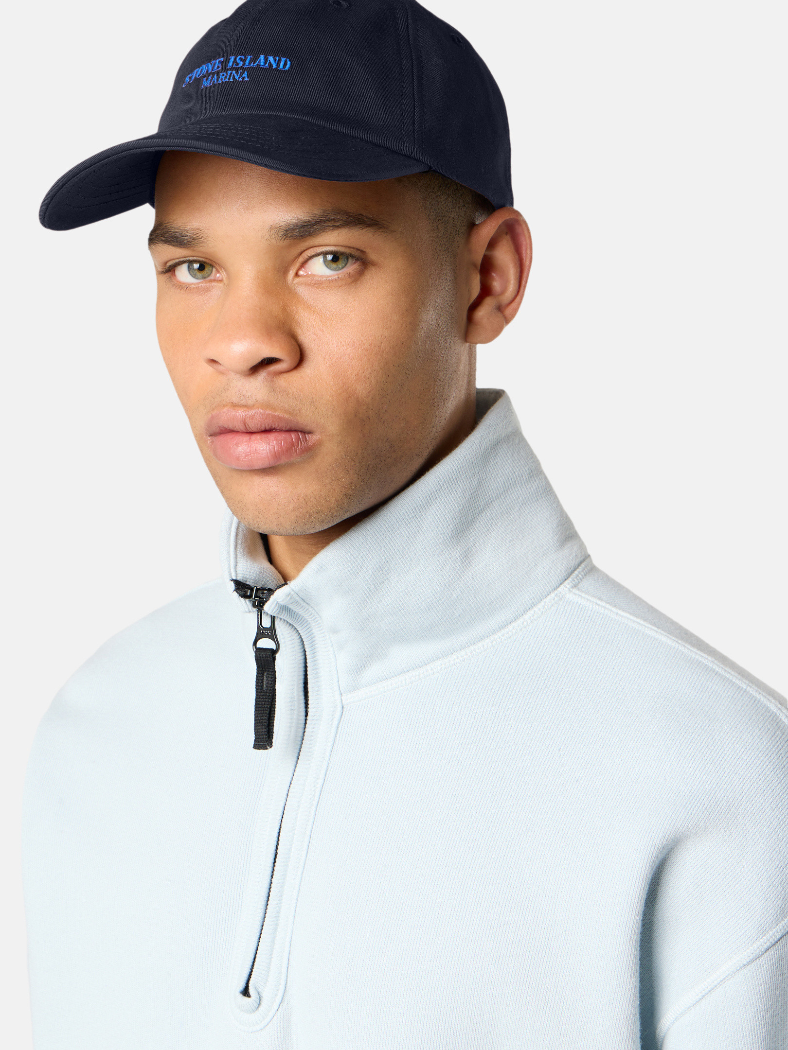 Embroidery of STOthtNE ISLthtAND Marina lettering on front. Cotton twill contour band. Adjustable strap with snaps on back.