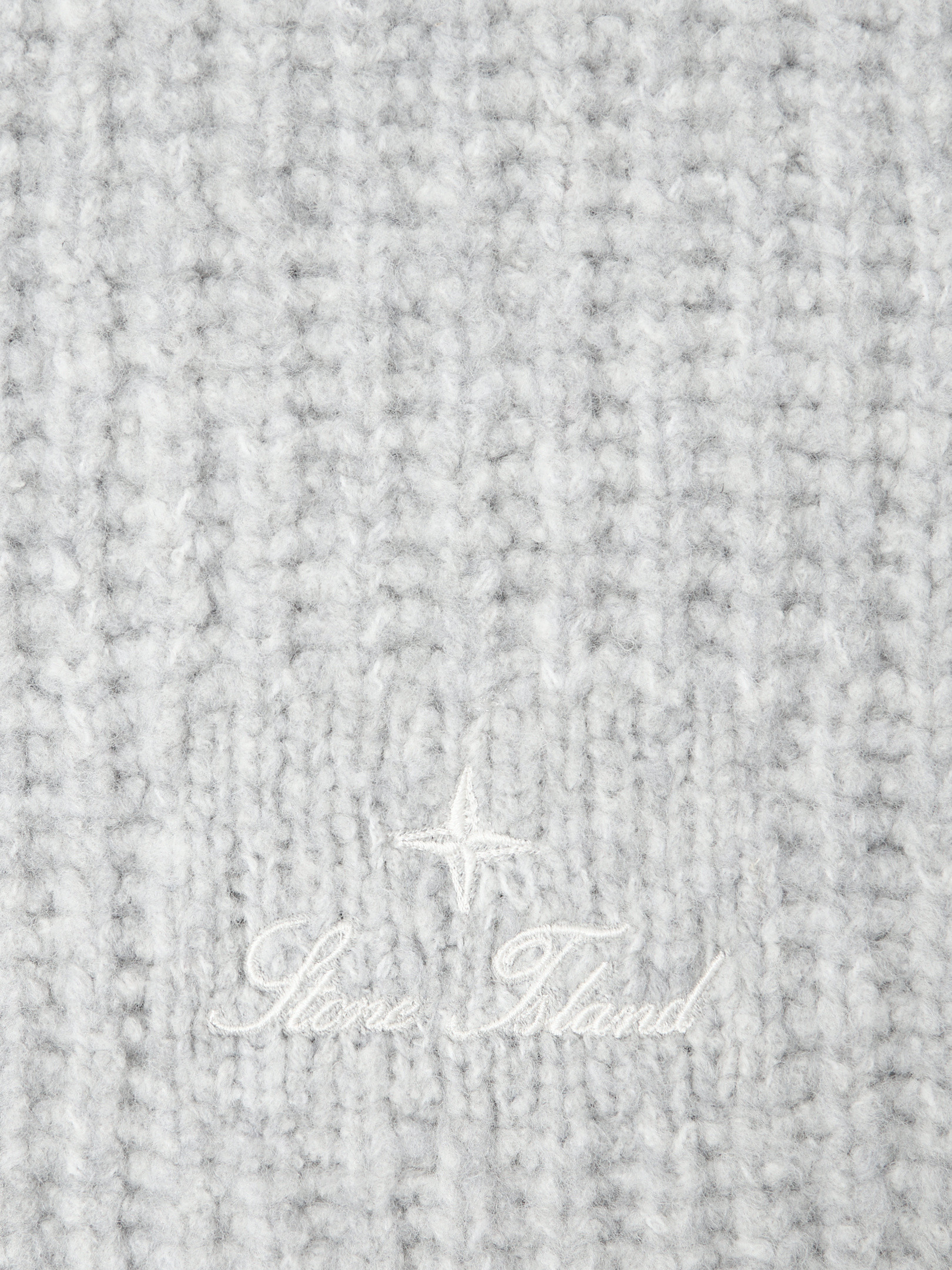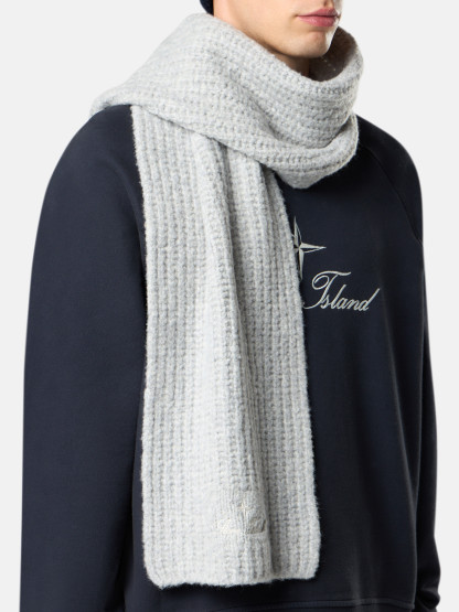 Scarf in wool nylon bouclé with fisherman’s rib, featuring an archival STOthtNE ISLthtAND logo. Gauge 3.