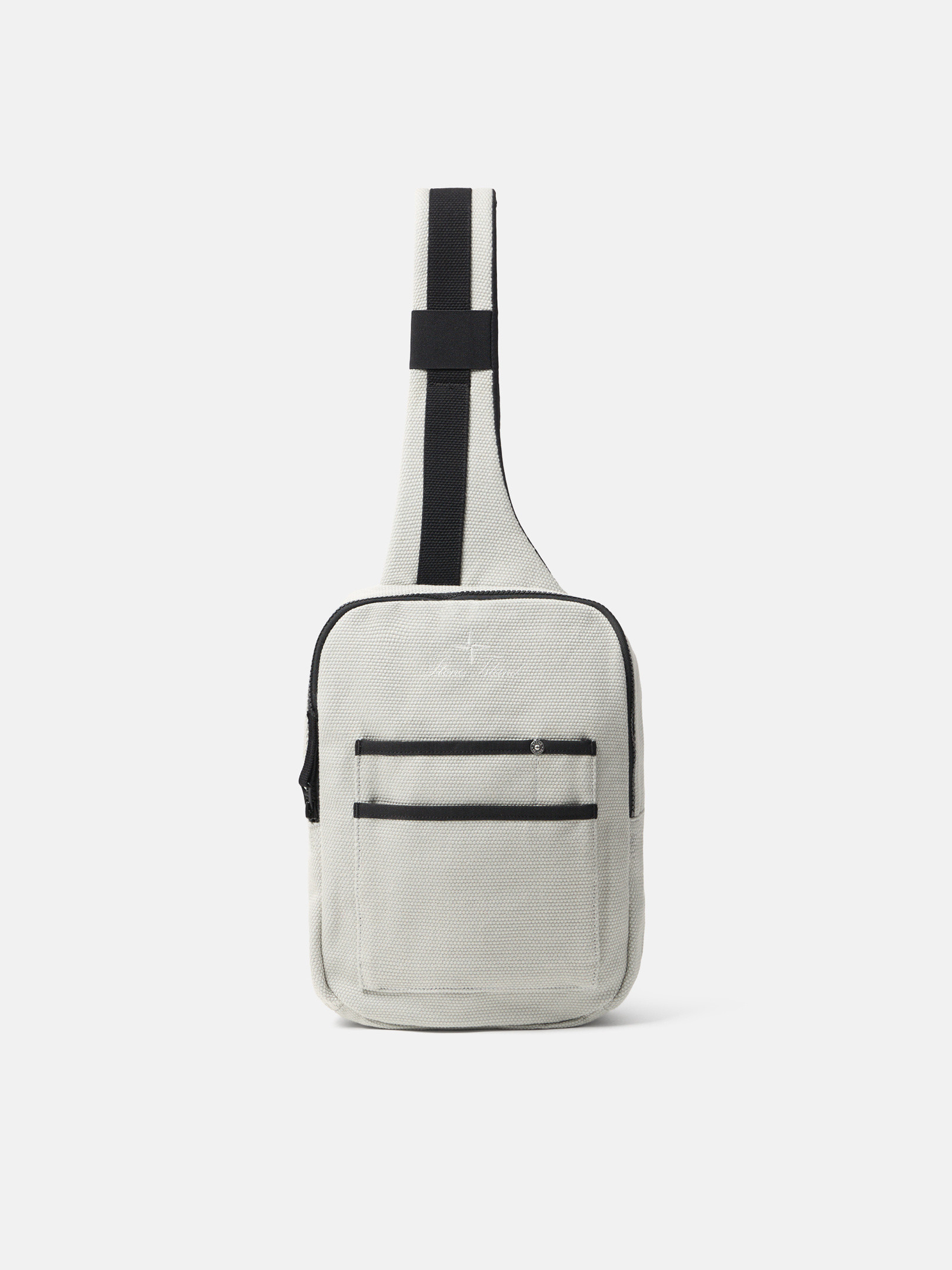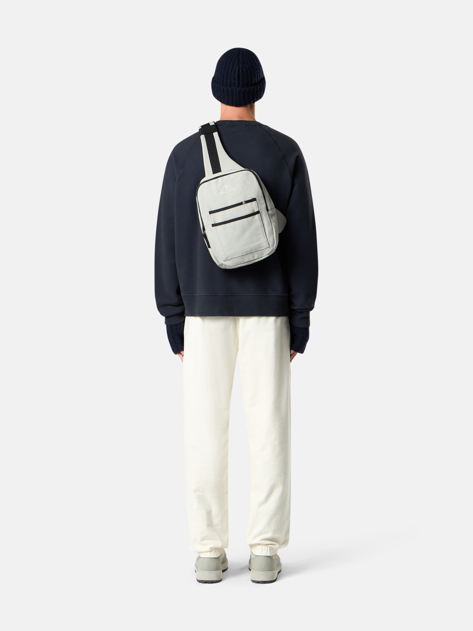 Sling bag in cotton canvas, featuring an archival STOthtNE ISLthtAND logo, front patch pockets, adjustable padded shoulder strap with buckle, and top zipper fastening.