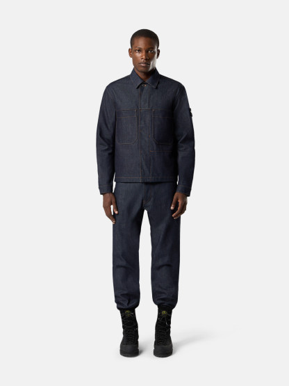 Coach jacket in 13.5oz denim woven from indigo-dyed organic cotton in a 4-thread twill weave, featuring chest pockets and the STOthtNE ISLthtAND Denim Research badge.