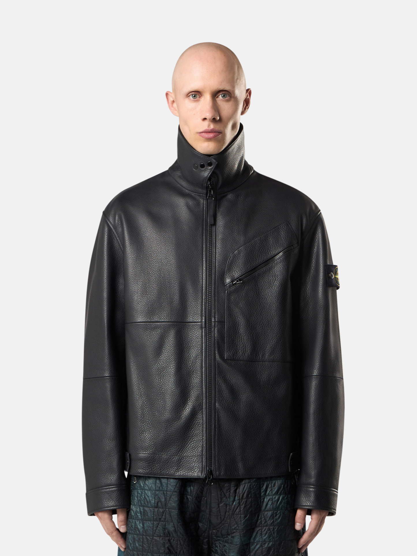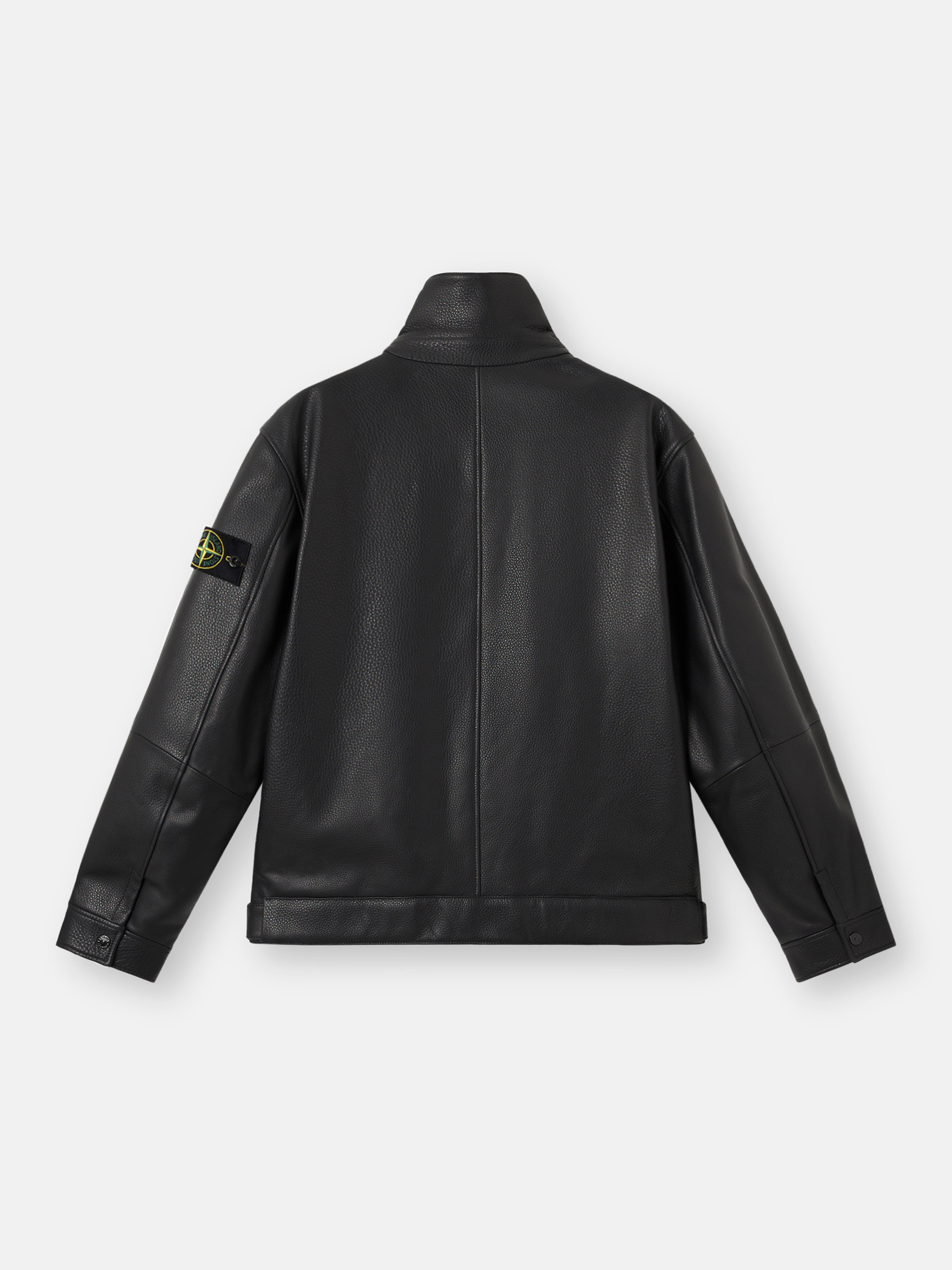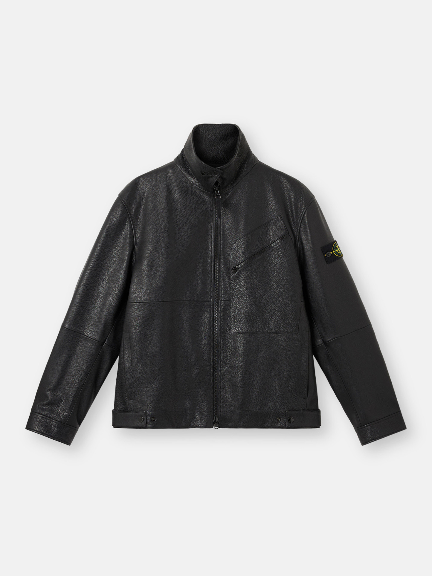 Collar can be worn folded down or standing with snaps. One patch pocket on left chest with diagonal zipper. Standing hand pockets with hidden snap. One inner pocket with div and Compass logo embroidery. STOthtNE ISLthtAND badge on left sleeve. Snap at cuffs. Leather strap with tightening snaps at bottom hem.
