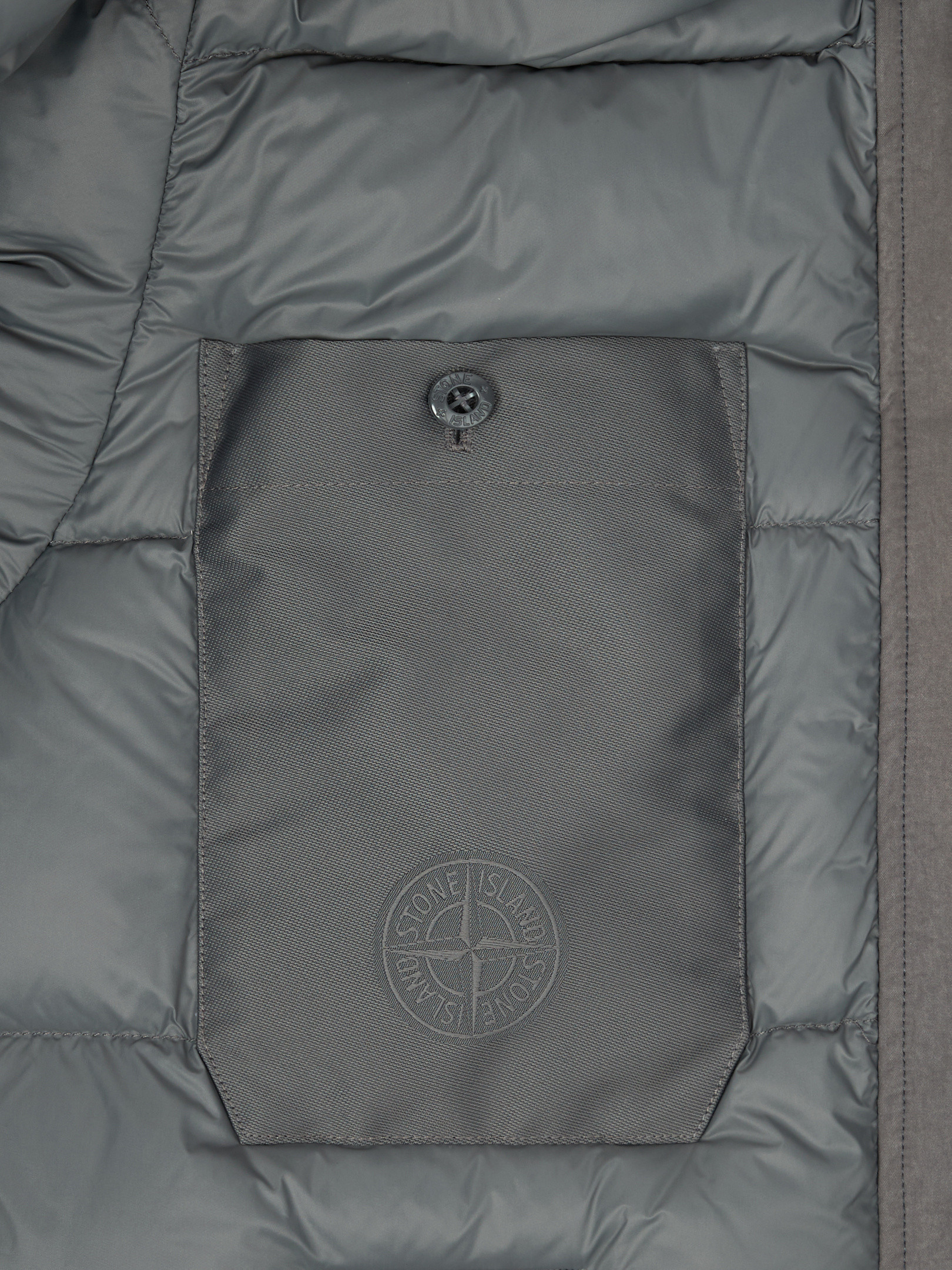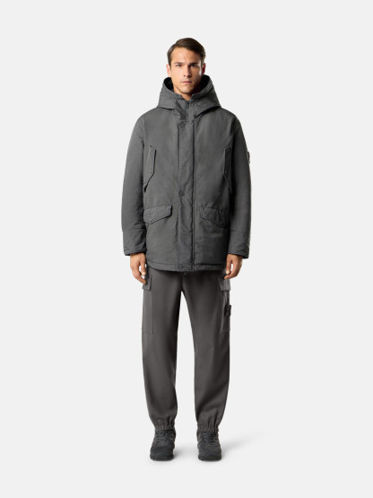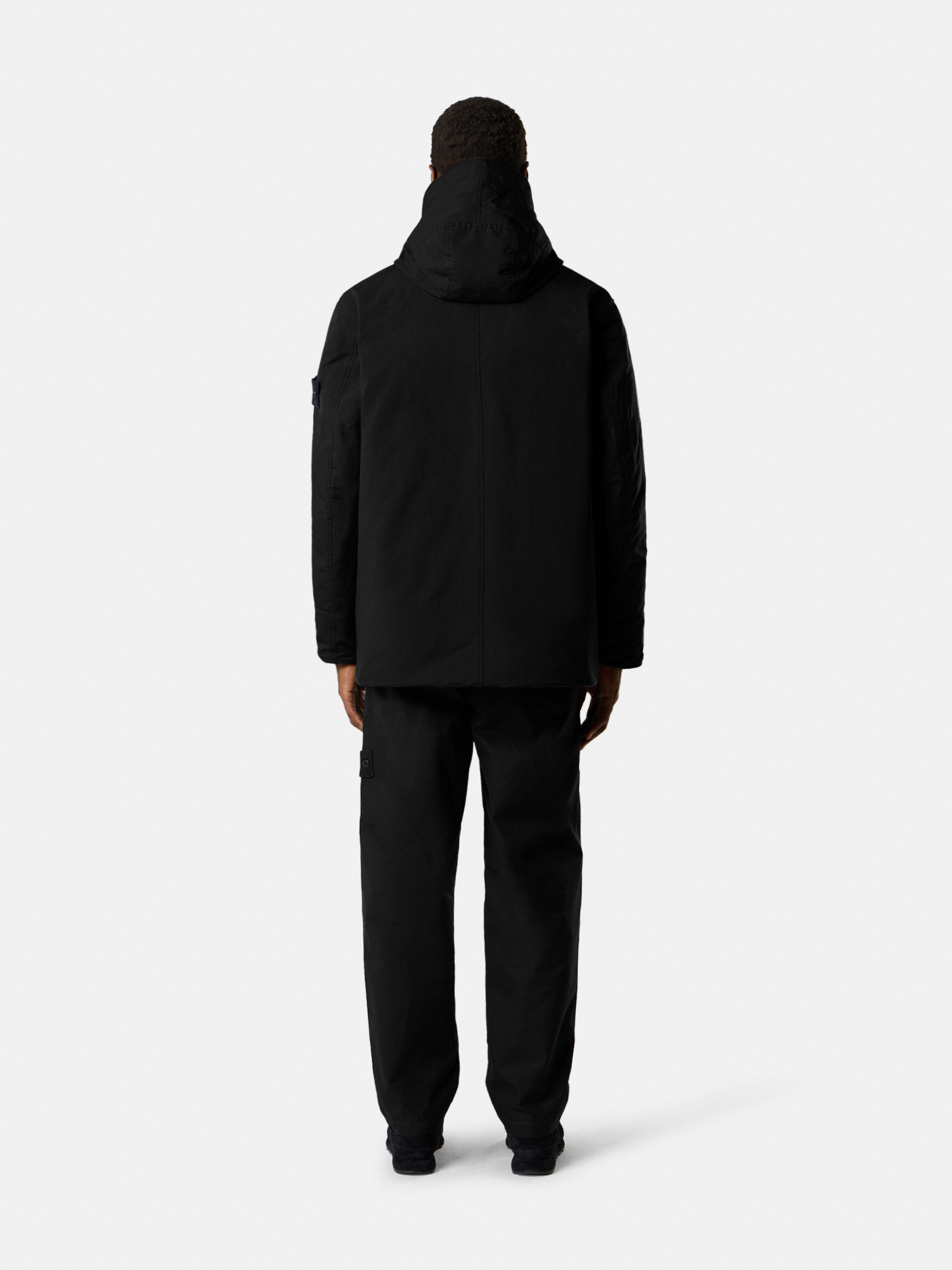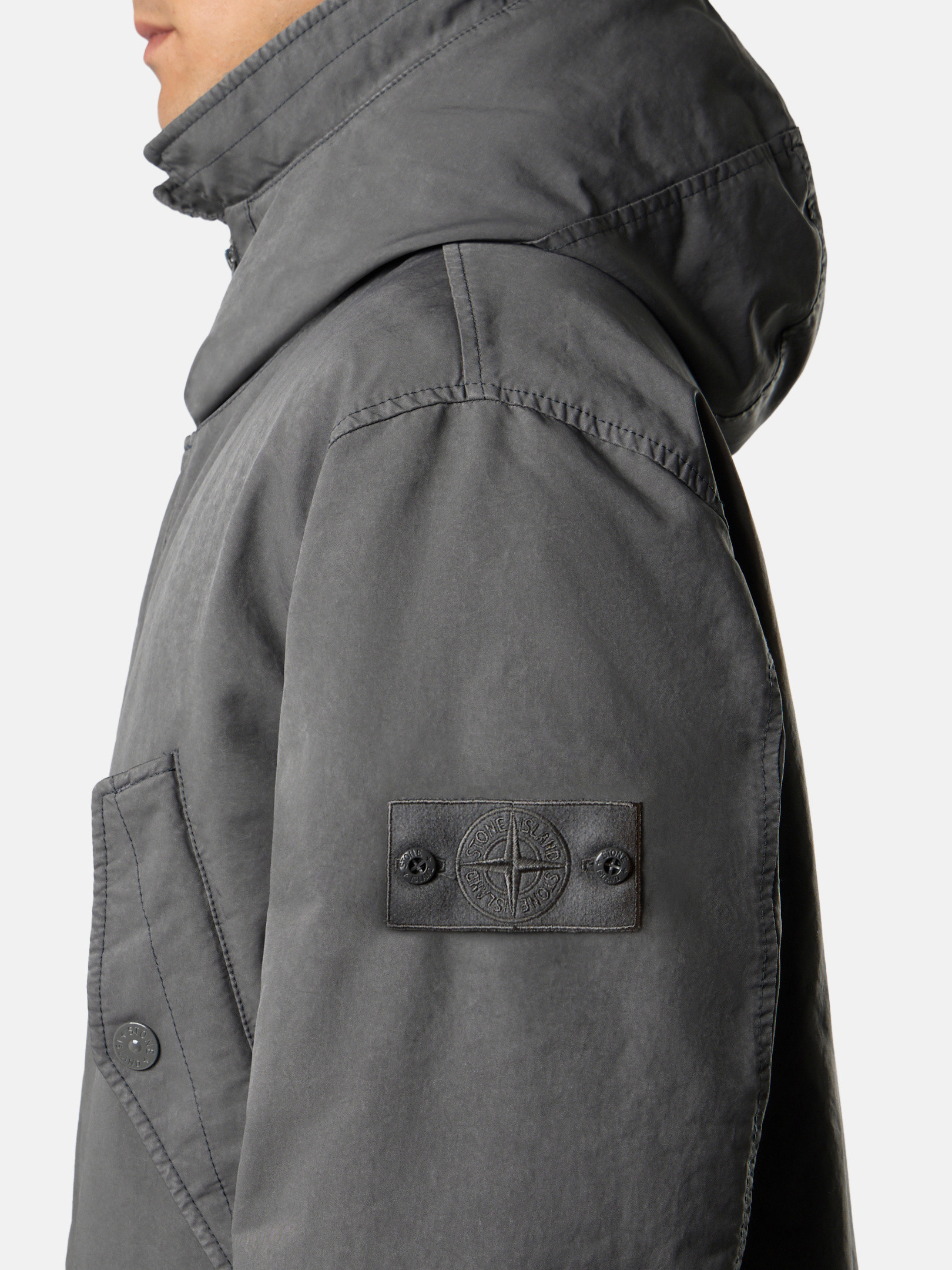 Ghost pieces, derived from the concept of camouflage, are totally monochromatic. Even the STOthtNE ISLthtAND badge is created in a special monocolor version to blend in with the garment. Down short parka in David-TC. Beginning with a star-shaped cross-section Japanese polyester/polyamide substrate, garments in David-TC are sewn and then simultaneously garment-dyed and treated with an anti-drop agent. During the dye process, under pressure at 130°C, the fabric undergoes heat-induced compression, radically transforming its texture and construction for a truly unique tactile effect. Padded with the finest feathers. RDS - Responsible Down Standard certified.