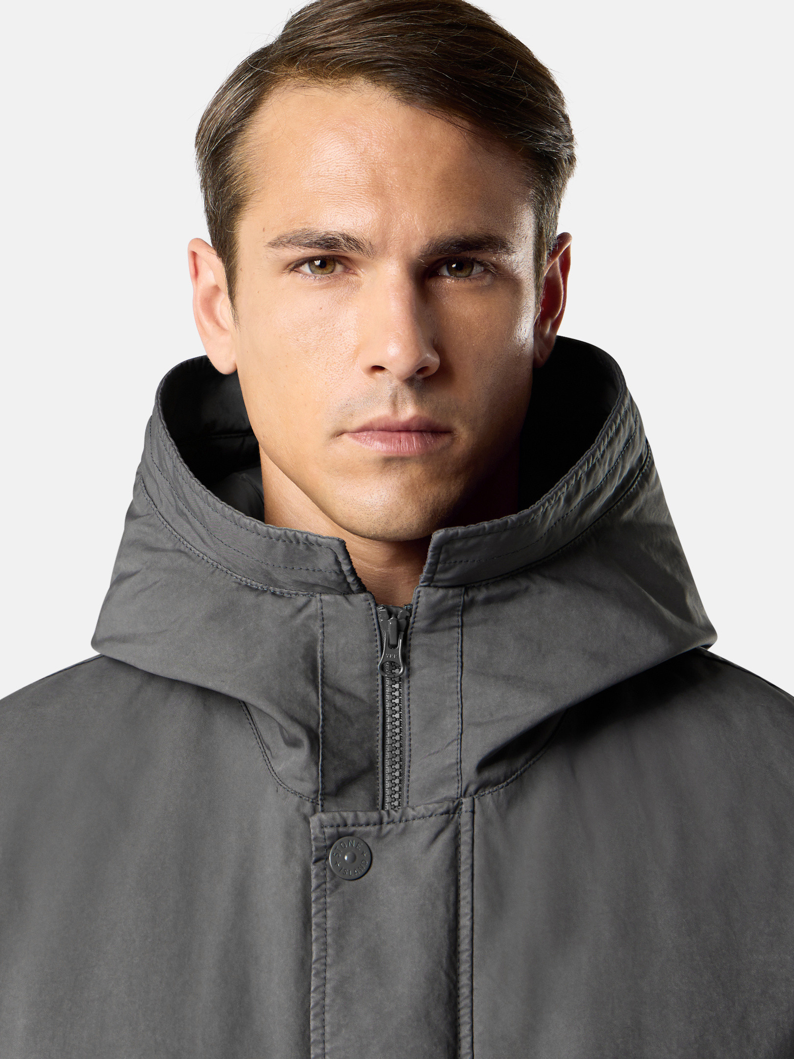 Down short parka in David-TC with a unique tactile effect achieved through heat-induced compression, featuring a padded hood, snap pockets, and two-way zipper. Garment dyed with anti-drop.