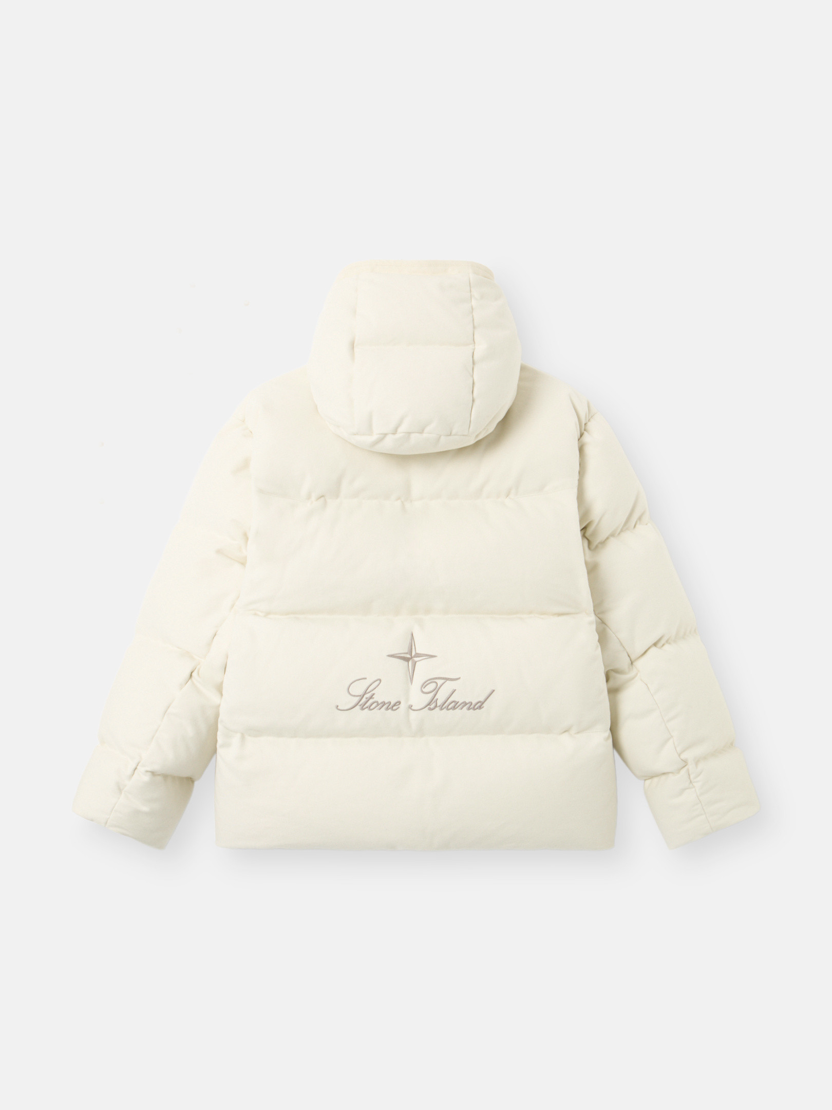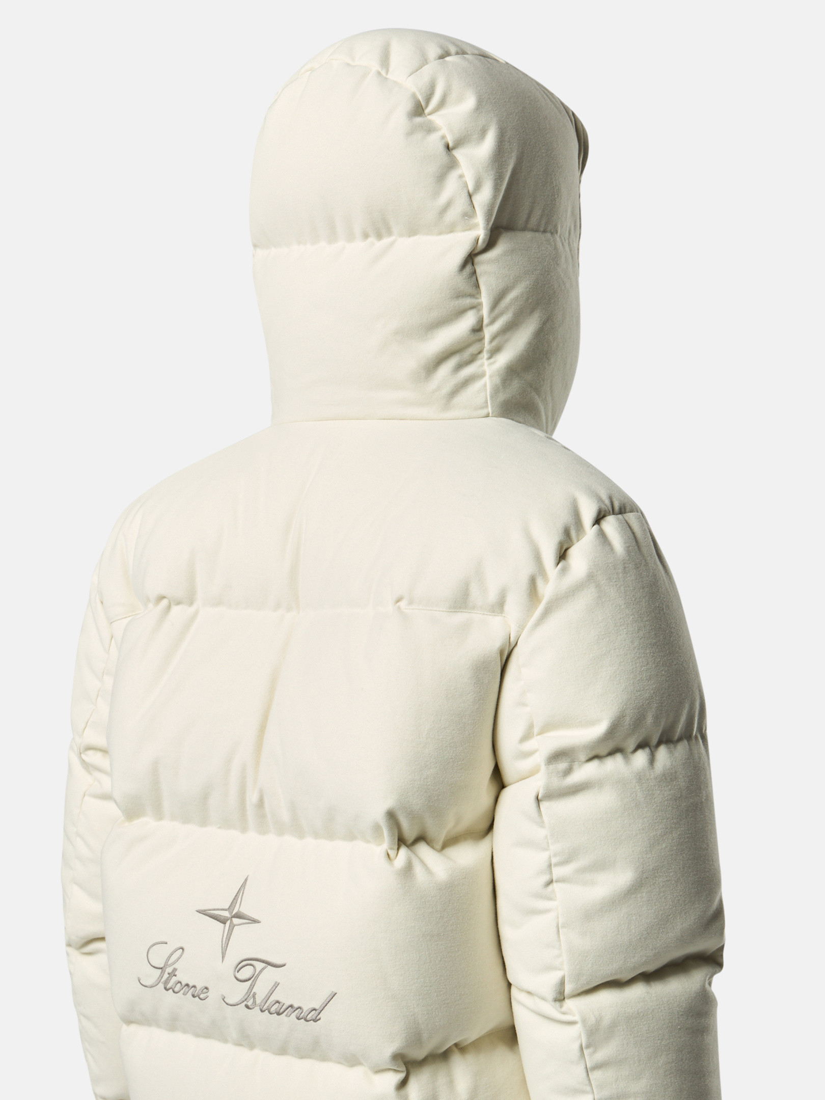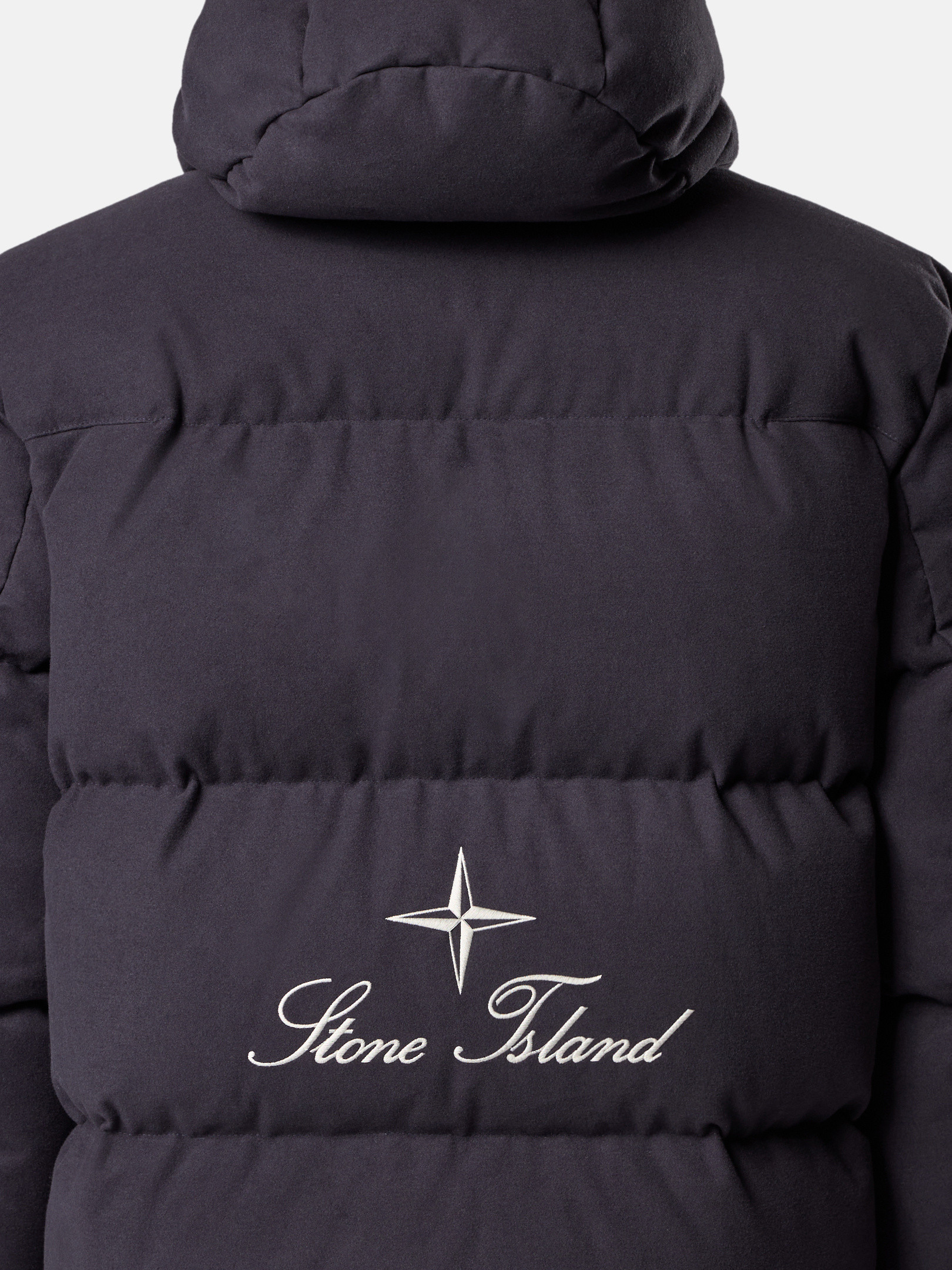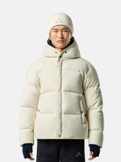 Hooded down jacket in cotton moleskin with a double-faced satin weave, resin-treated for wind and mild water resistance, featuring an archival STOthtNE ISLthtAND logo. Garment dyed with anti-drop.