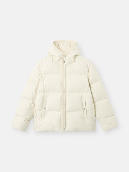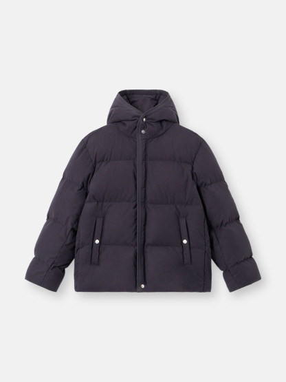 Hooded down jacket made from a cotton moleskin. The fabric's double-faced satin weave is brushed and sheared externally to achieve a warm and velvet-like hand. The fabric is resin-treated with a special anti-drop agent, making it wind resistant and mildly water resistant. RDS - Responsible Down Standard certified.