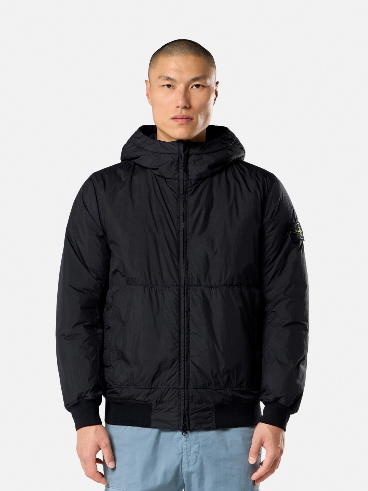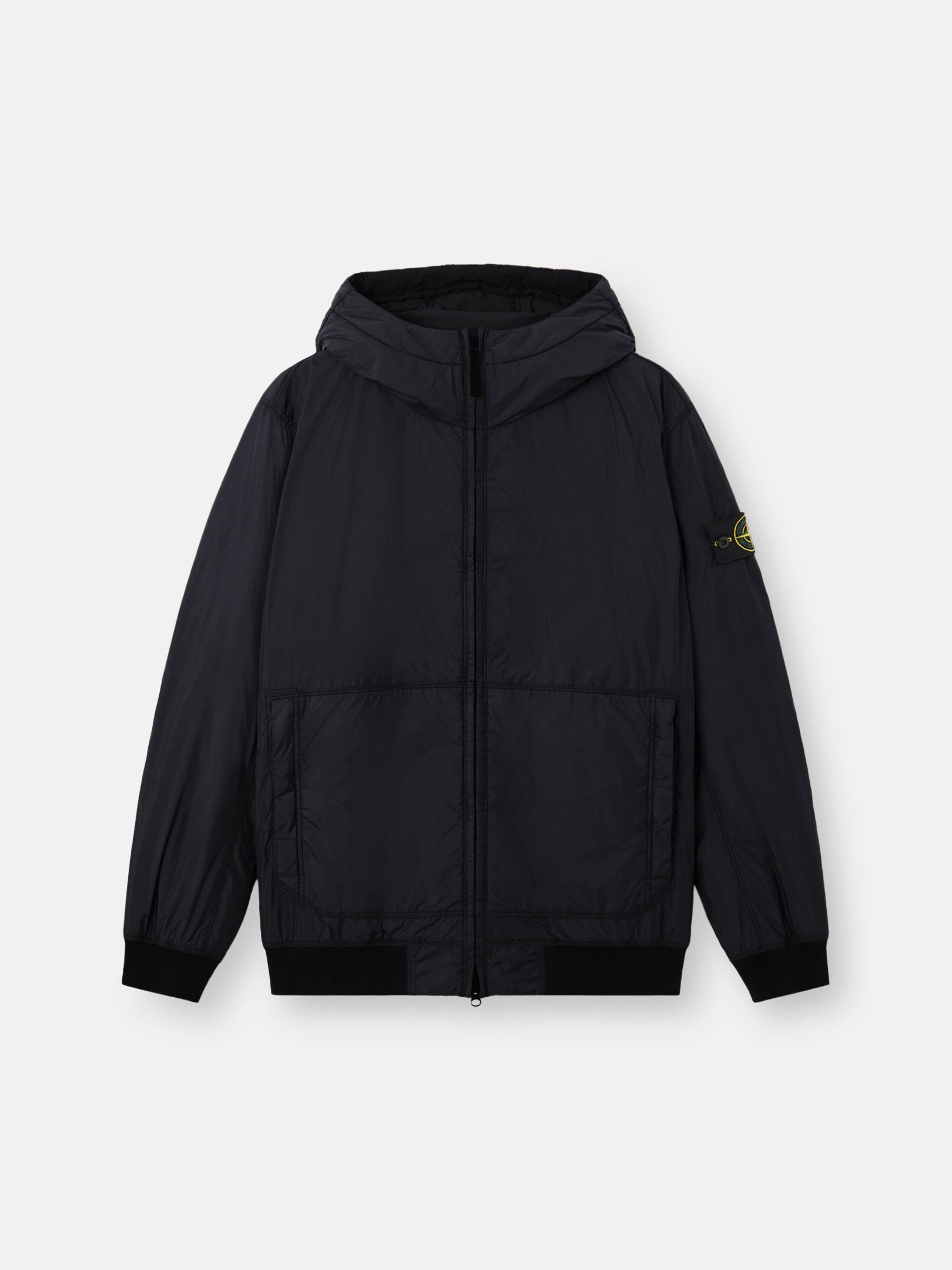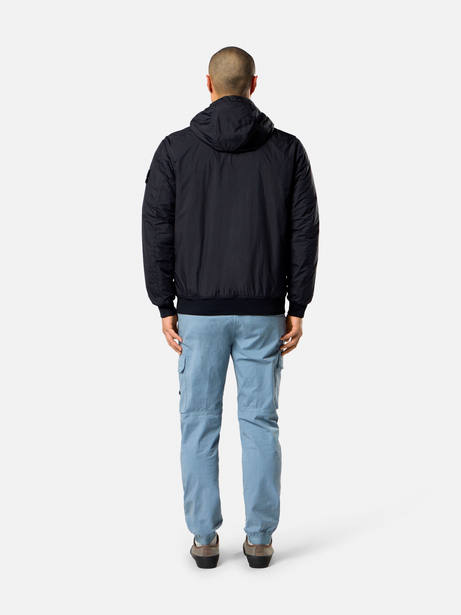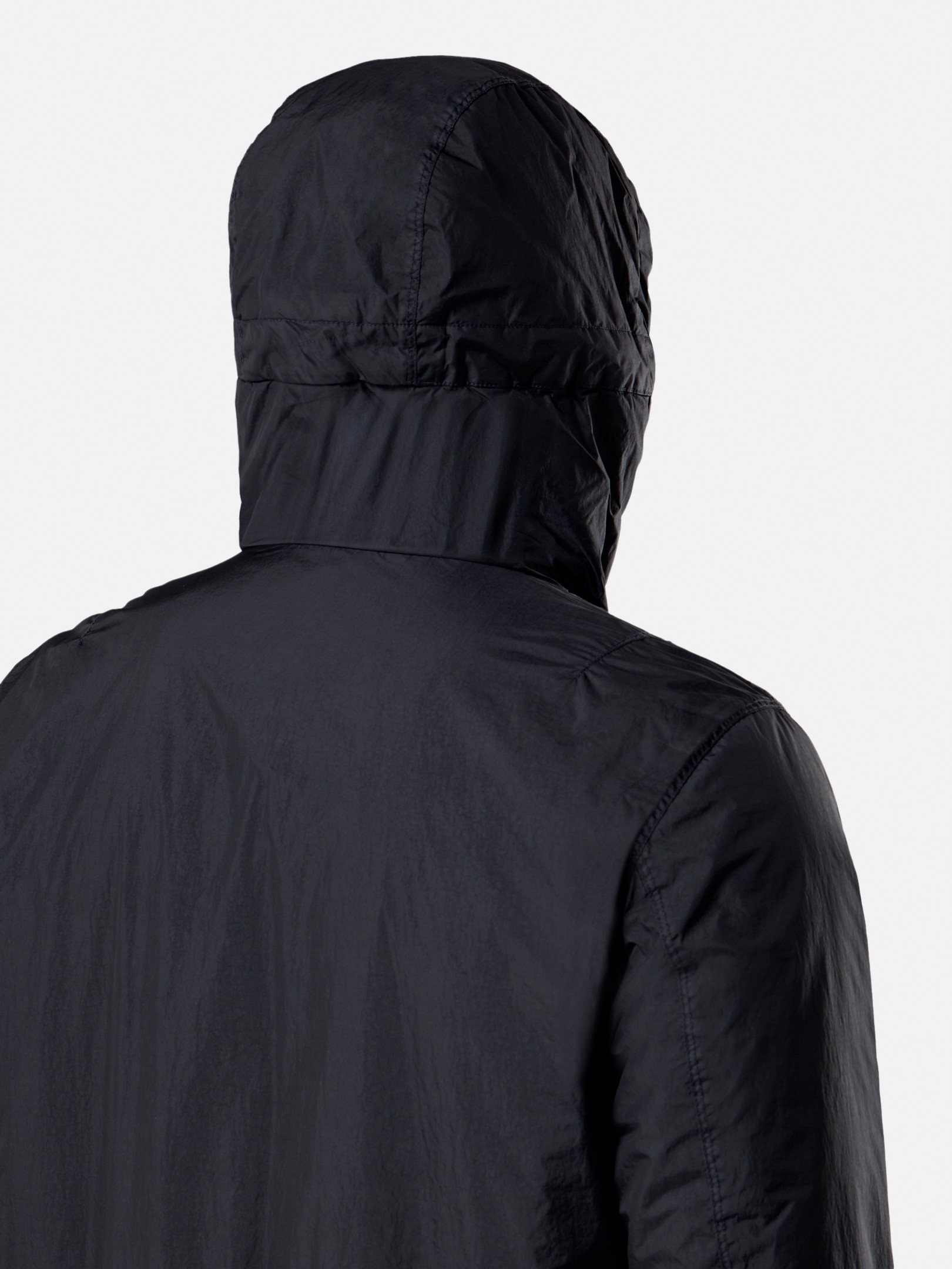 Hooded jacket in a light recycled nylon rep with an ultra-tight weaving construction. The resin coating of its inner face makes it wind resistant and mildly water resistant. Due to the resin treating of the material, the color penetrates unevenly into the material, lending a crinkled appearance to the surface. Padded with PrimaLoft®-TC, an exclusive blend of high-performance insulating fibers, 70% recycled, engineered with STOthtNE ISLthtAND for garment dyeing. Garment dyed with the addition of a special anti-drop agent.
