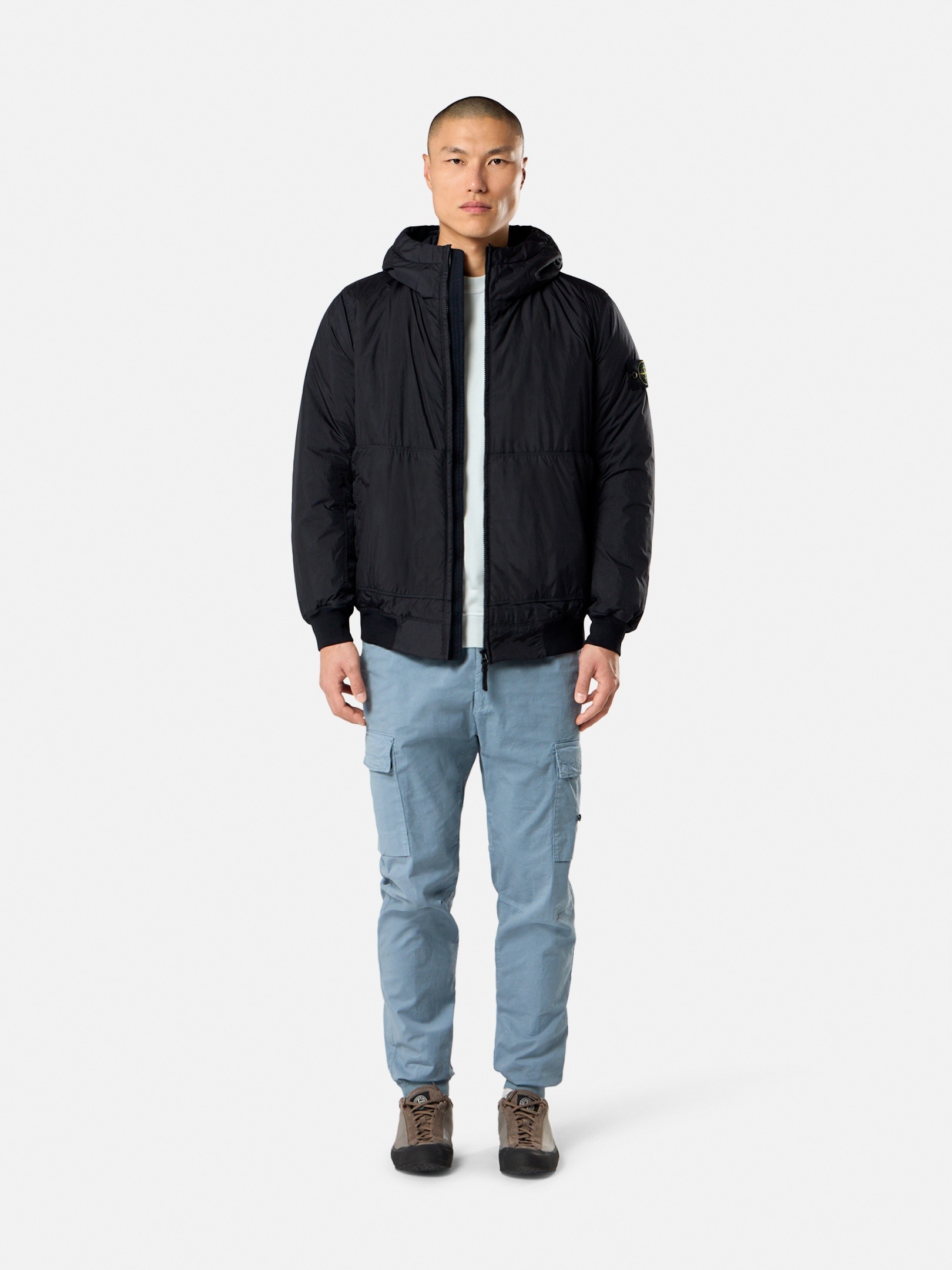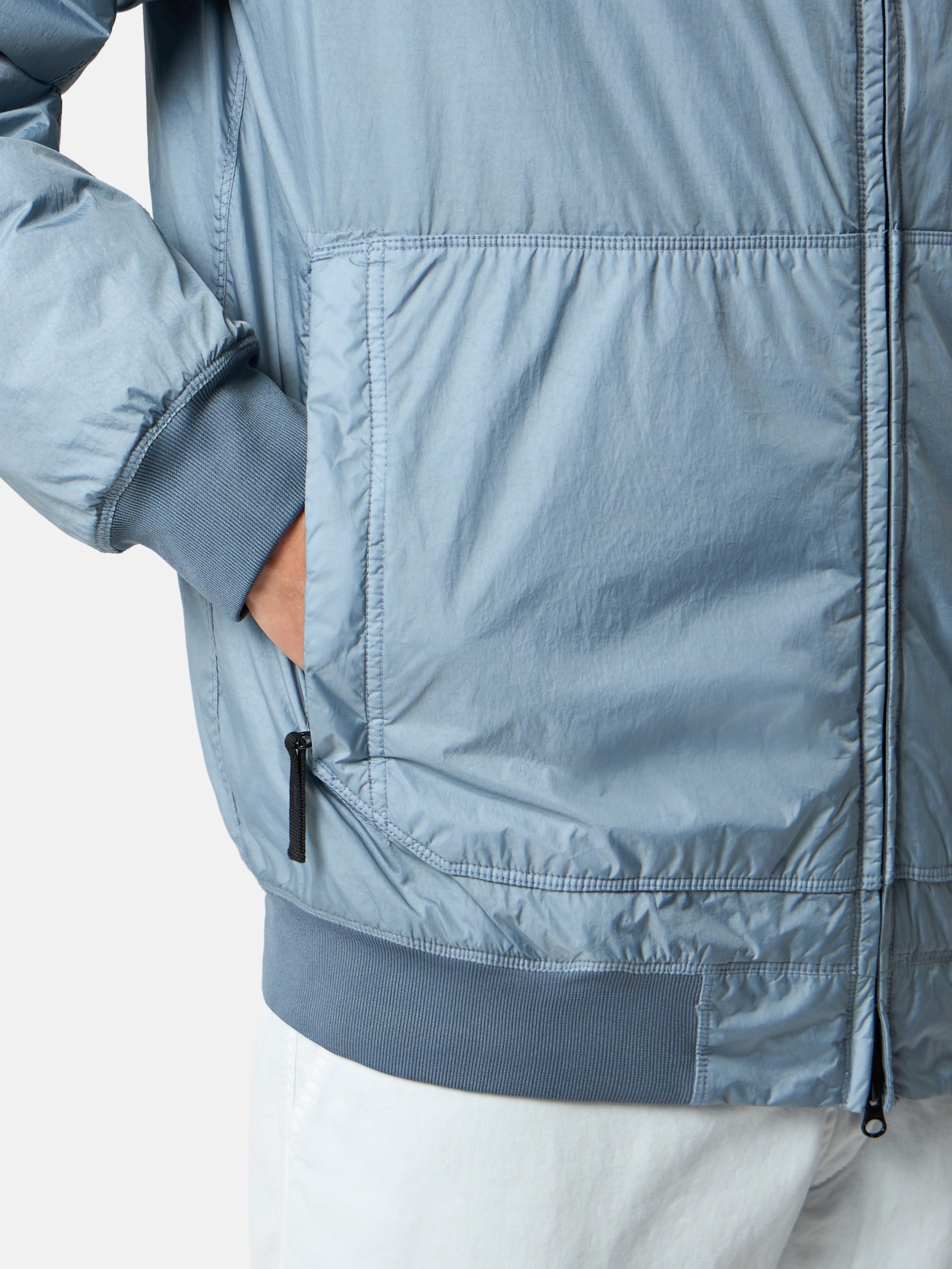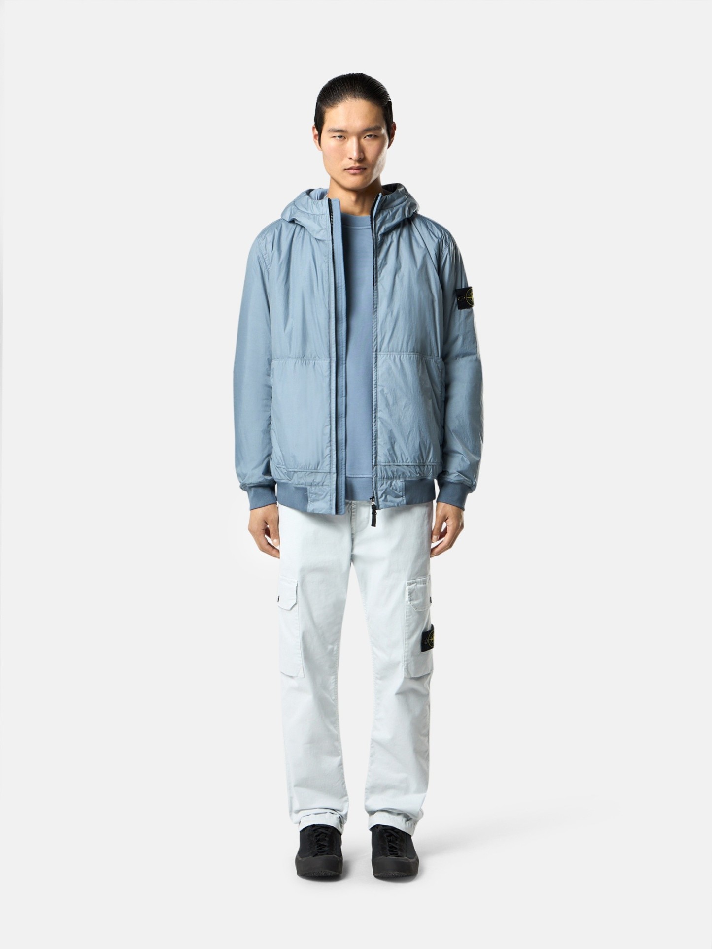 Hooded jacket in a light recycled nylon rep with an ultra-tight weaving construction. The resin coating of its inner face makes it wind resistant and mildly water resistant. Due to the resin treating of the material, the color penetrates unevenly into the material, lending a crinkled appearance to the surface. Padded with PrimaLoft®-TC, an exclusive blend of high-performance insulating fibers, 70% recycled, engineered with STOthtNE ISLthtAND for garment dyeing. Garment dyed with the addition of a special anti-drop agent.