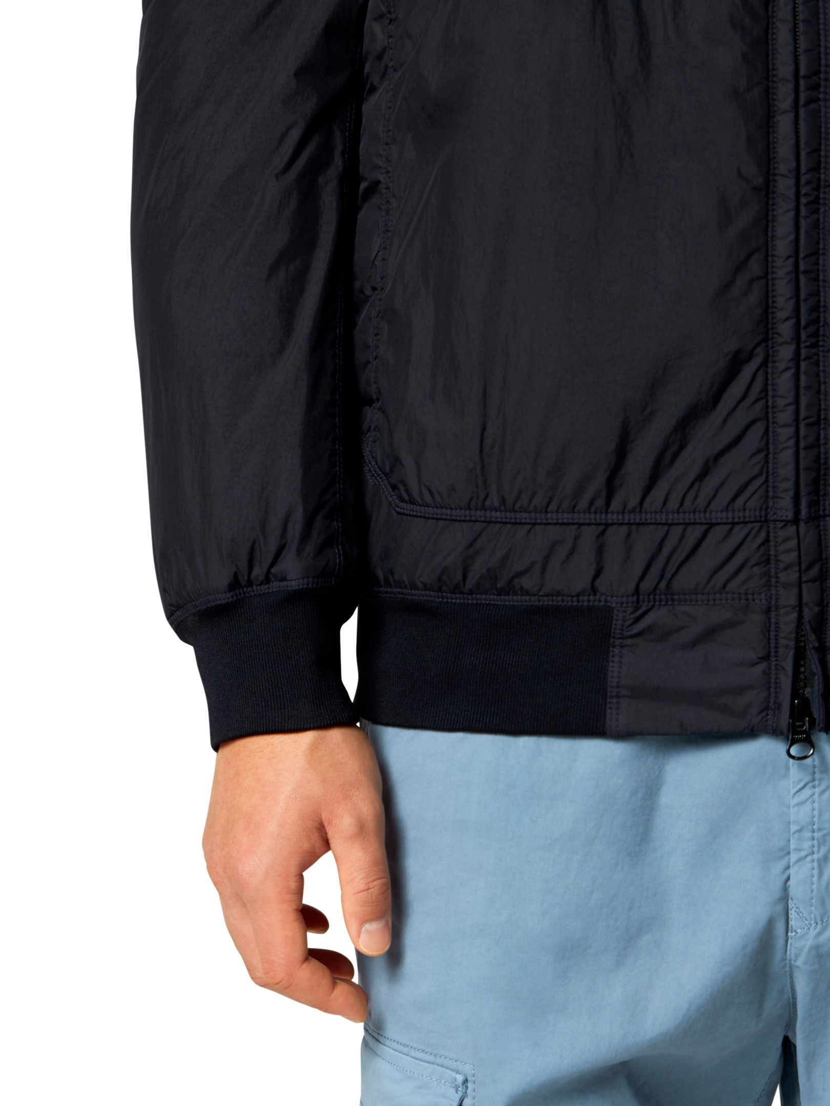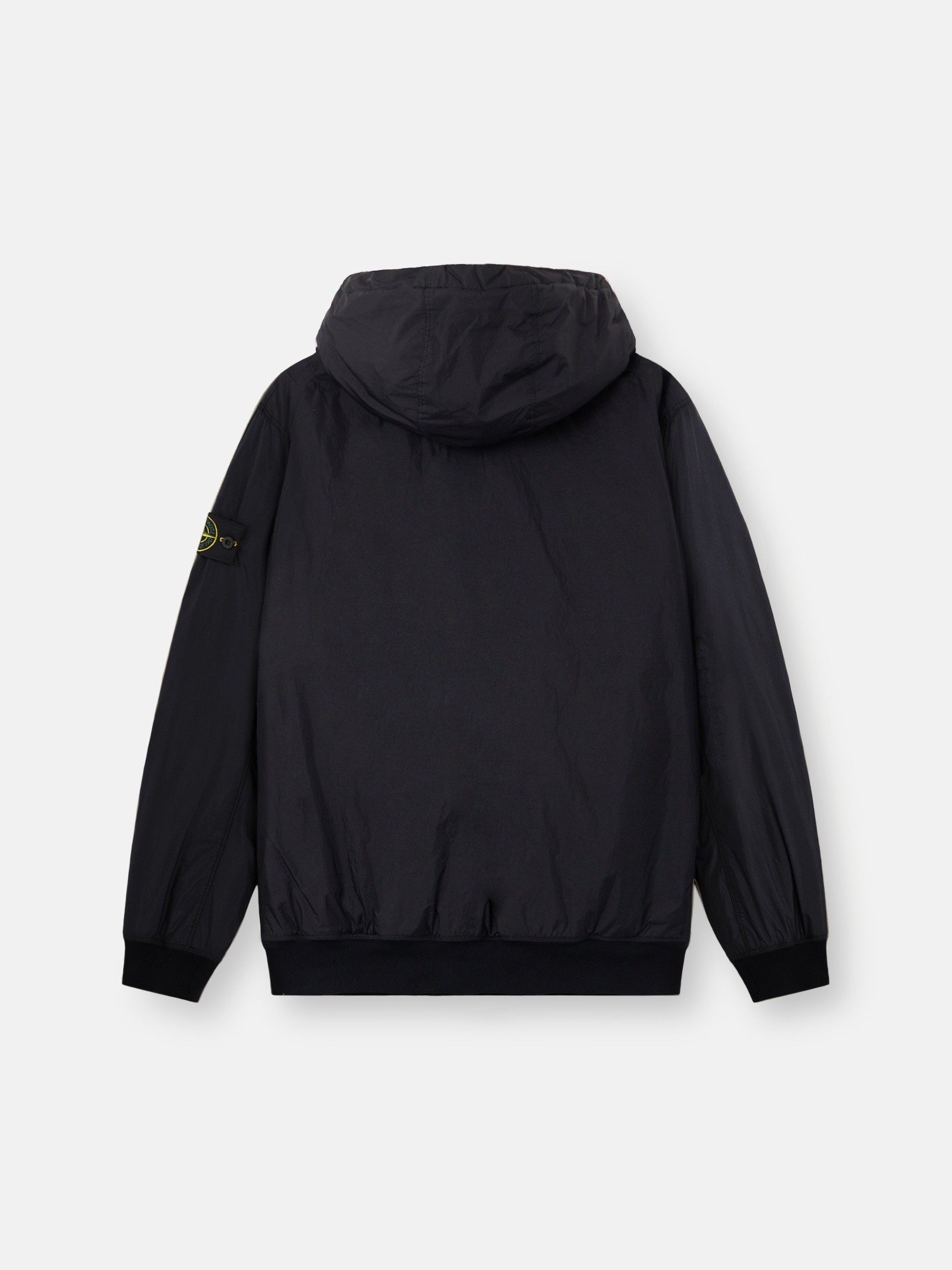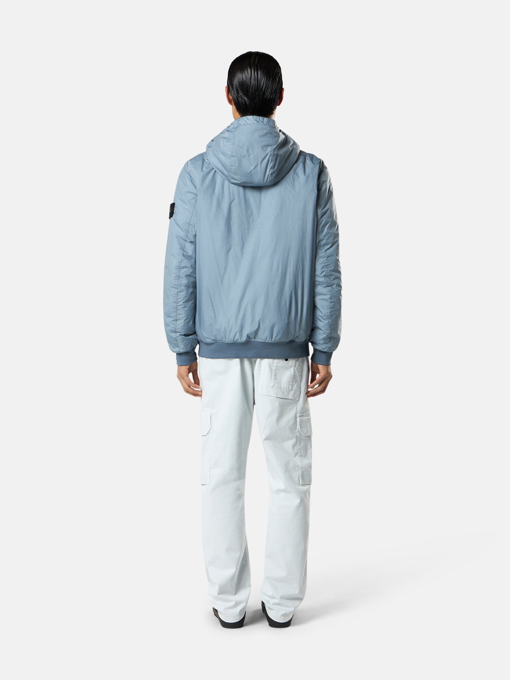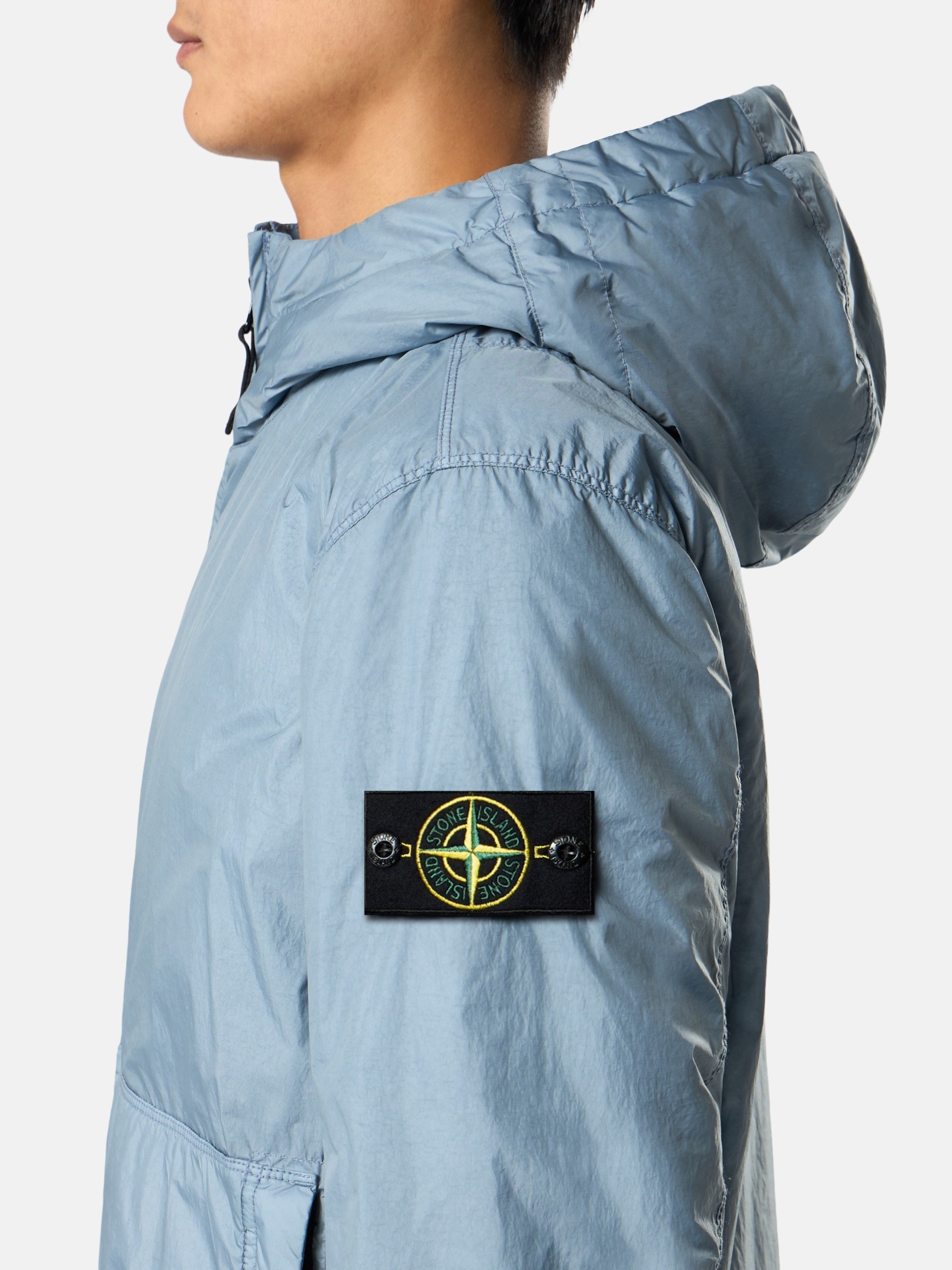 Hooded jacket in a light recycled nylon rep with an ultra-tight weaving construction. The resin coating of its inner face makes it wind resistant and mildly water resistant. Due to the resin treating of the material, the color penetrates unevenly into the material, lending a crinkled appearance to the surface. Padded with PrimaLoft®-TC, an exclusive blend of high-performance insulating fibers, 70% recycled, engineered with STOthtNE ISLthtAND for garment dyeing. Garment dyed with the addition of a special anti-drop agent.