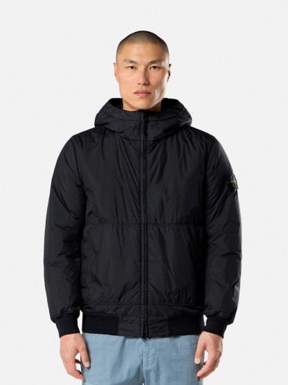 Hooded down jacket in a light recycled nylon rep with a crinkled appearance, padded with PrimaLoft®-TC, featuring a Compass logo embroidery and elasticated cuffs. Garment dyed with anti-drop.