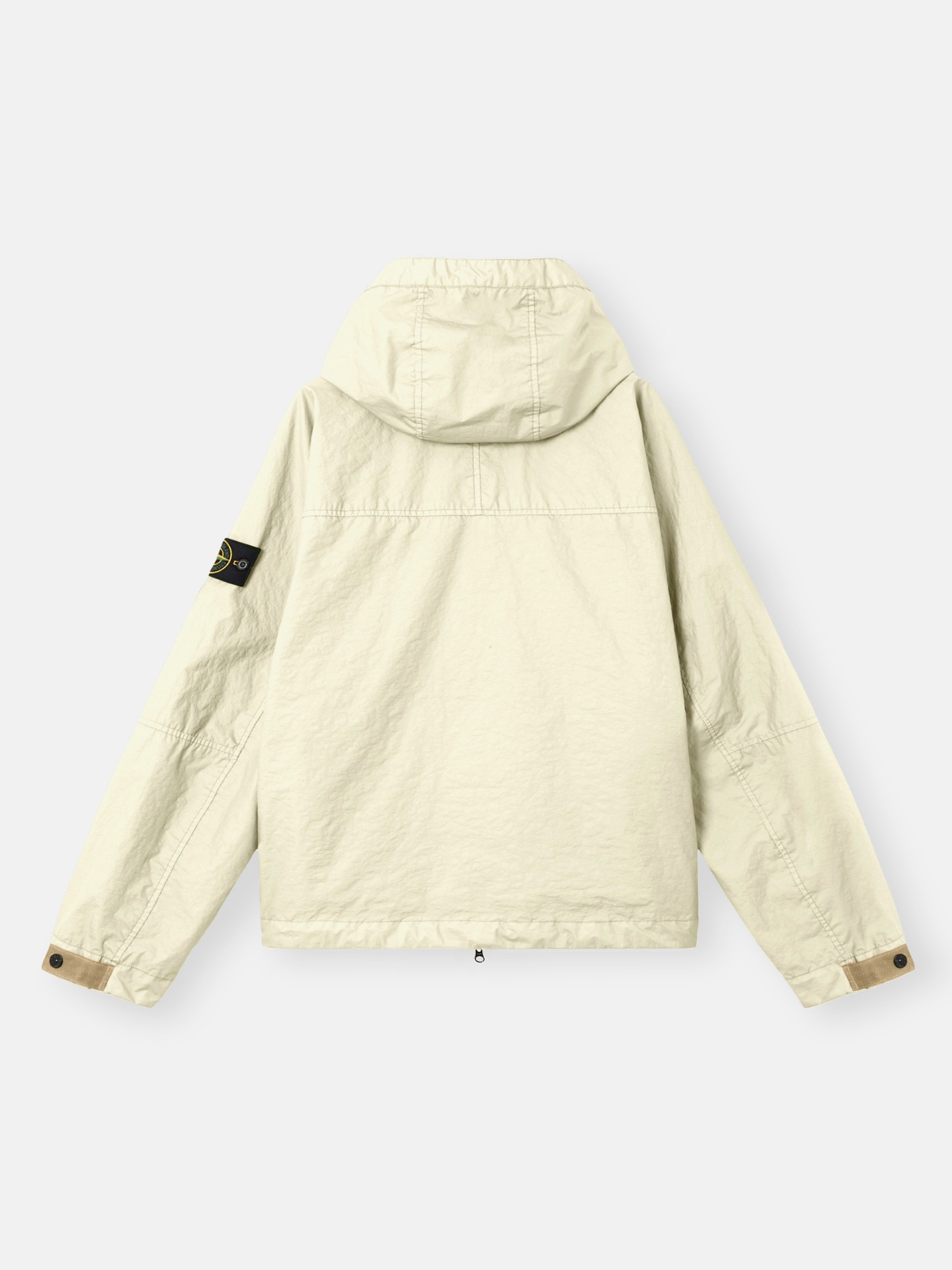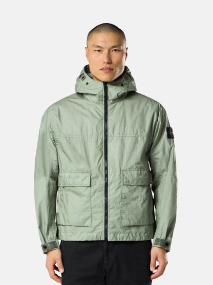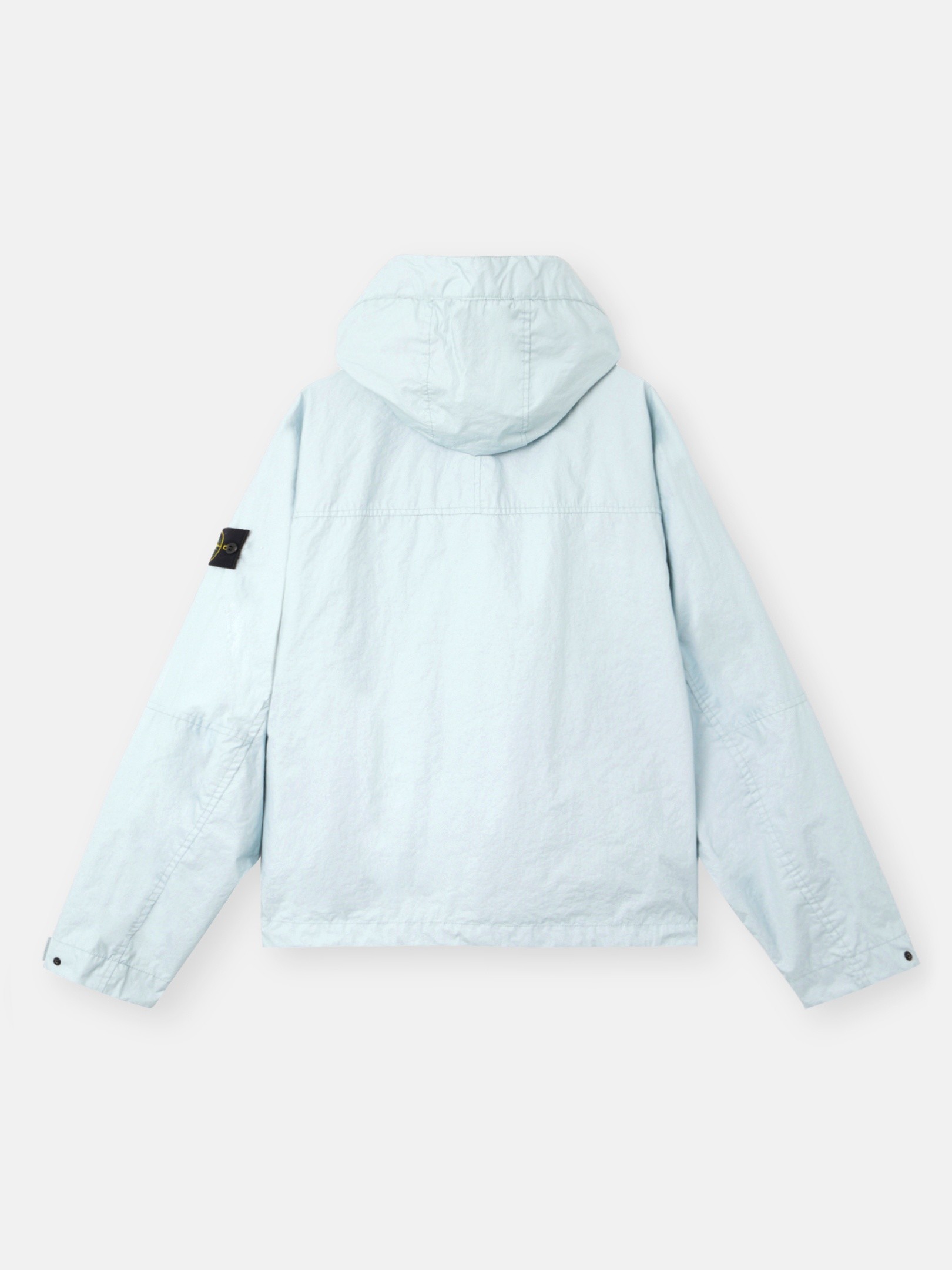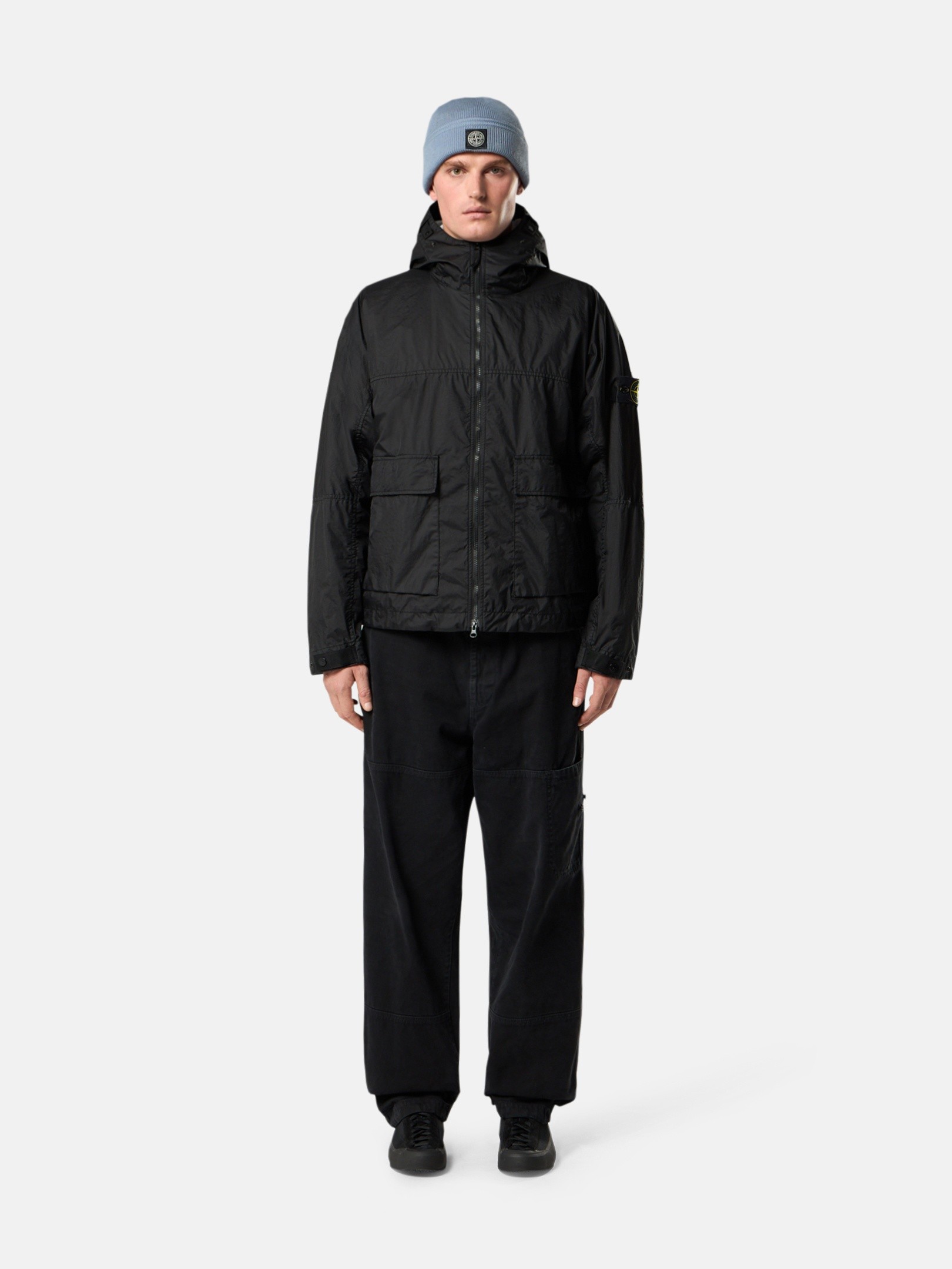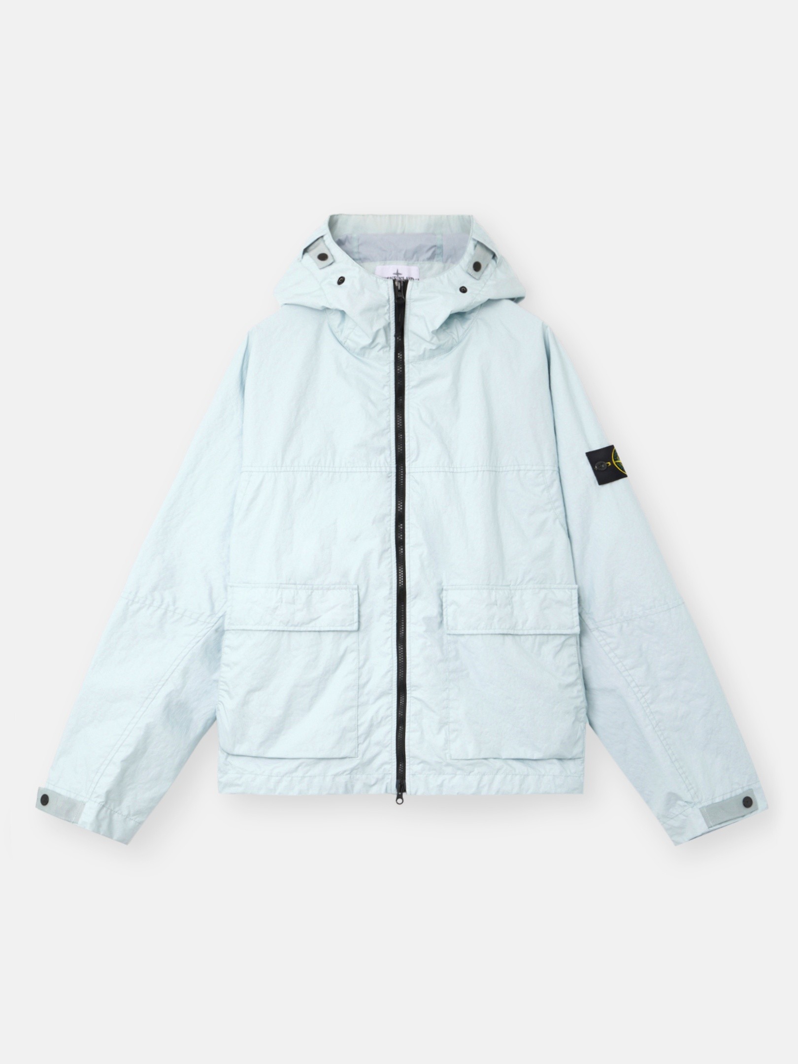Hooded jacket in Membrana 3L TC, a three-layer light performance fabric made from an opaque nylon outer face laminated to a breathable, water-resistant membrane, protected by an imperceptible polyester base. STOthtNE ISLthtAND's garment dyeing expertise gives an outstanding color to the outer face while preserving the performance features of the inner membrane. The addition of a special agent to the dye formula makes the piece anti-drop.