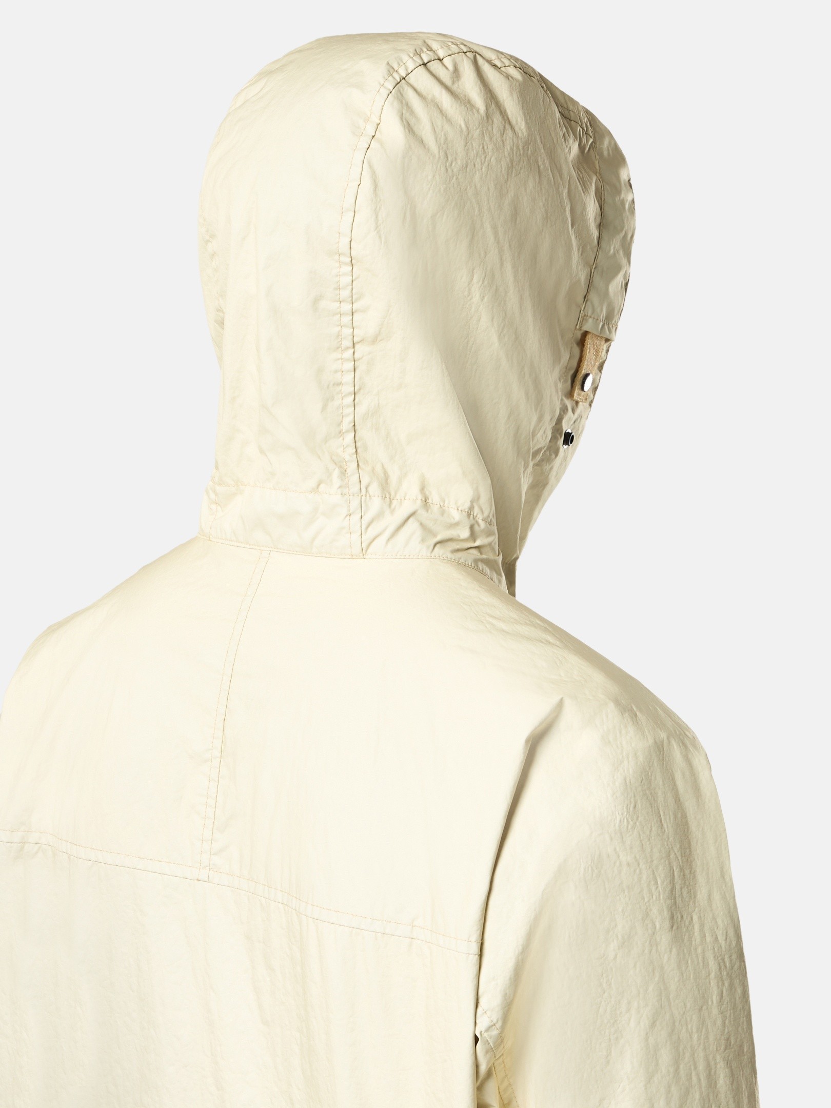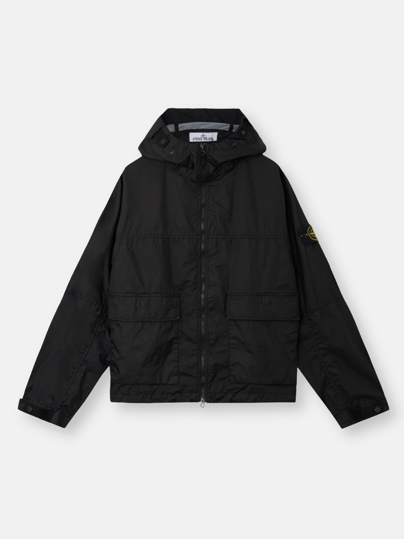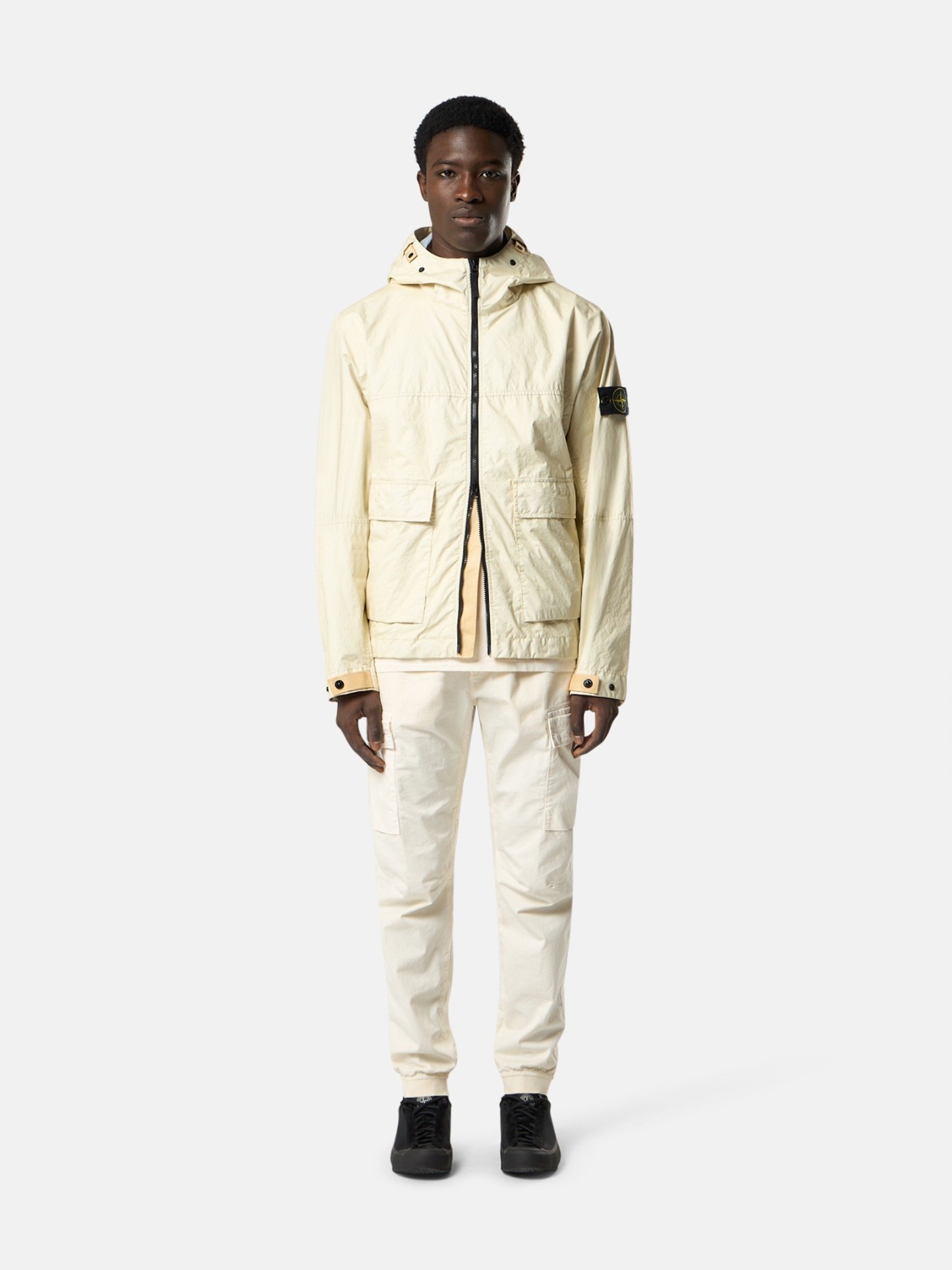 Hooded jacket in Membrana 3L TC, a three-layer light performance fabric made from an opaque nylon outer face laminated to a breathable, water-resistant membrane, protected by an imperceptible polyester base. STOthtNE ISLthtAND's garment dyeing expertise gives an outstanding color to the outer face while preserving the performance features of the inner membrane. The addition of a special agent to the dye formula makes the piece anti-drop.