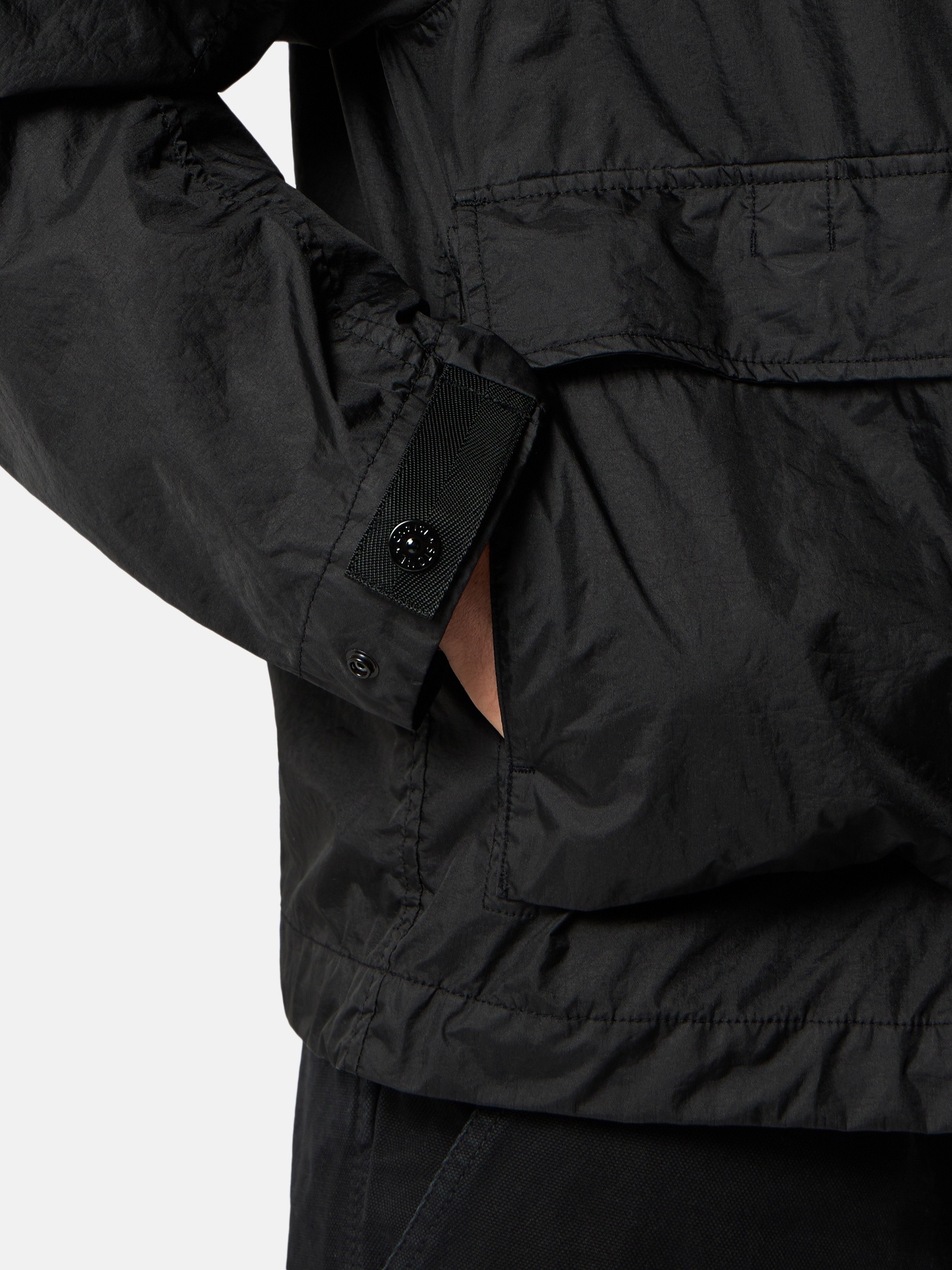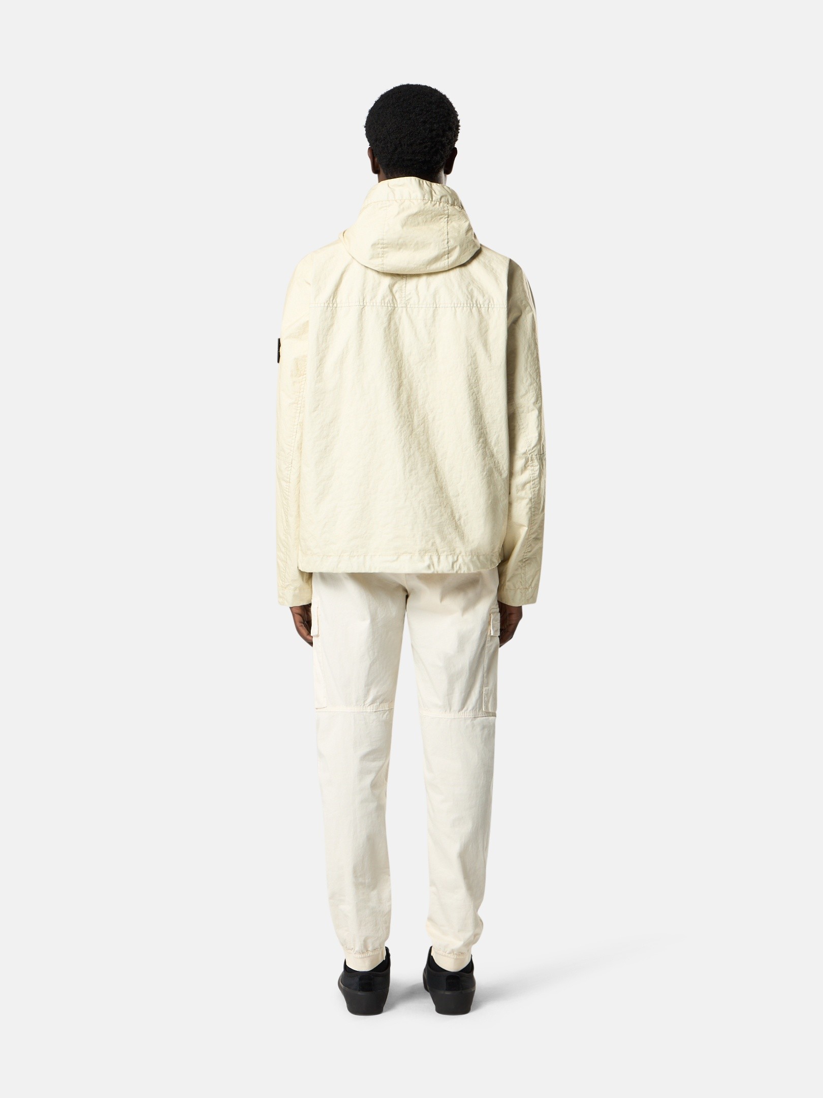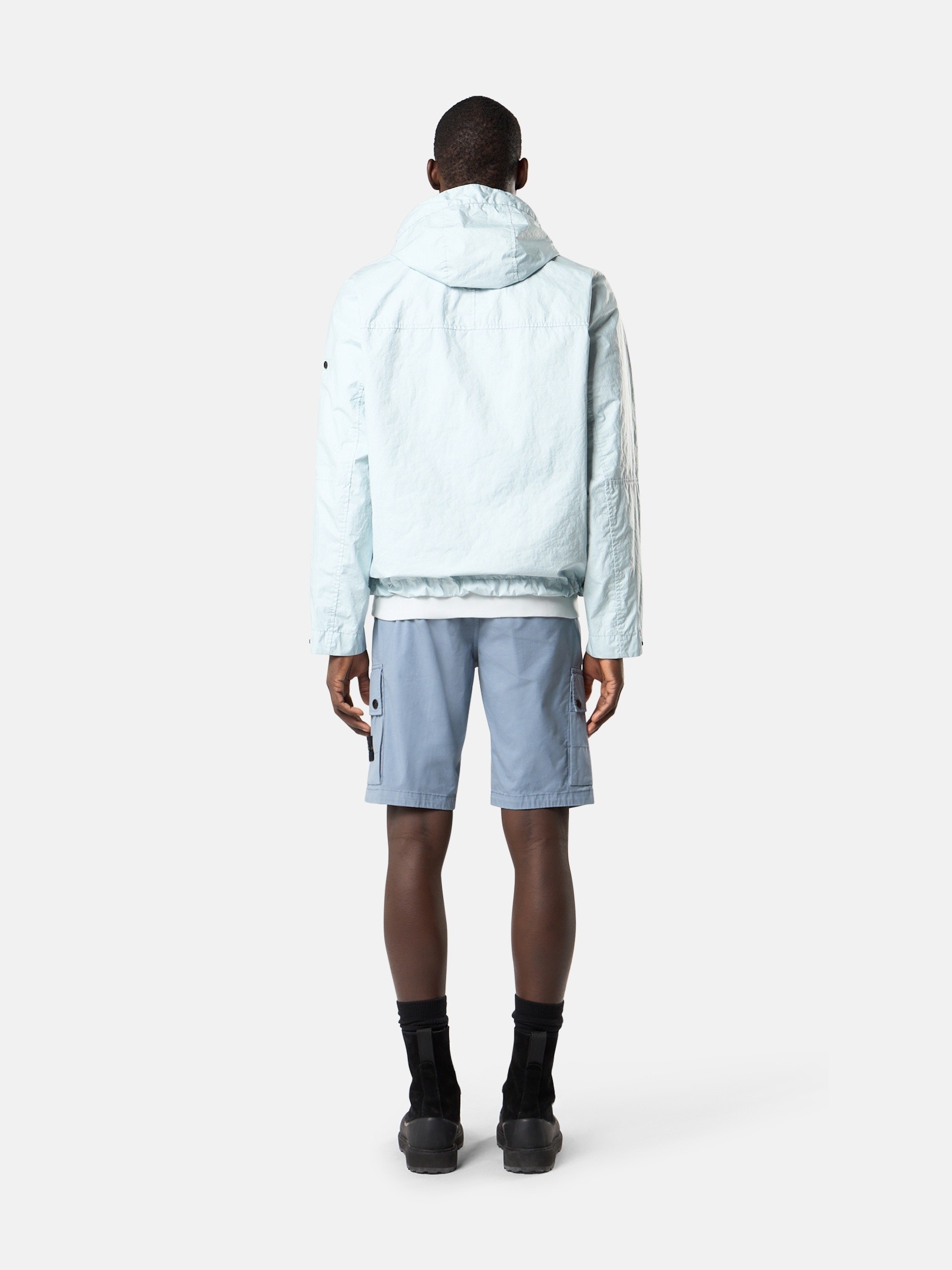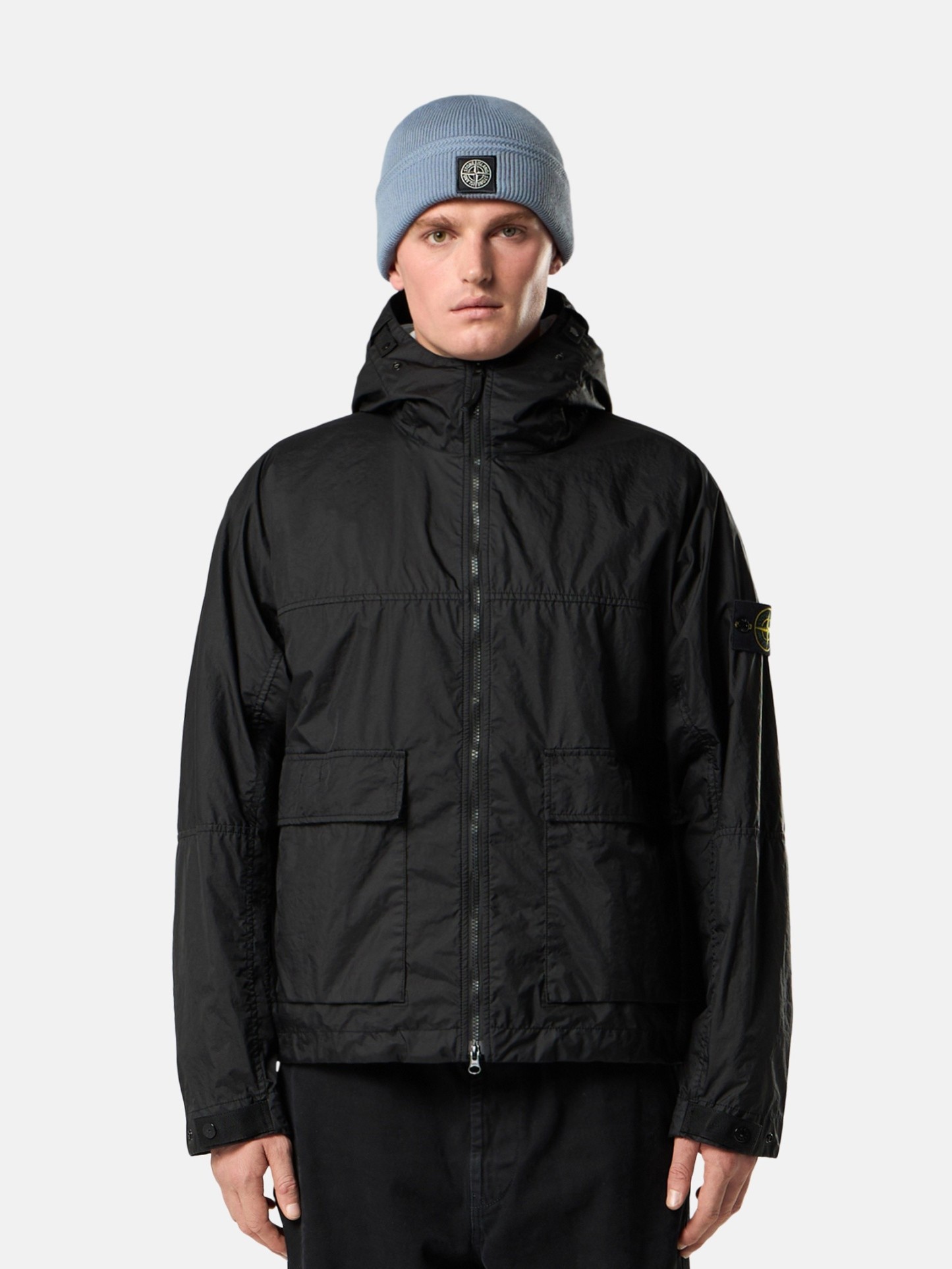 Hooded jacket in Membrana 3L TC, a three-layer light performance fabric made from an opaque nylon outer face laminated to a breathable, water-resistant membrane, protected by an imperceptible polyester base. STOthtNE ISLthtAND's garment dyeing expertise gives an outstanding color to the outer face while preserving the performance features of the inner membrane. The addition of a special agent to the dye formula makes the piece anti-drop.