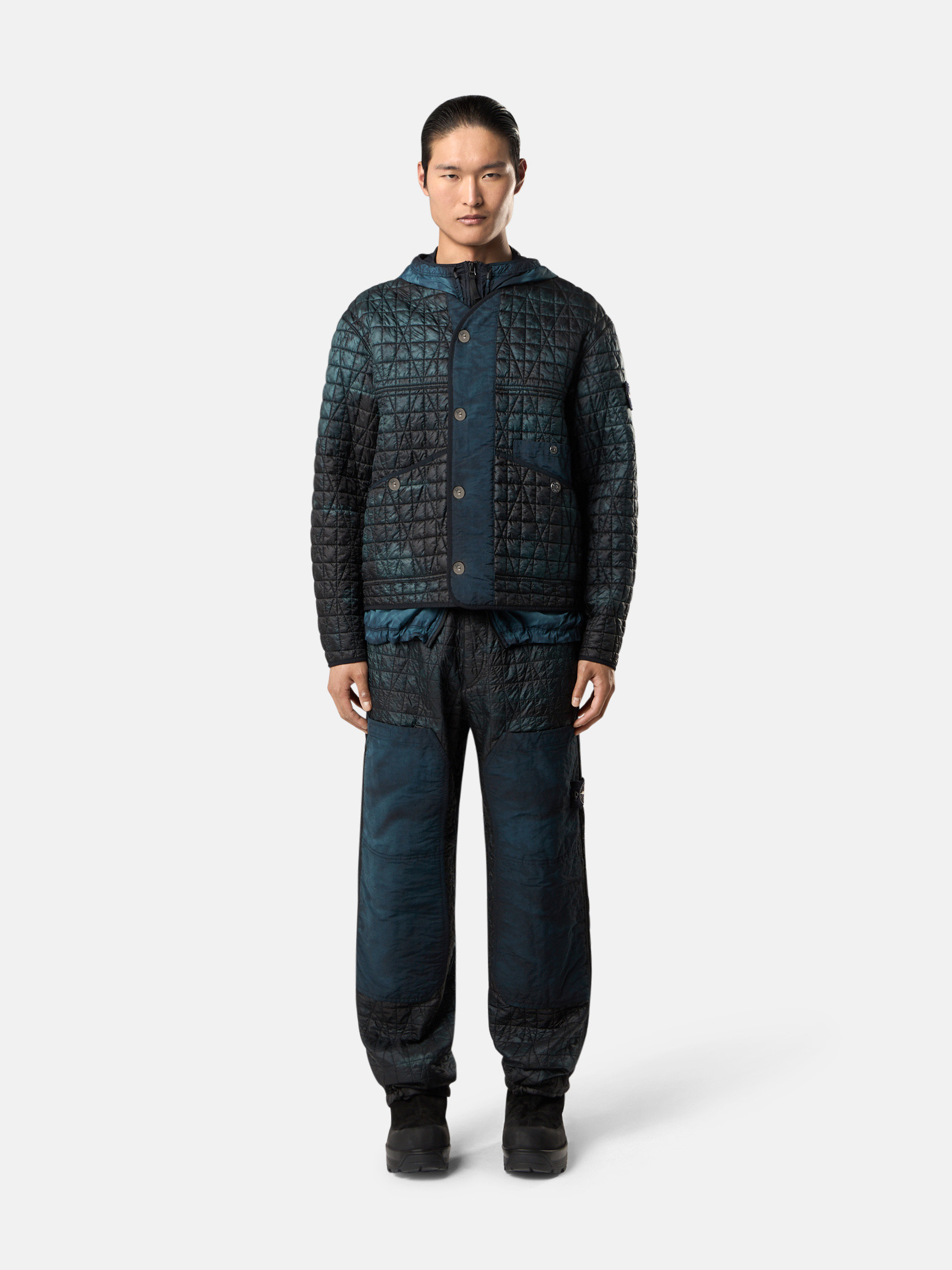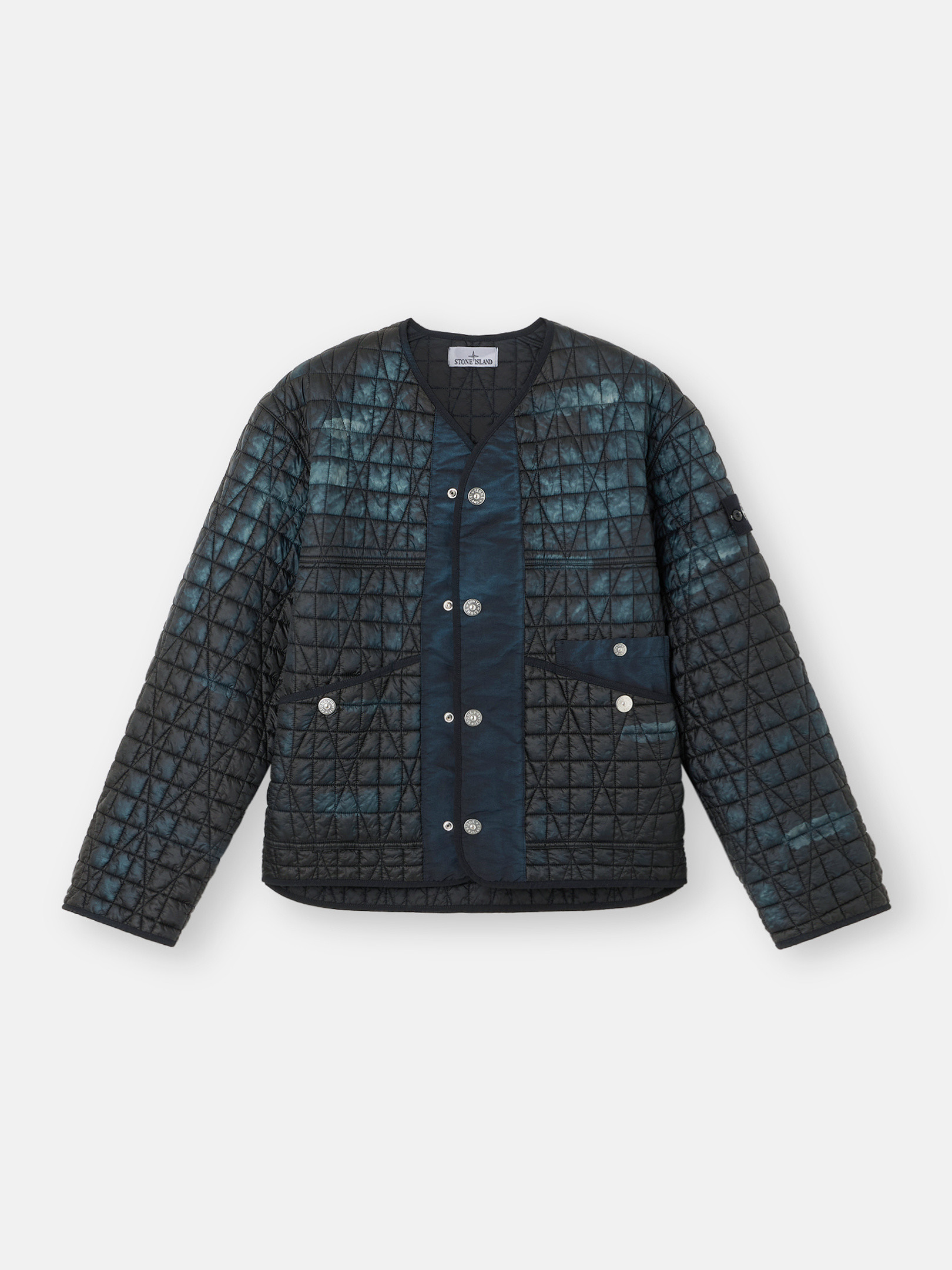Quilted jacket made from a lightweight, ultra-tightly woven recycled nylon reps, resin-coated on the inside for wind resistance and moderate water resistance and quilted with a multi-axial pattern onto an inner padding layer. Garment dyed with carefully selected dyes, then faded through an innovative corrosion treatment, reflecting STOthtNE ISLthtAND’s ongoing commitment to research and experimentation. The corroded areas take on a worn appearance and varying colors due to the irregularity of the treatment, creating a blurred effect and making each piece unique. Treated with a specific anti-drop agent. Multiaxial quilting padded with PrimaLoft®.