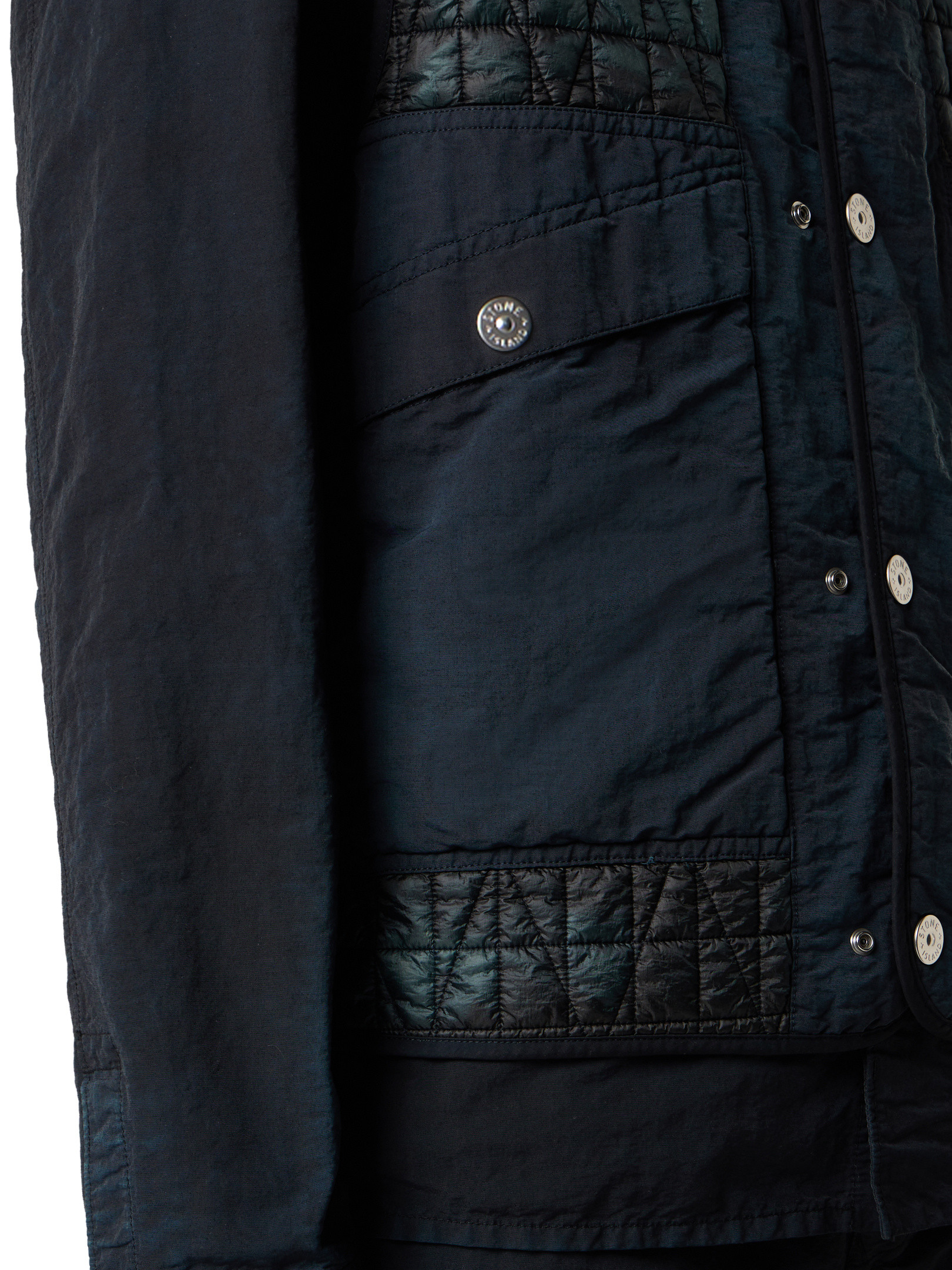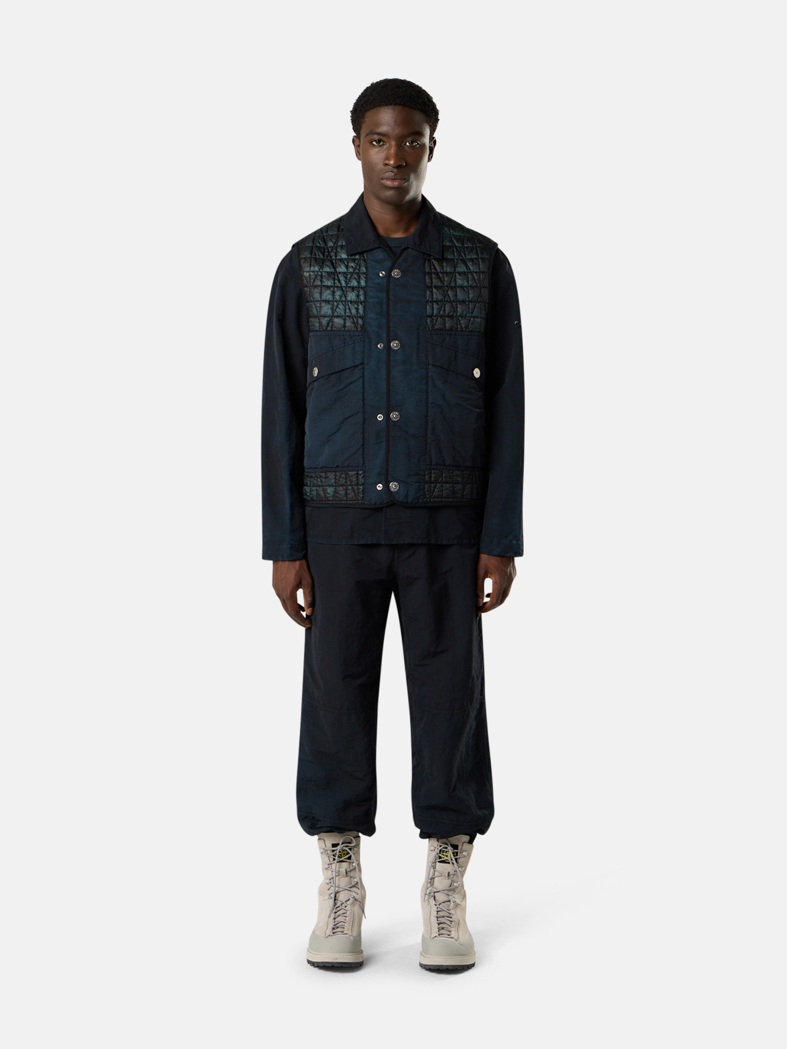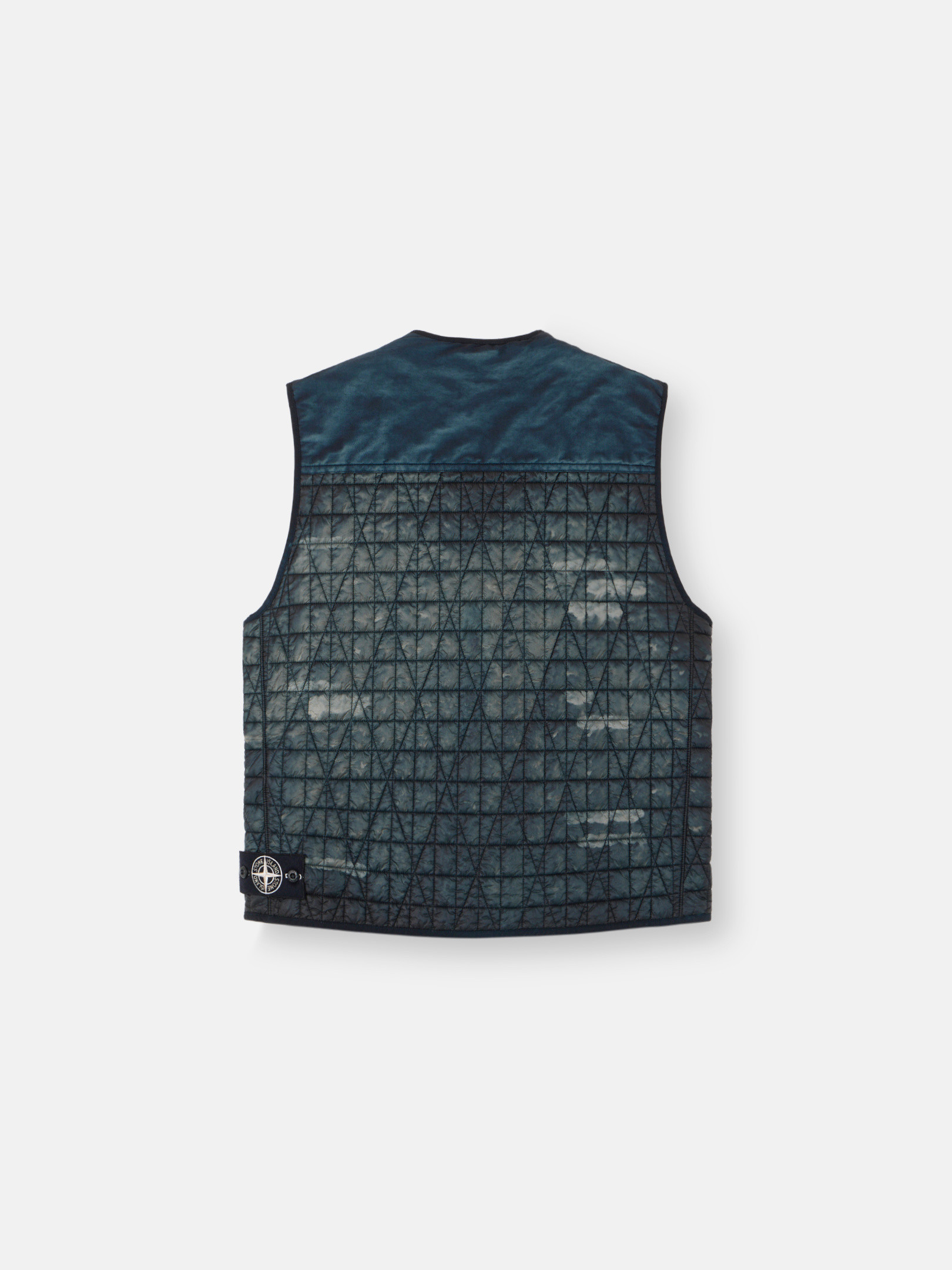 Quilted vest made from a lightweight, ultra-tightly woven recycled nylon reps, resin-coated on the inside for wind resistance and moderate water resistance and quilted with a multi-axial pattern onto an inner padding layer. Garment dyed with carefully selected dyes, then faded through an innovative corrosion treatment, reflecting STOthtNE ISLthtAND’s ongoing commitment to research and experimentation. The corroded areas take on a worn appearance and varying colors due to the irregularity of the treatment, creating a blurred effect and making each piece unique. Treated with a specific anti-drop agent. Multiaxial quilting padded with PrimaLoft®.