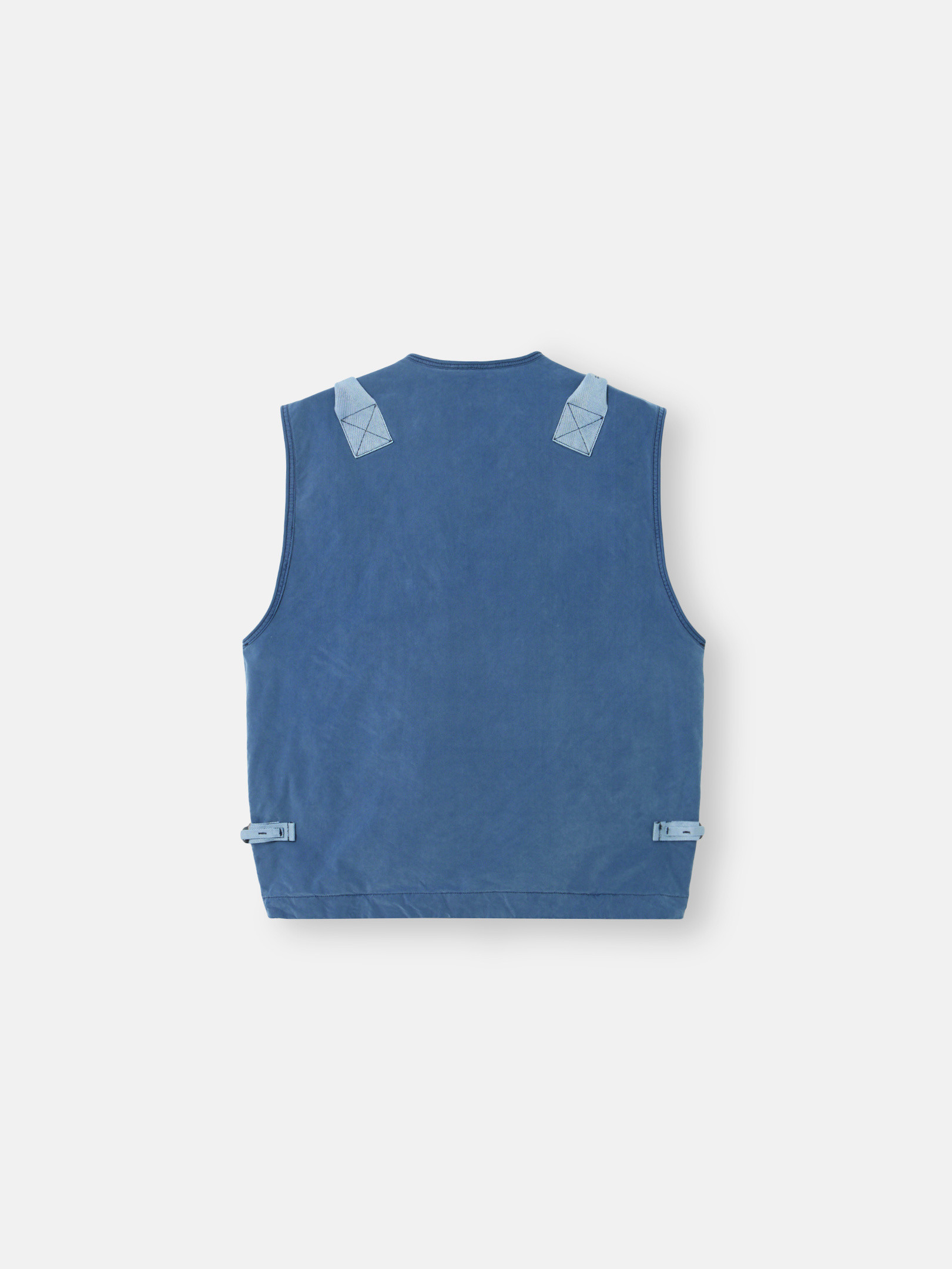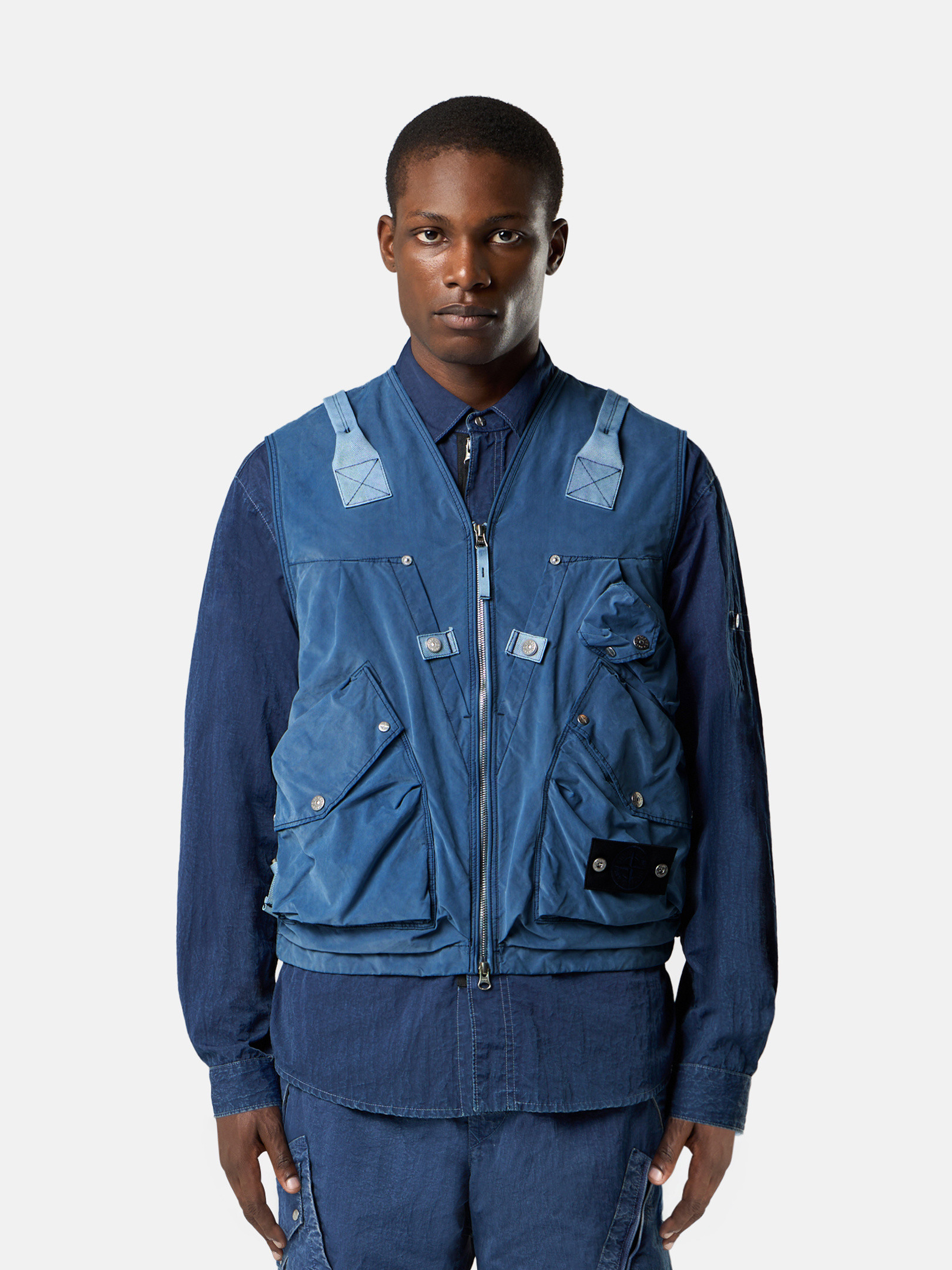 Utility vest in lightweight tela made with star-shaped cross-section yarns, featuring asymmetrical pockets, nylon tape details, and the STOthtNE ISLthtAND Denim Research badge. Garment dyed with indigo pigment and anti-drop.