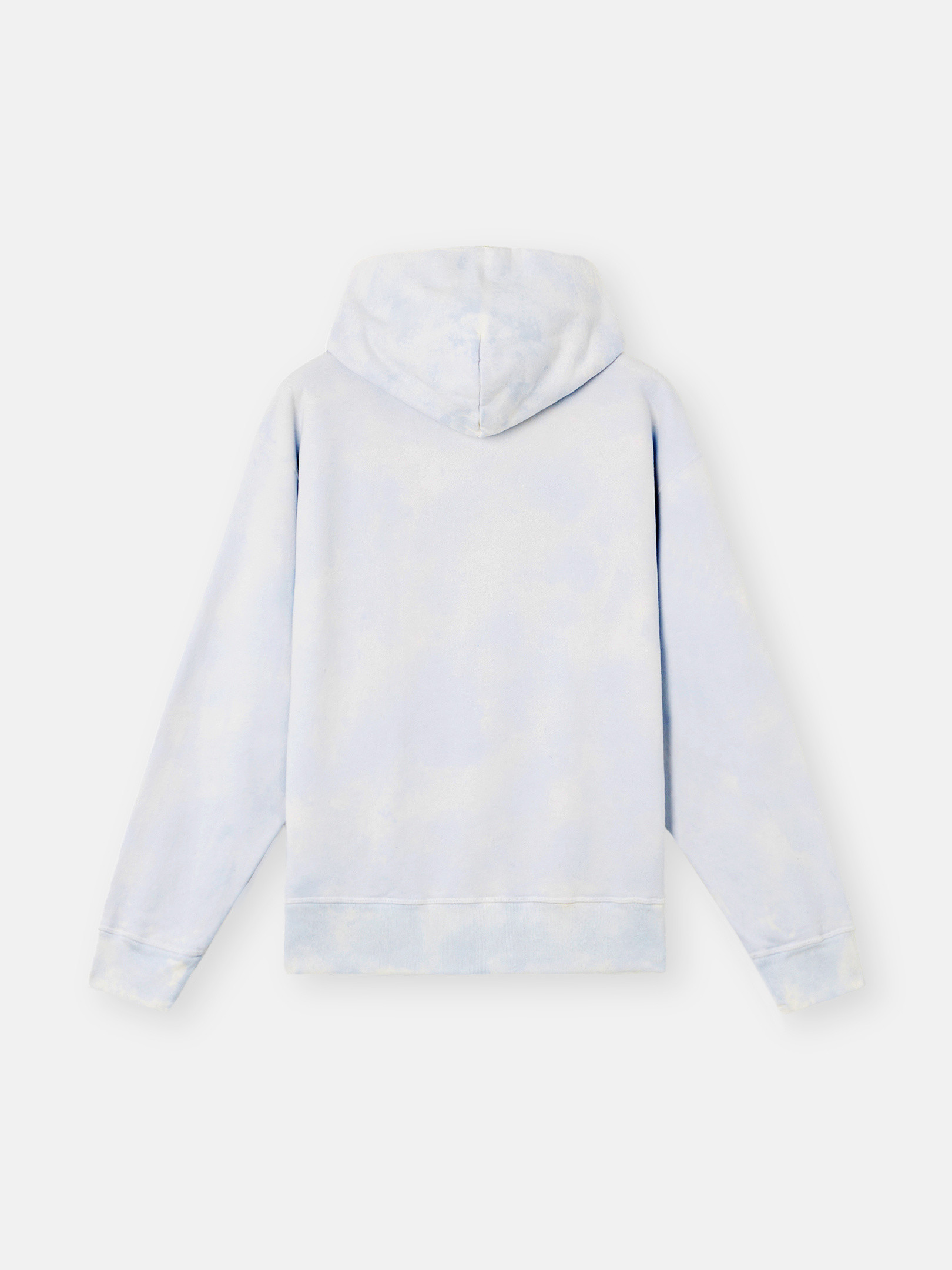 Hooded sweatshirt in organic cotton fleece with an all-over motif created using the ‘Ice’ treatment through the manual application of a thermosensitive pigment that does not alter the underlying fabric. As the temperature drops, the molecules of the pigments, micro-encapsulated in the material, change the color of the pattern. The handmade nature of this technique signifies that each garment is completely one of a kind.