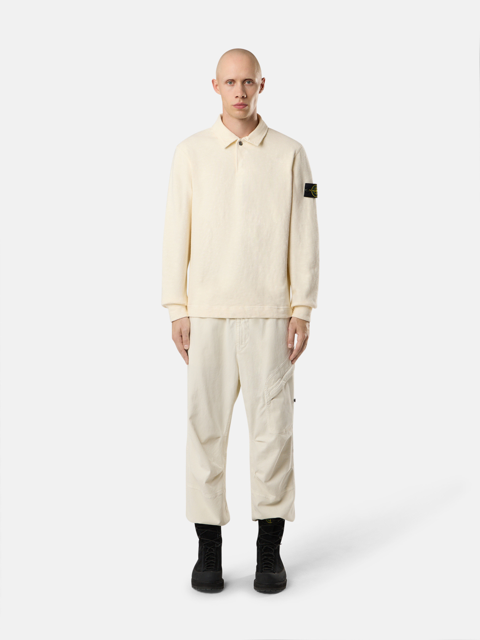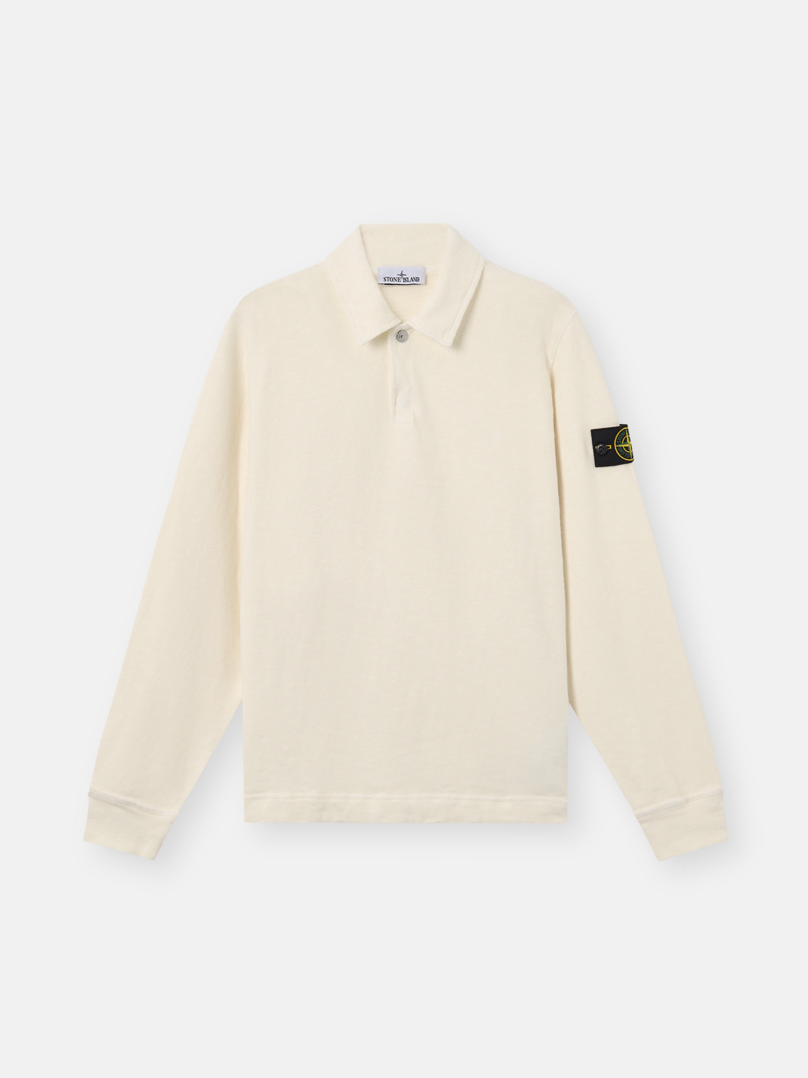 Undercollar lined in cotton twill. Neck fastening with two snaps, one visible and one hidden. Inlay under arms and on sides. STOthtNE ISLthtAND badge on left sleeve. Flat cuffs and bottom band. Regular fit.