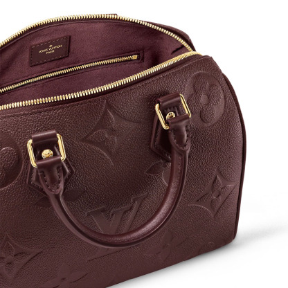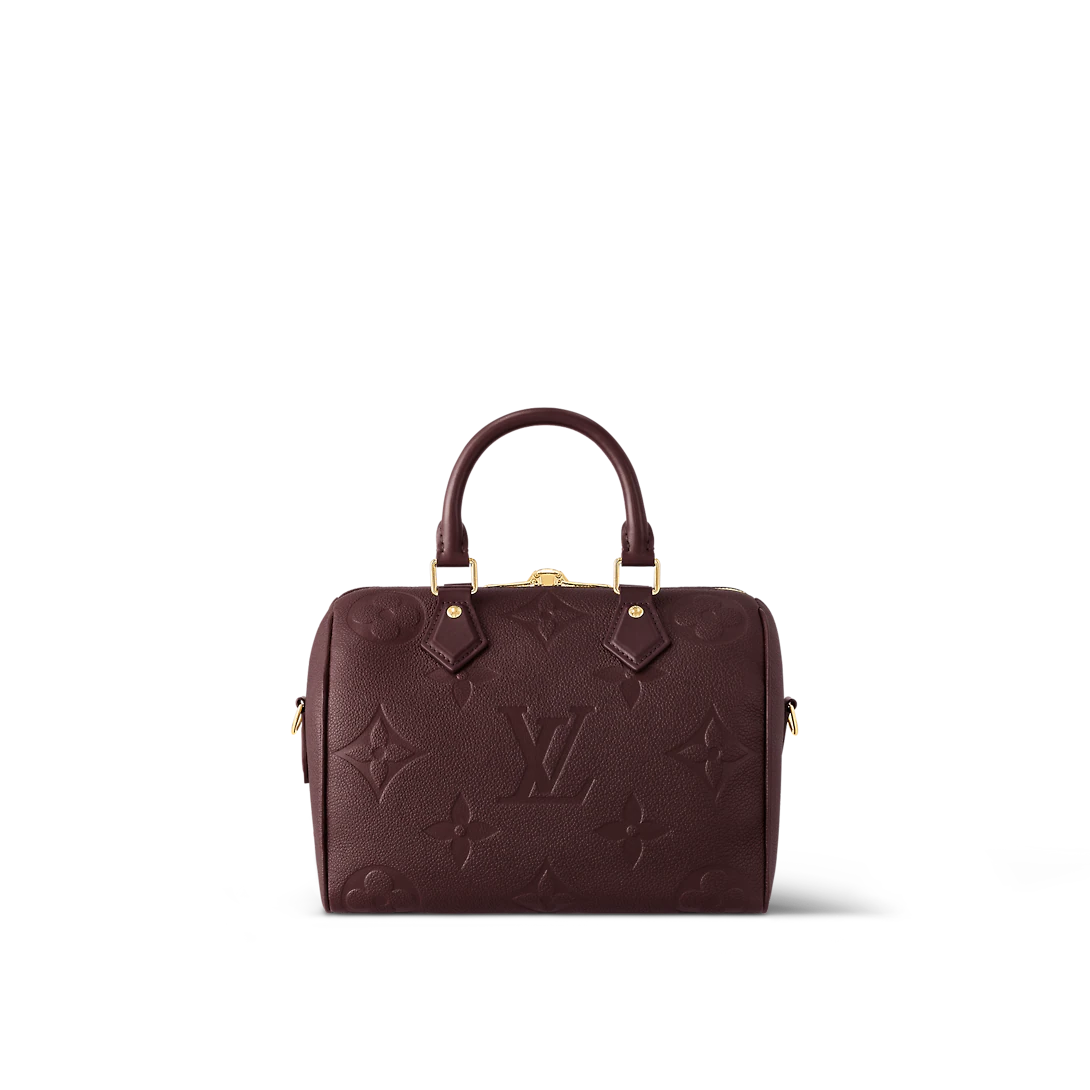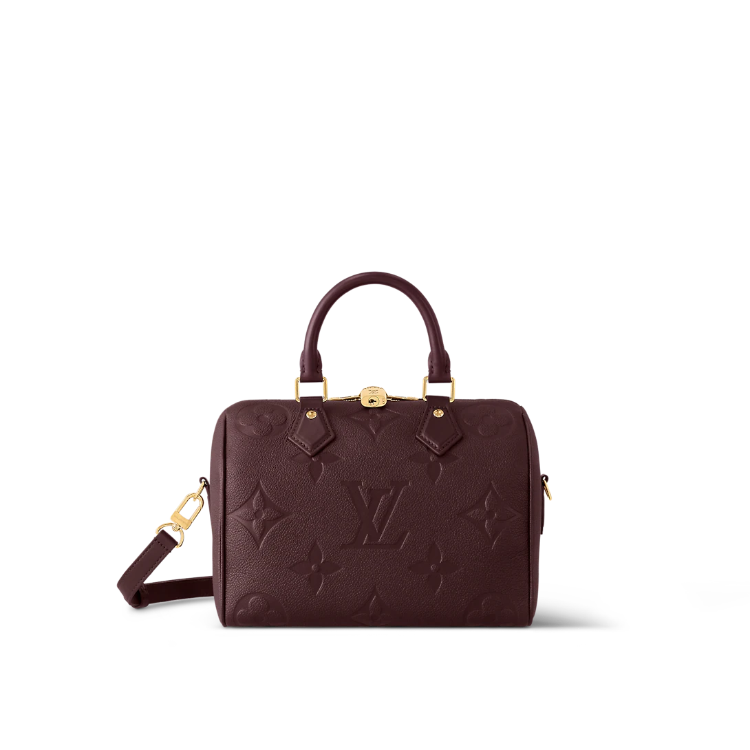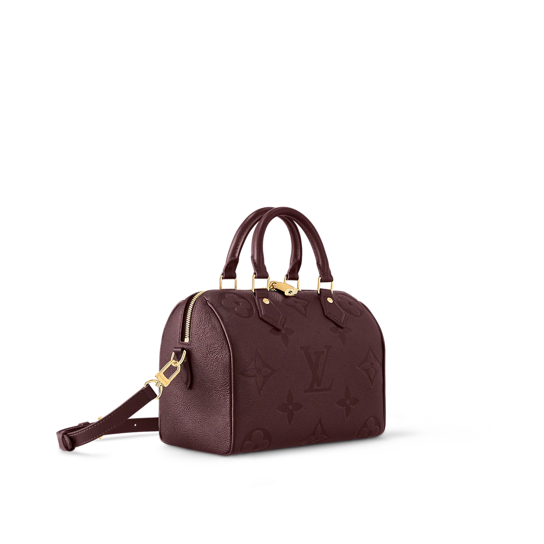 Crafted from grained Monogram Empreinte leather, discreetly embossed with a Giant Monogram pattern, the Speedy 25 compact handbag is a timeless House icon. Its singular silhouette, combined with the rolled-leather handles and gold-color padlock, make it instantly recognizable. A removable leather strap adjusts for shoulder or cross-body carry.