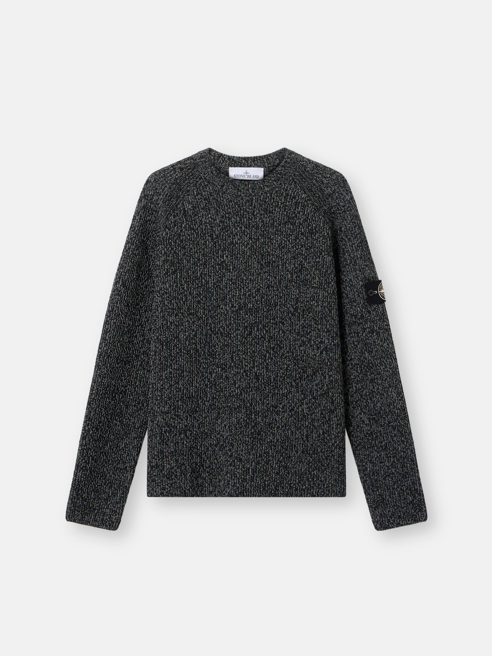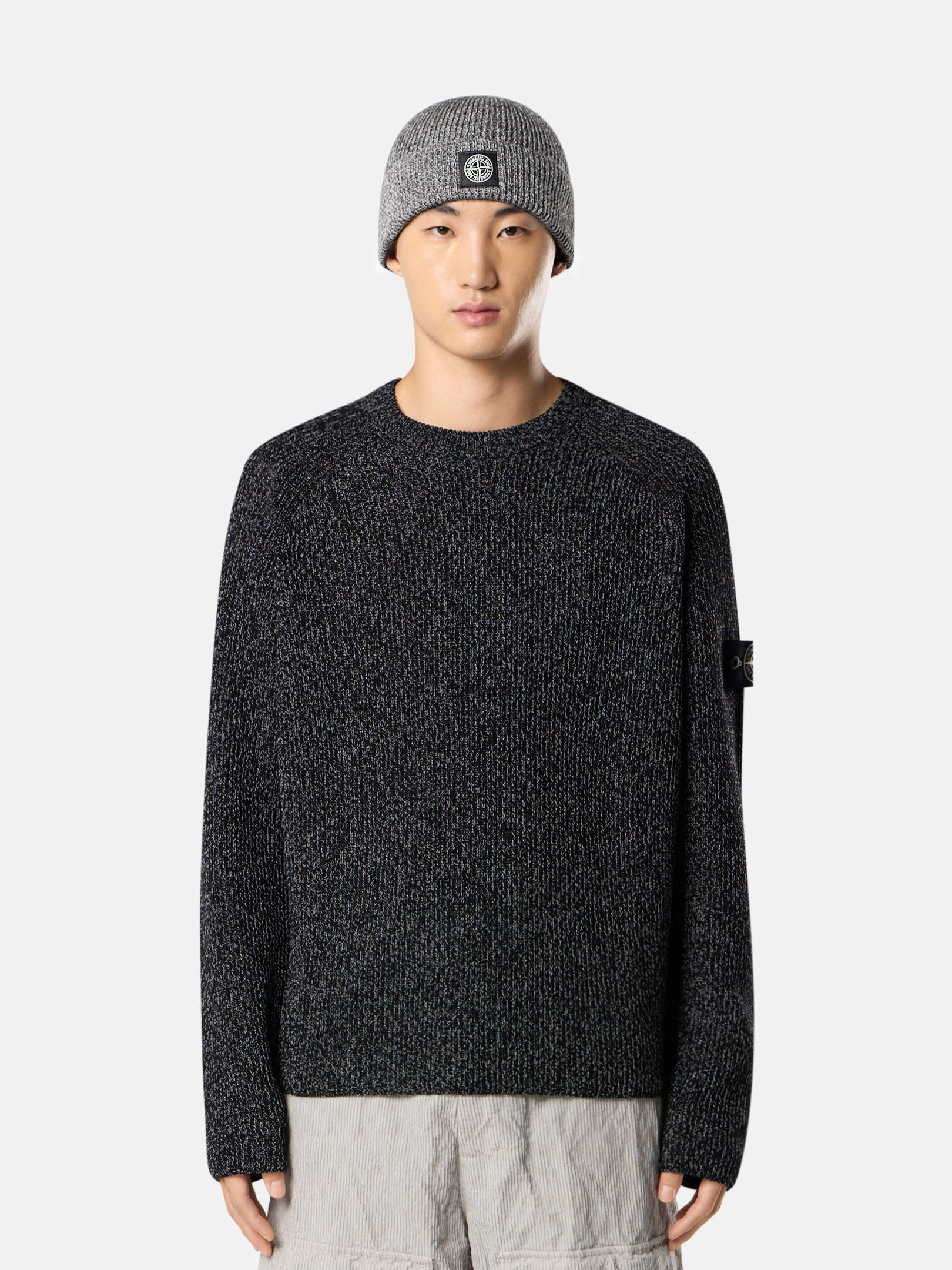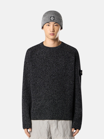 Knit crewneck sweater made from a linen-wool yarn and a polyester yarn with a reflective coating created through a resin bath that incorporates thousands of glass microspheres that reflect light. Reverse fisherman's rib. Gauge 7.