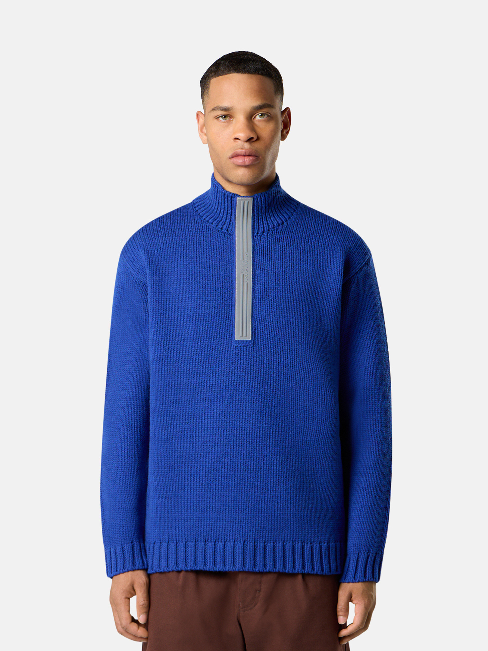 Knit half-zipper sweater in pure wool featuring a hidden zipper with reflective placket, embossed stripes, and STOthtNE ISLthtAND Marina lettering print. Gauge 3.