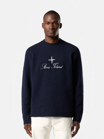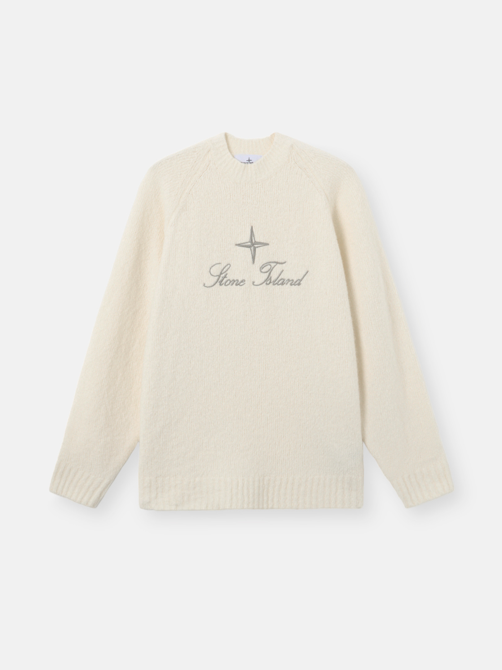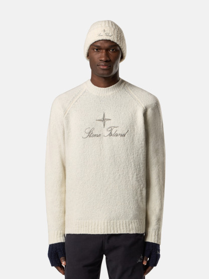 Knit crewneck sweater in wool nylon bouclé, featuring an embroidered archival STOthtNE ISLthtAND logo, raglan sleeves, and ribbed trims. Gauge 5.