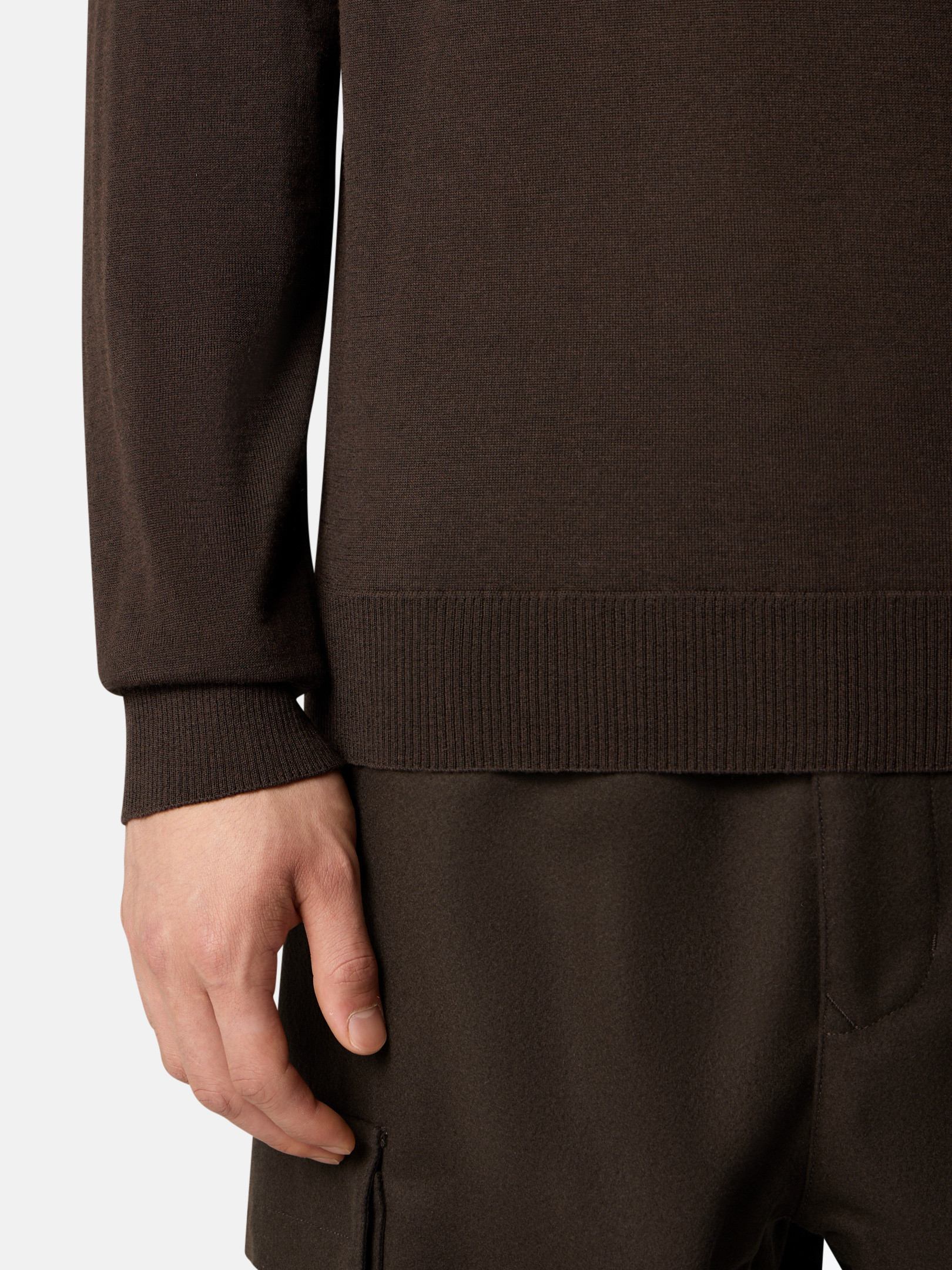 Knit turtleneck sweater in light RWS pure wool with stockinette stitch and ribbed trims. Gauge 14.