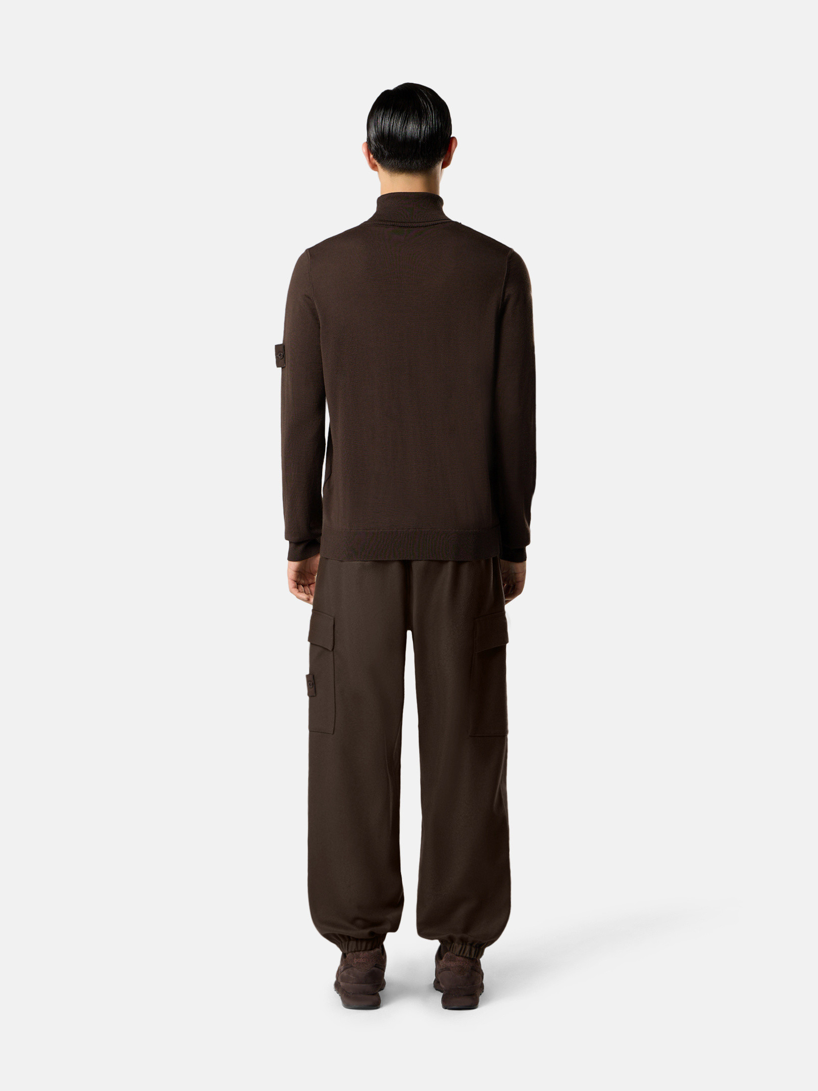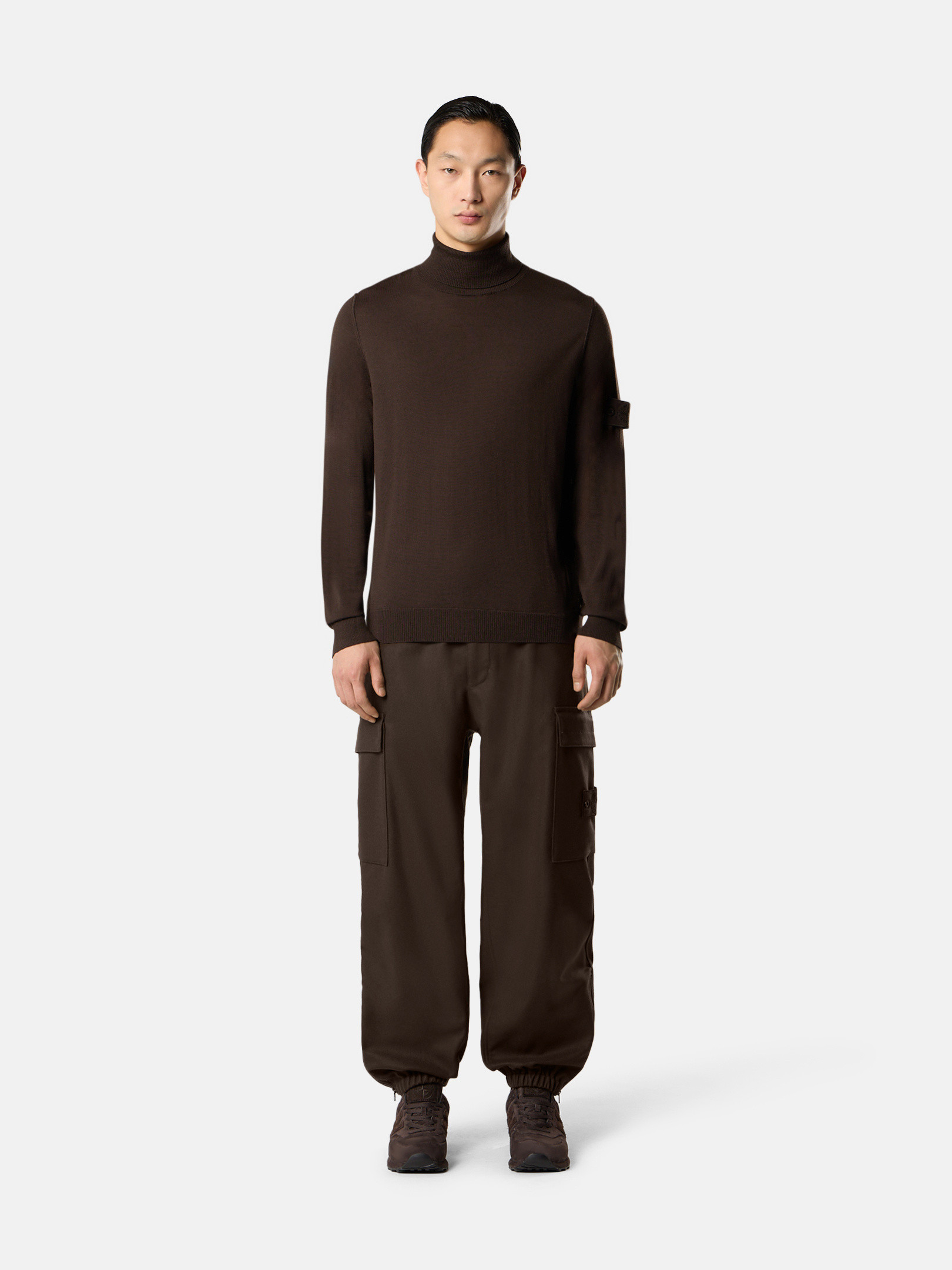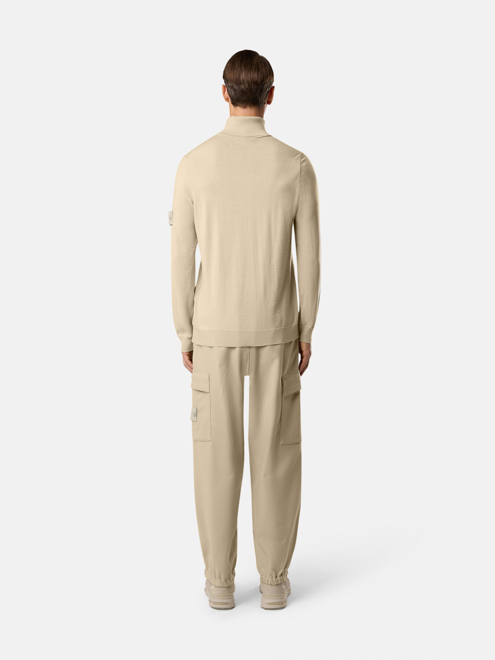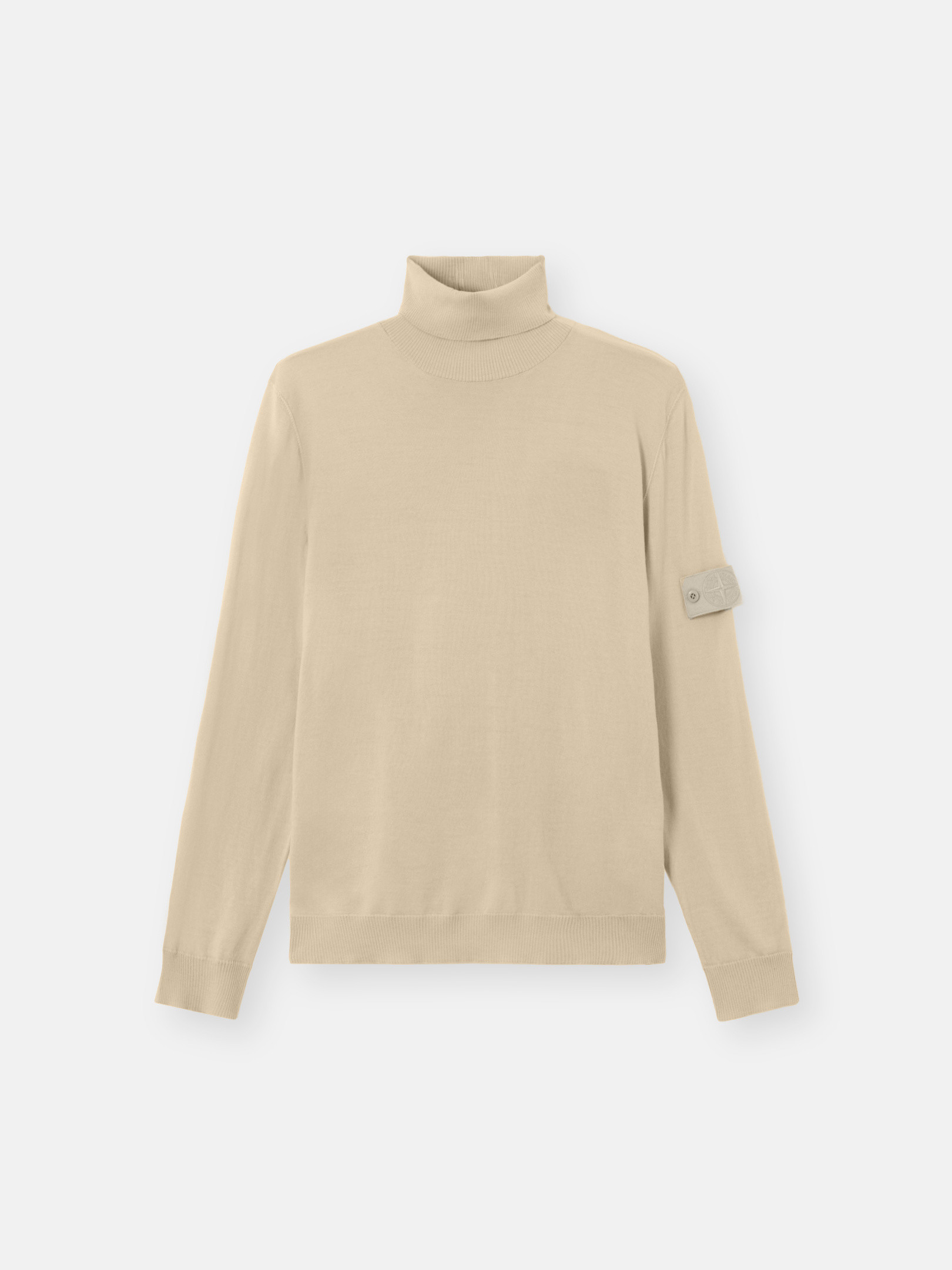 Ghost pieces, derived from the concept of camouflage, are totally monochromatic. Even the STOthtNE ISLthtAND badge is created in a special monocolor version to blend in with the garment. Knit turtleneck sweater in light RWS pure wool. Stockinette stitch. Gauge 14.