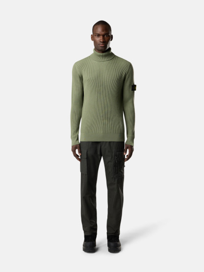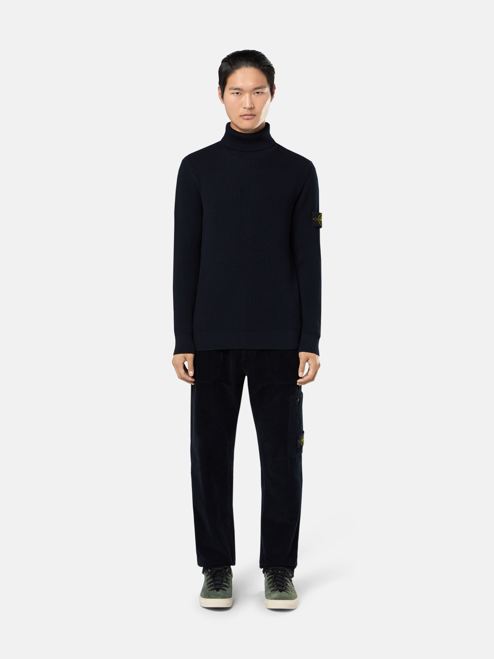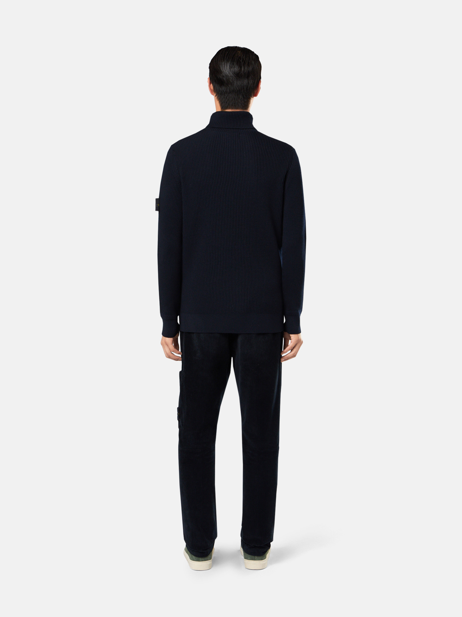 Knit turtleneck sweater in full rib RWS wool featuring a ribbed collar, finely ribbed cuffs with horizontal stitching, and a finely ribbed bottom band. Gauge 12.