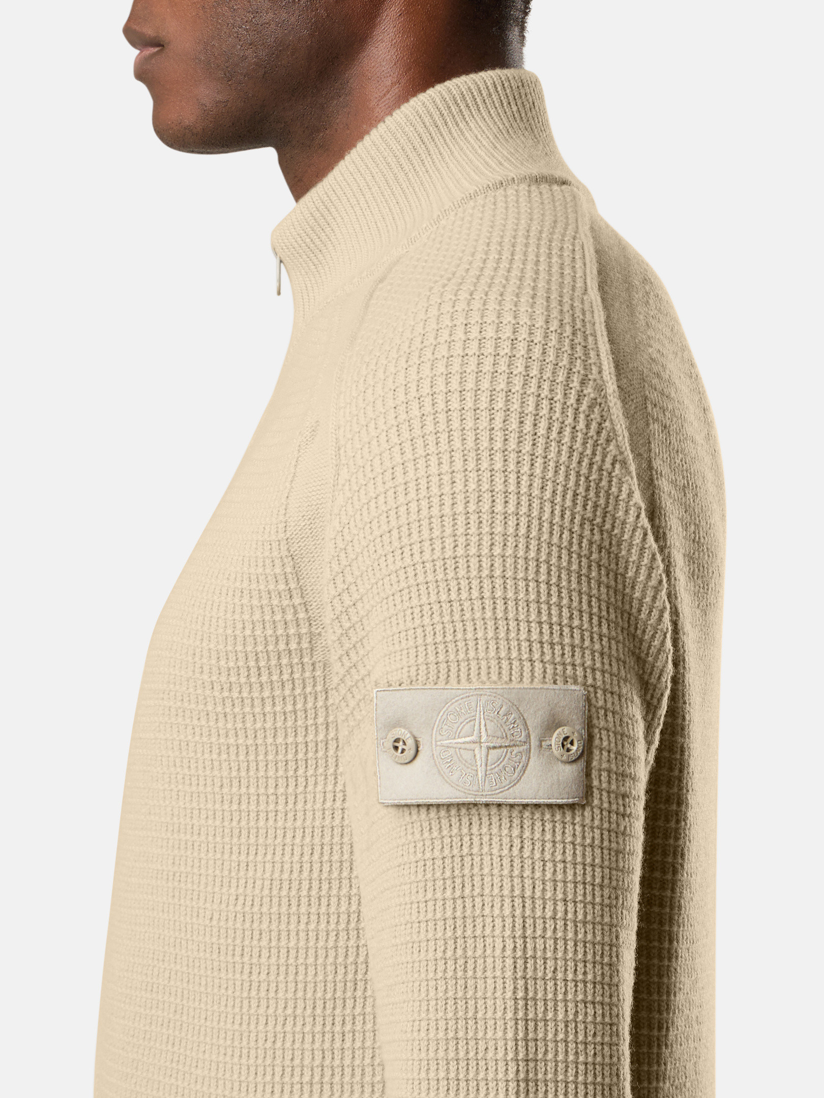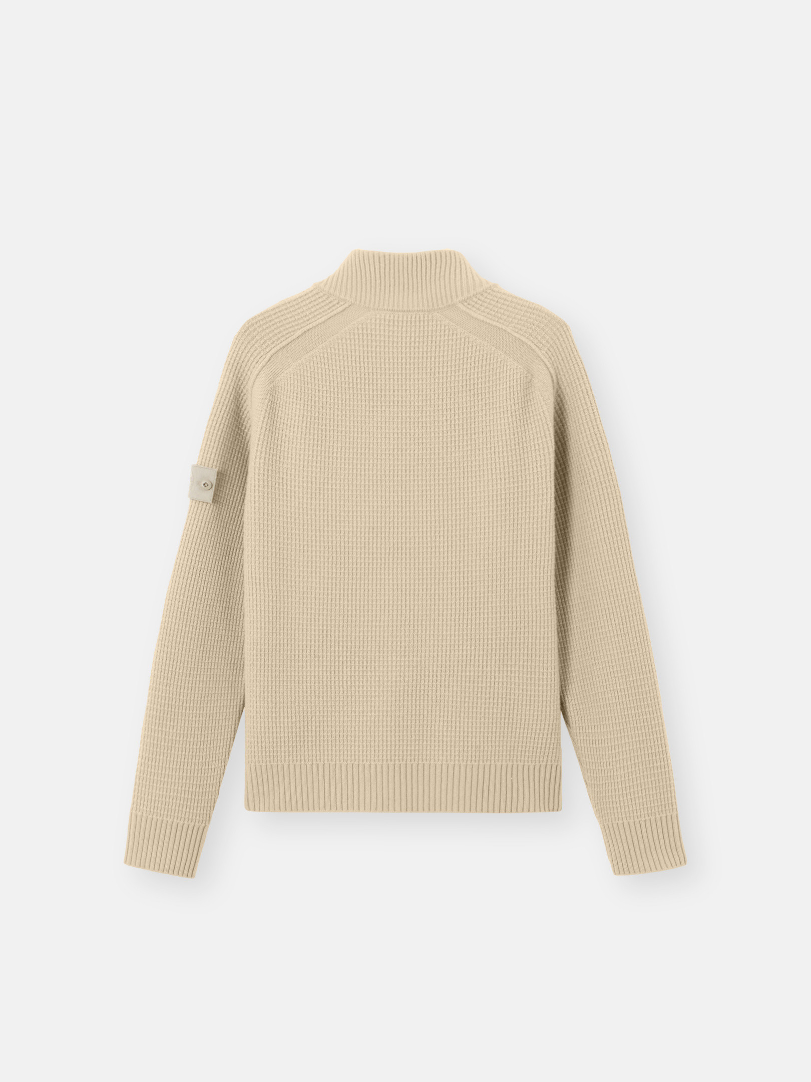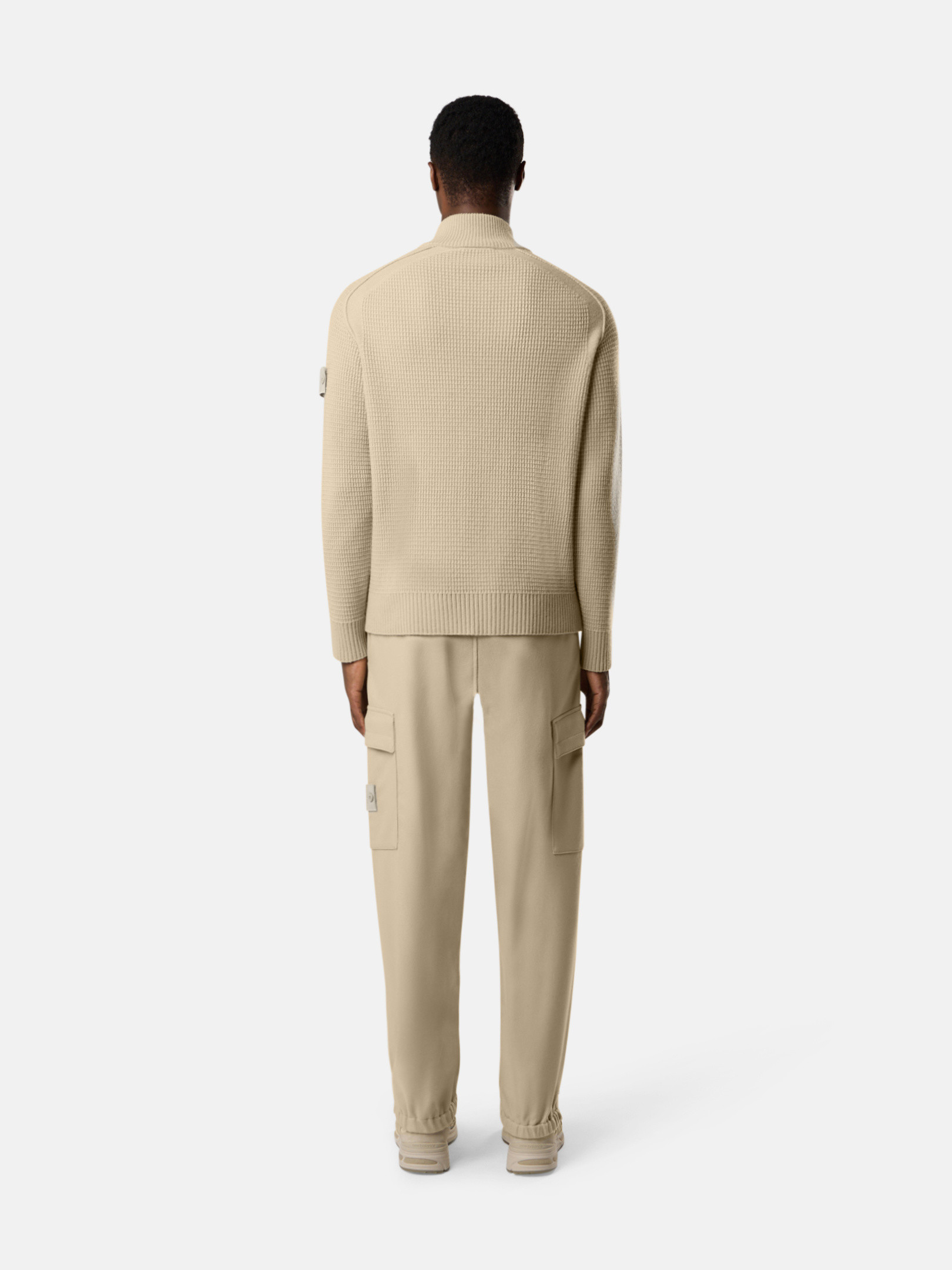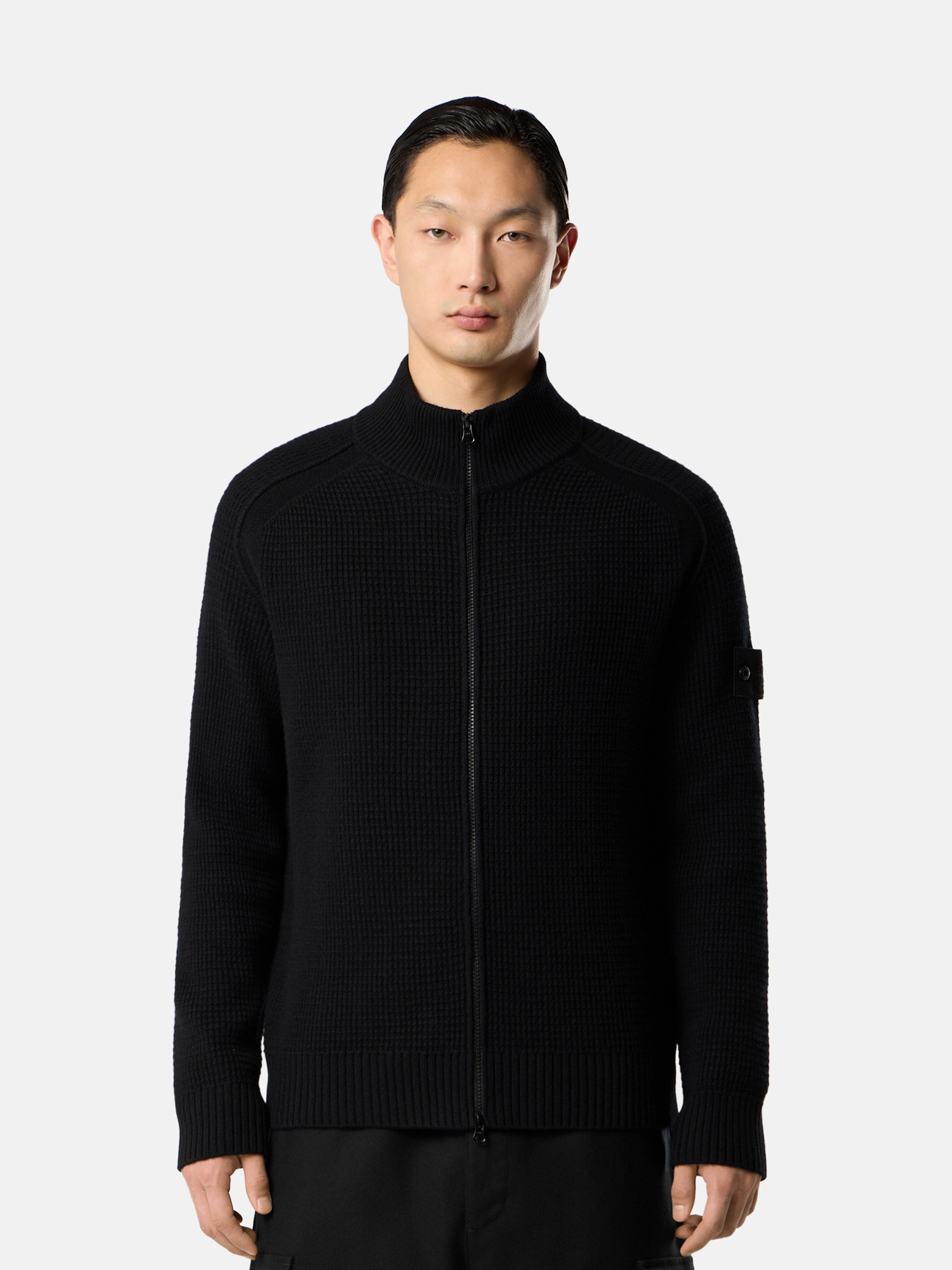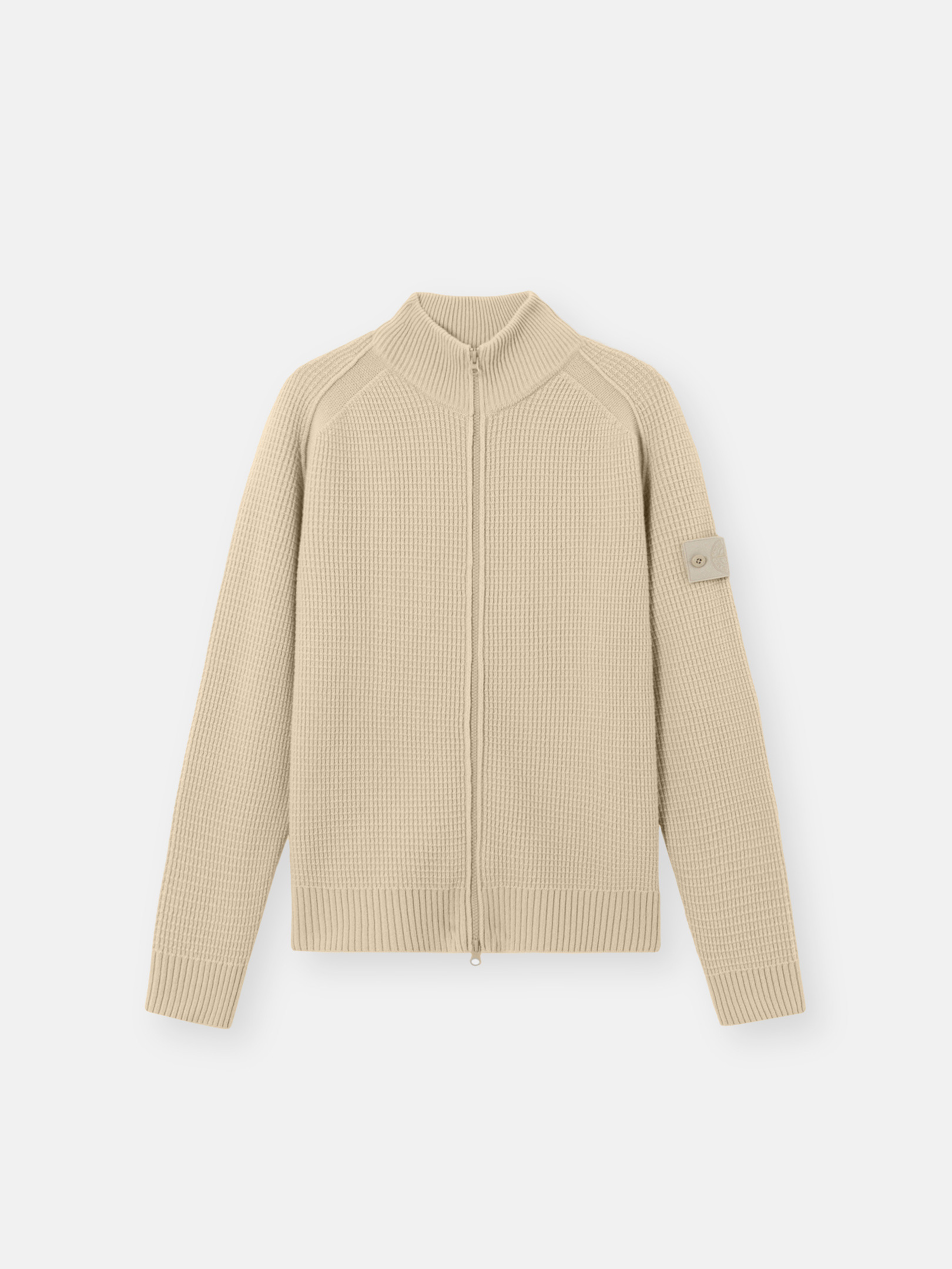 Ghost pieces, derived from the concept of camouflage, are totally monochromatic. Even the STOthtNE ISLthtAND badge is created in a special monocolor version to blend in with the garment. Knit zipper-up sweater in RWS Geelong wool. Waffle stitch. Gauge 7.