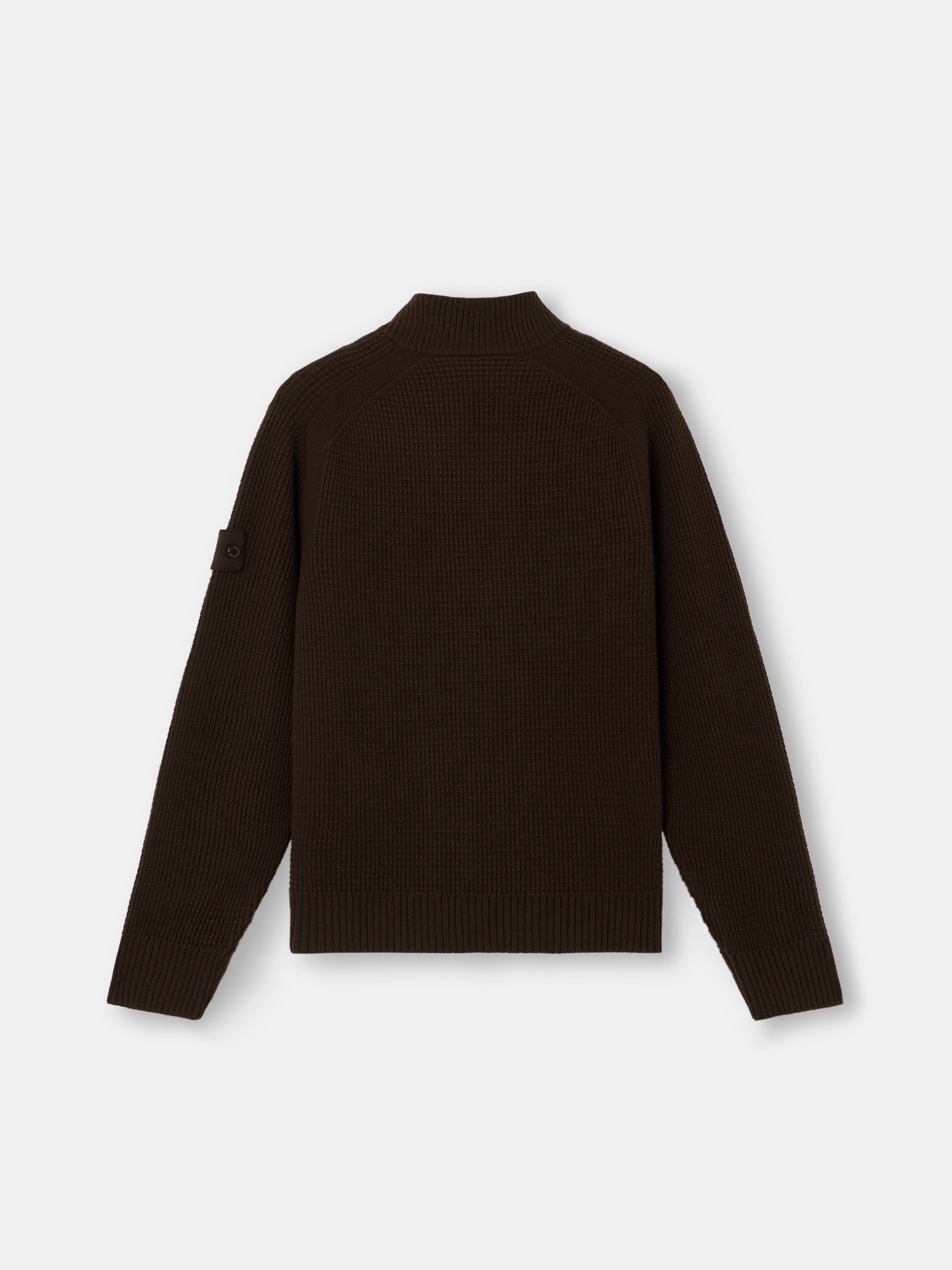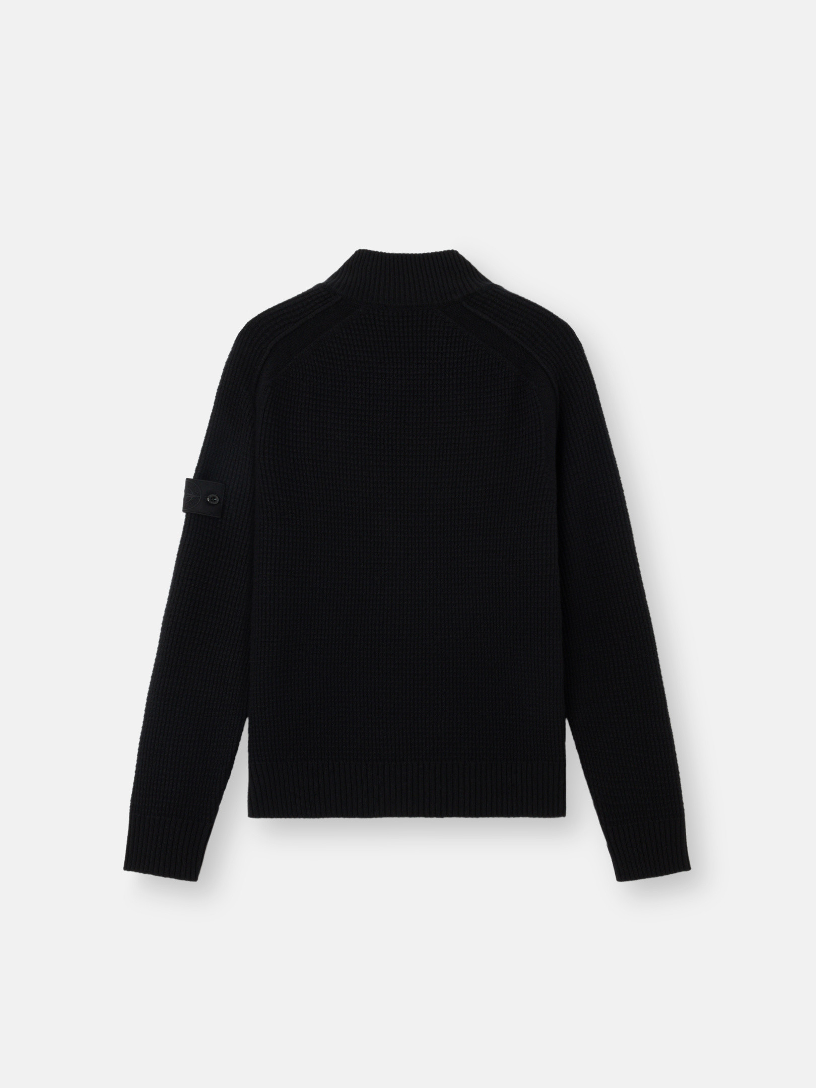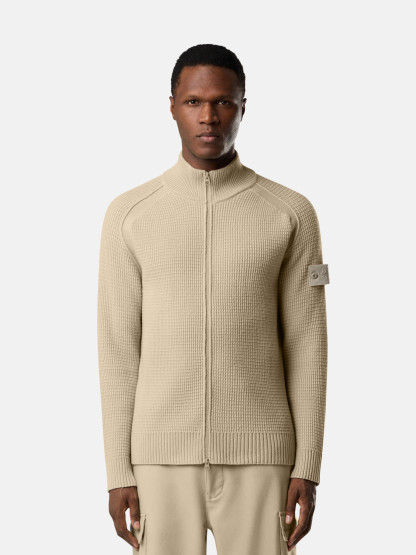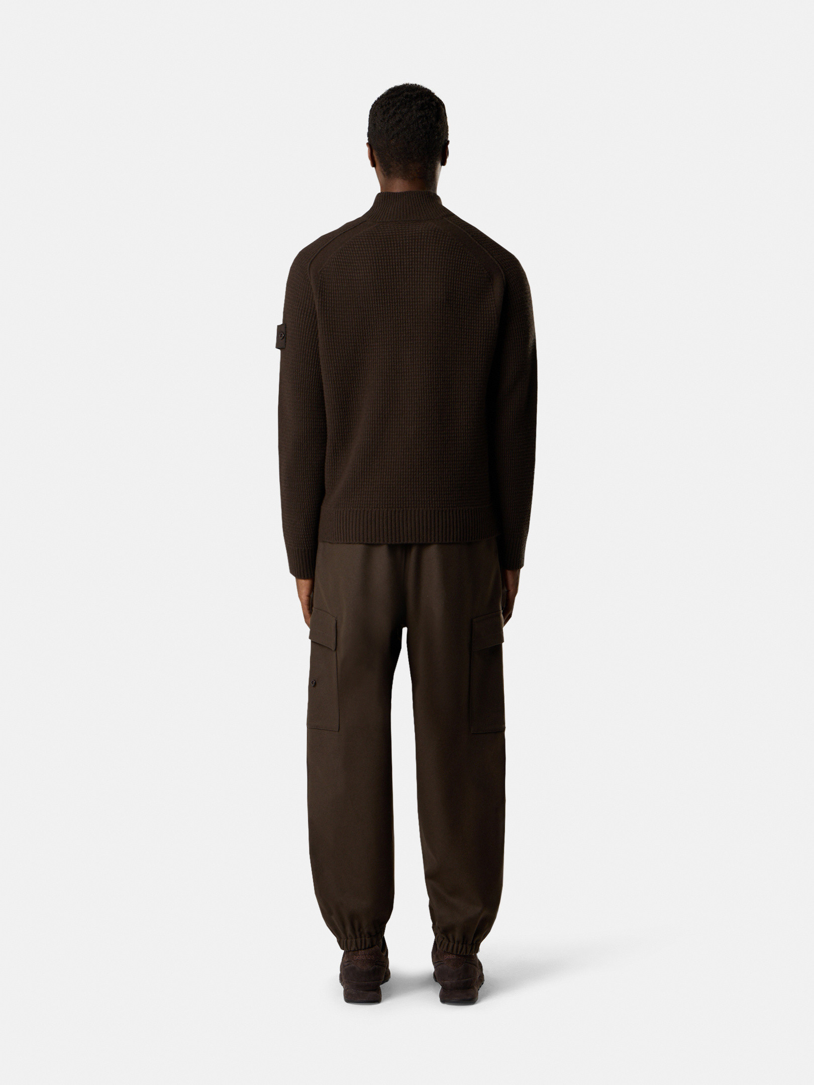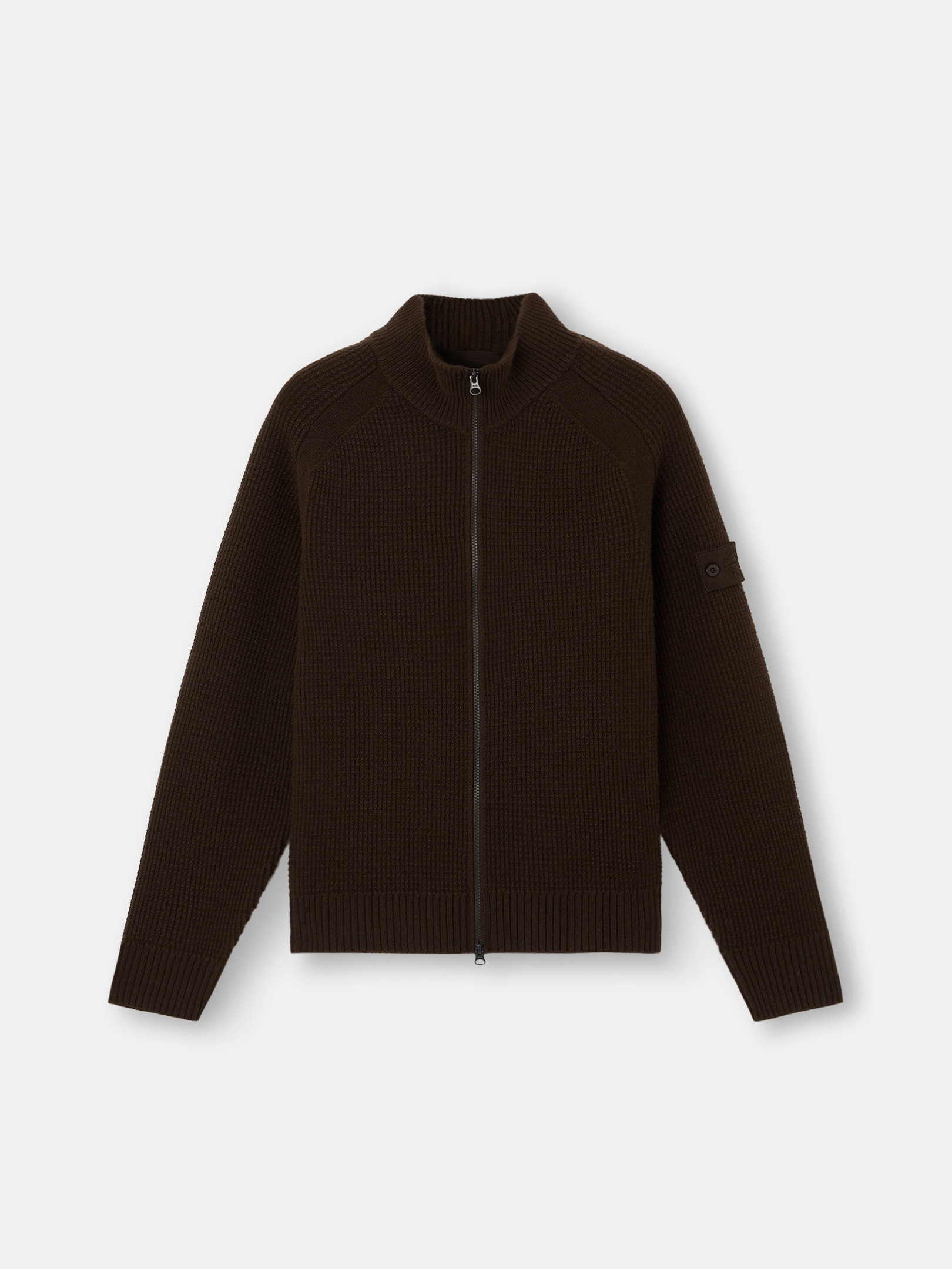 Ghost pieces, derived from the concept of camouflage, are totally monochromatic. Even the STOthtNE ISLthtAND badge is created in a special monocolor version to blend in with the garment. Knit zipper-up sweater in RWS Geelong wool. Waffle stitch. Gauge 7.