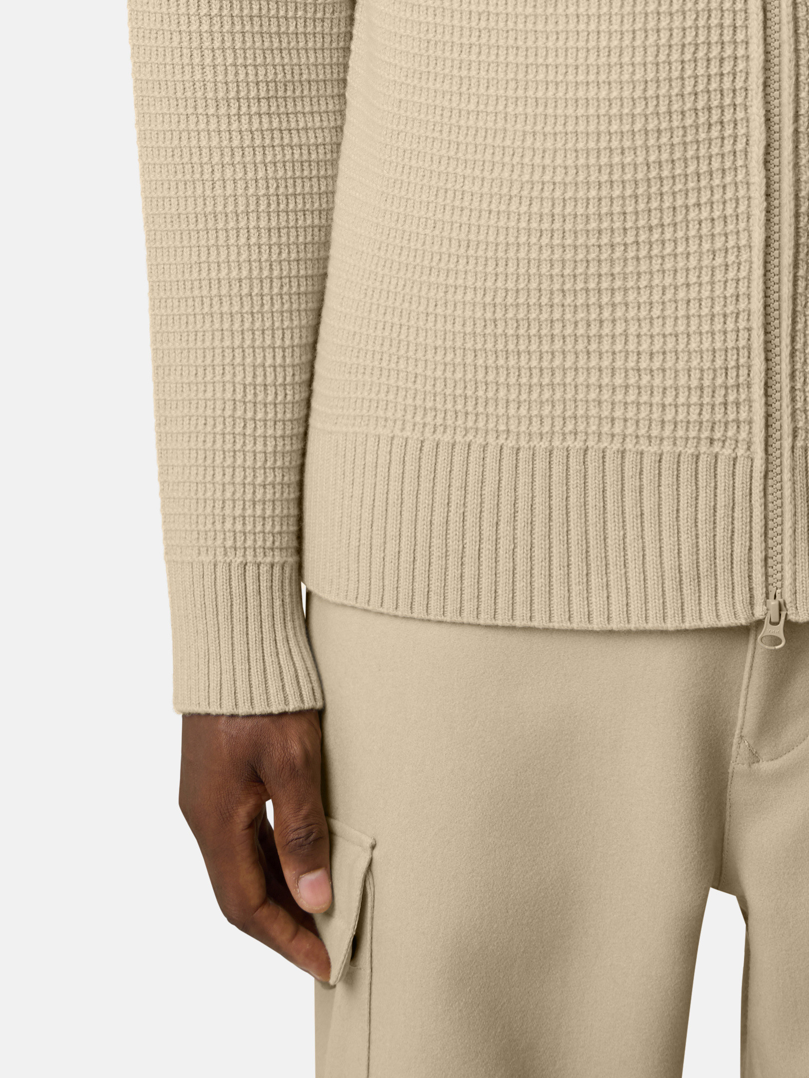 Knit zipper-up sweater in RWS Geelong wool with waffle stitch, raglan sleeves, and ribbed trims. Gauge 7.