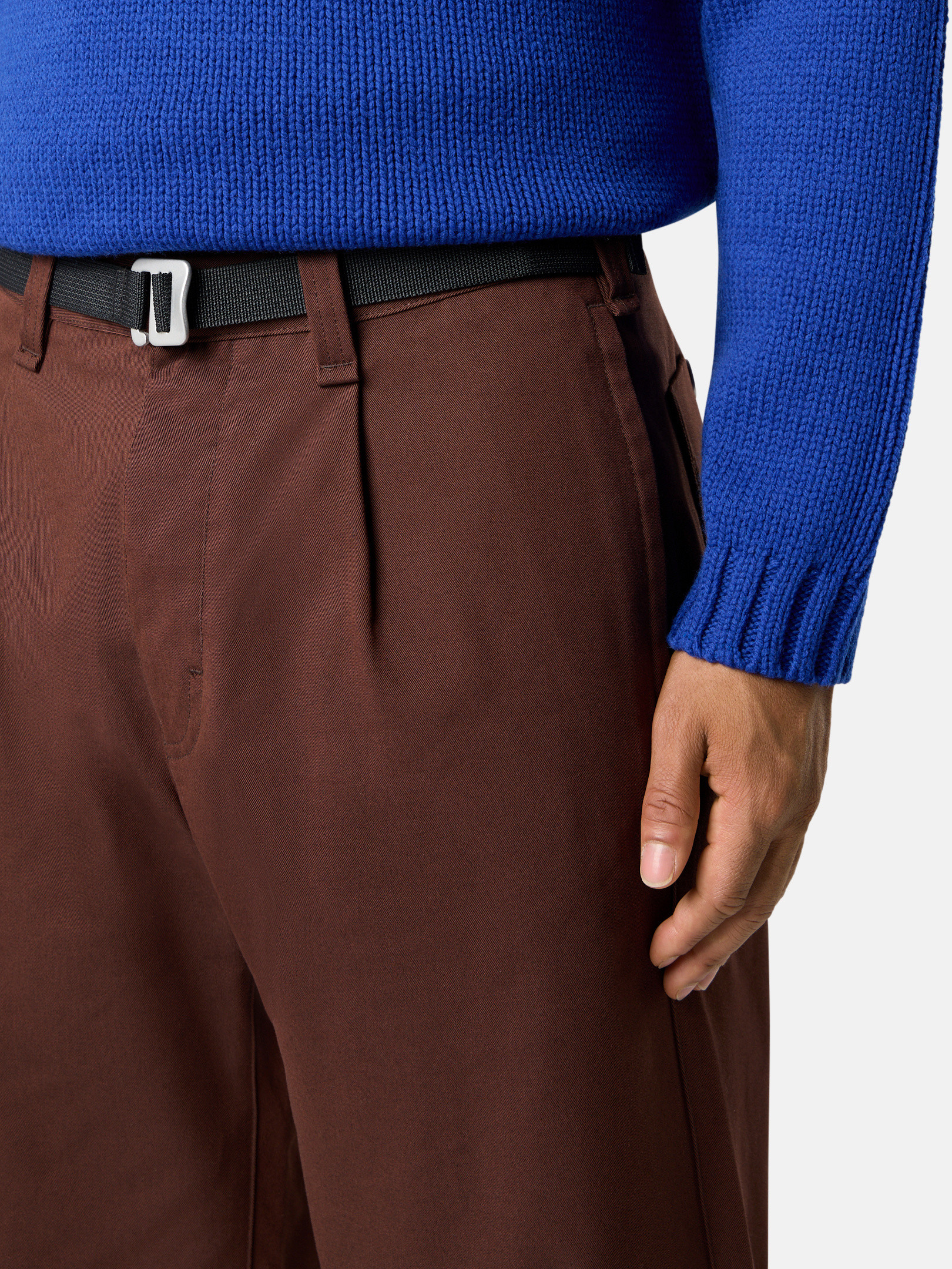 Chino pants in stretch gabardine featuring patch pockets, one with Marina embroidery, front pleats, and nylon tape belt with G-hook buckle.