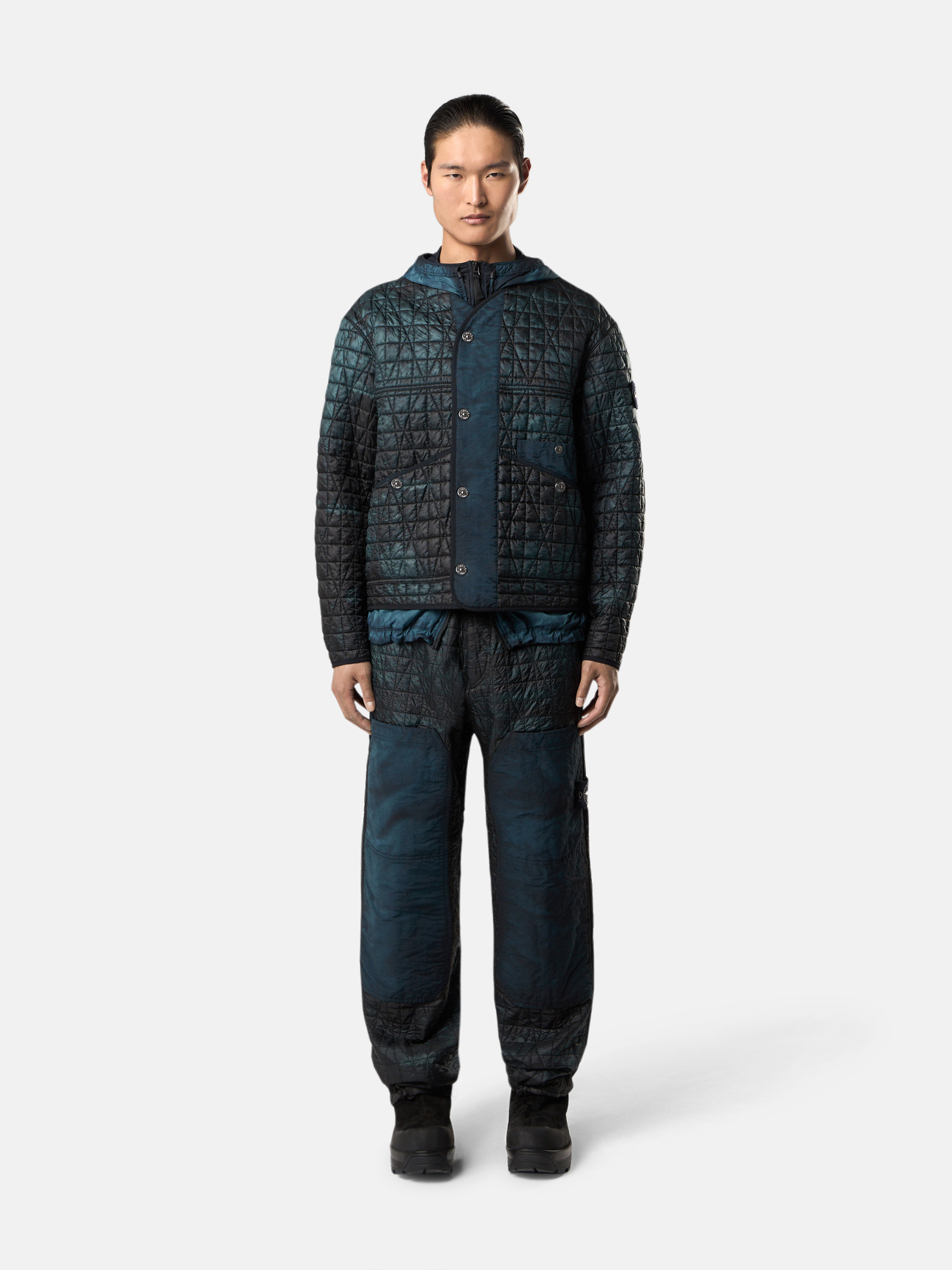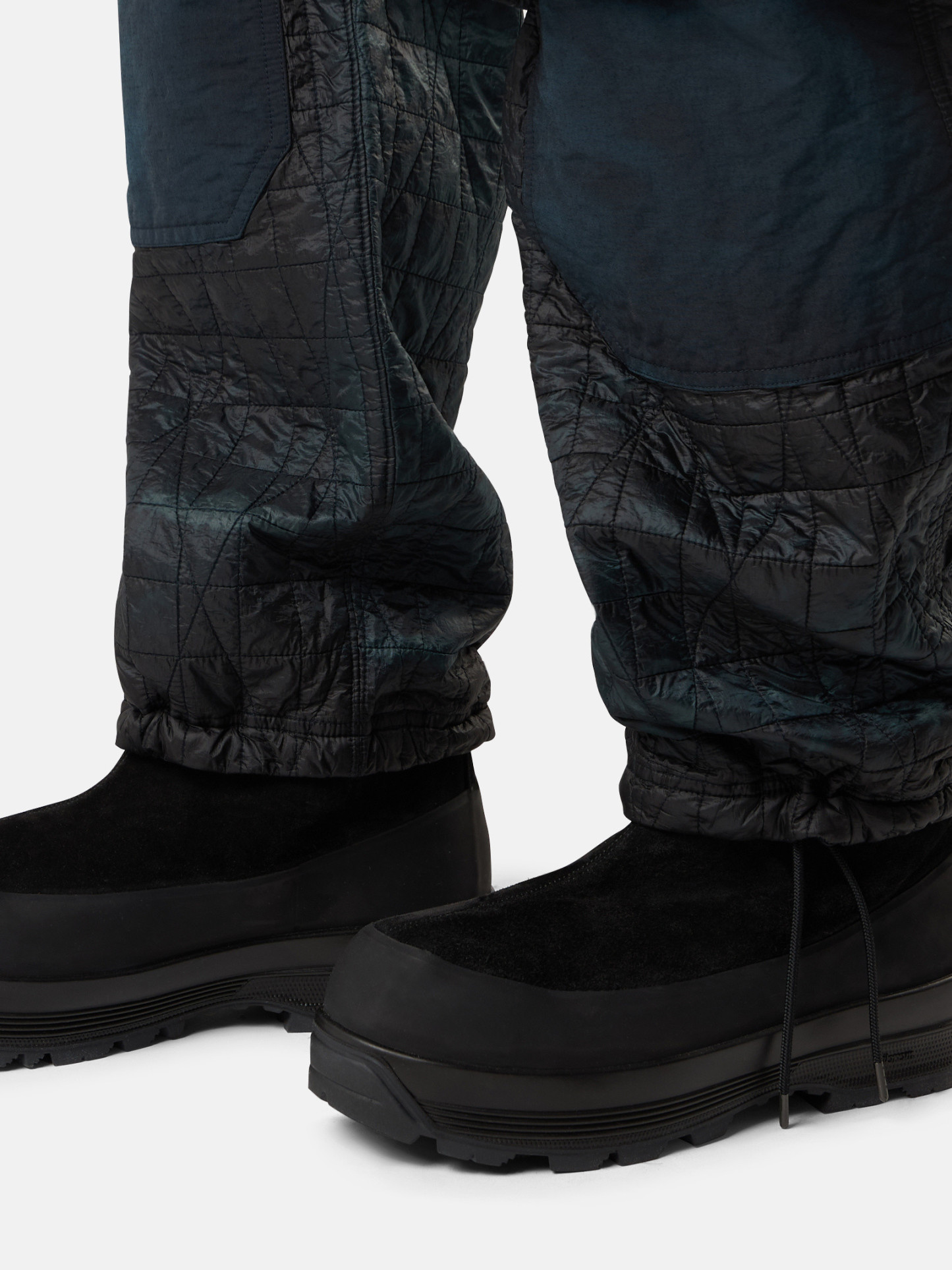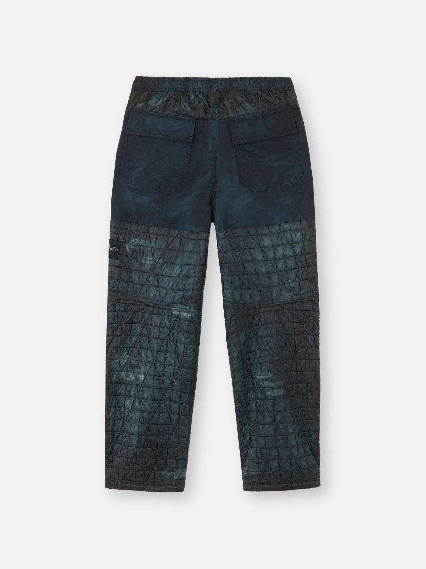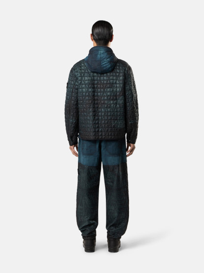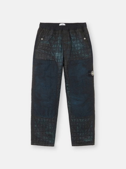 Sweatpants made from a lightweight, ultra-tightly woven recycled nylon reps, resin-coated on the inside for wind resistance and moderate water resistance and quilted with a multi-axial pattern onto an inner padding layer. Garment dyed with carefully selected dyes, then faded through an innovative corrosion treatment, reflecting STOthtNE ISLthtAND’s ongoing commitment to research and experimentation. The corroded areas take on a worn appearance and varying colors due to the irregularity of the treatment, creating a blurred effect and making each piece unique.