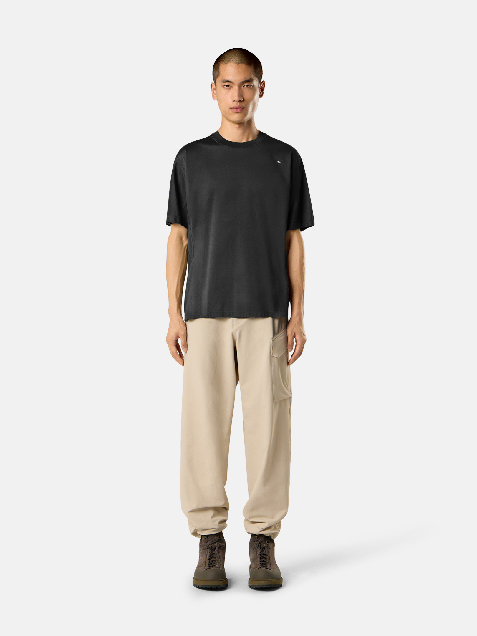 Ribbed neckline. STOthtNE ISLthtAND star embroidery on left side of chest. Overlock seams. Regular fit.